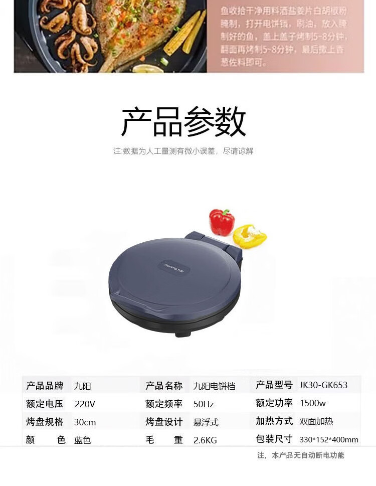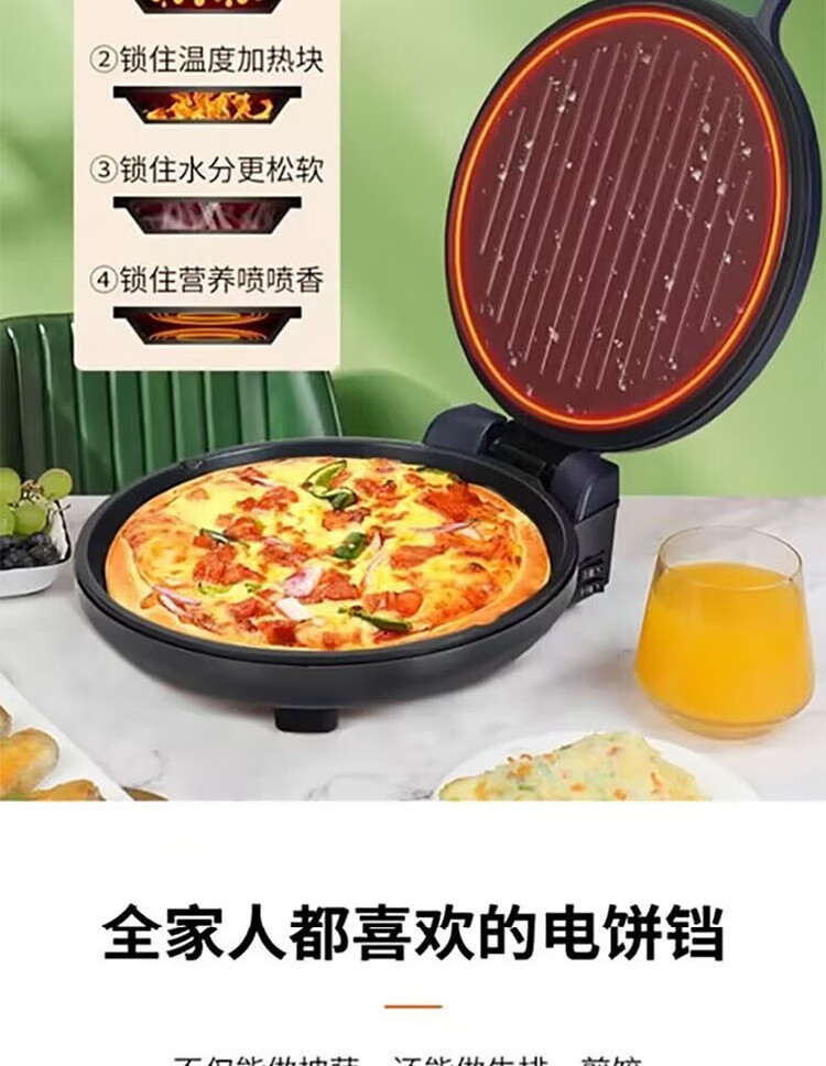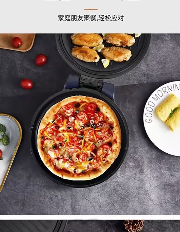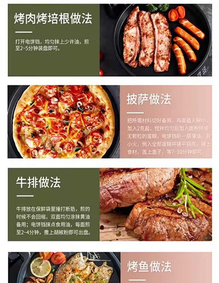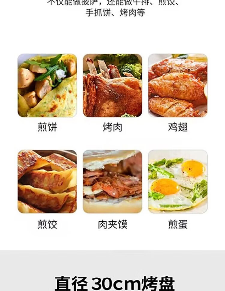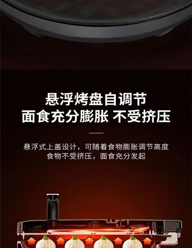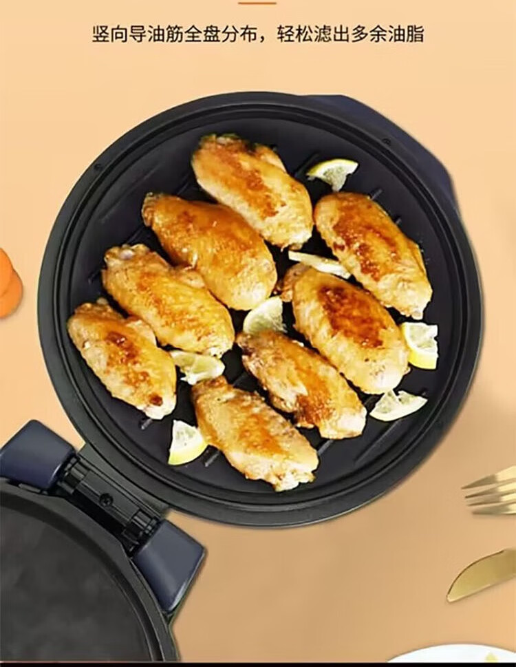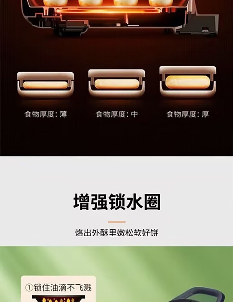 上下双盘,双面加热;聚能烤盘,均匀发热;180度伸展,双面煎烤;无烟不粘锅,耐刮耐磨耐酸碱,易清洁,污渍不残留;煎饼、鸡翅、花生米、烧烤均可