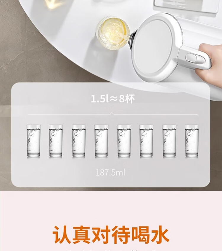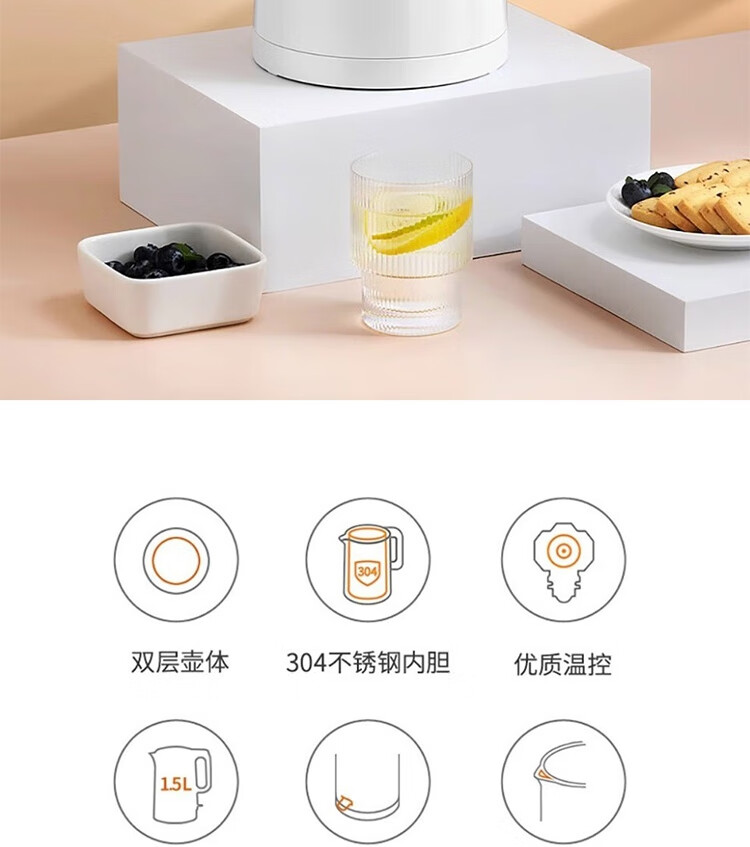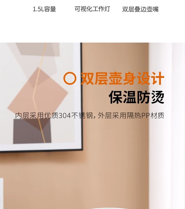 1.5L大容量 全家饮用;304不锈钢内胆 健康易洁 ;双层壶体 保温防烫