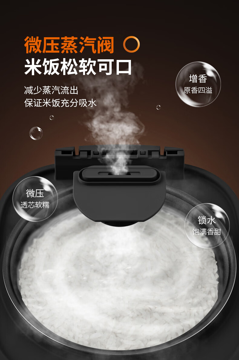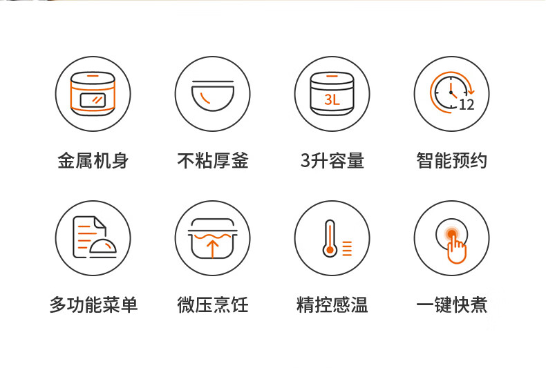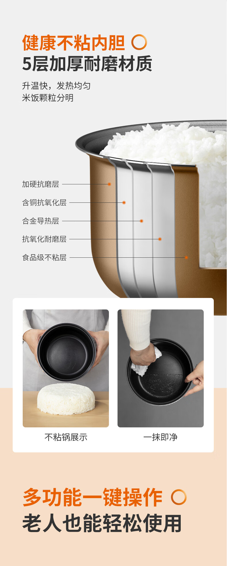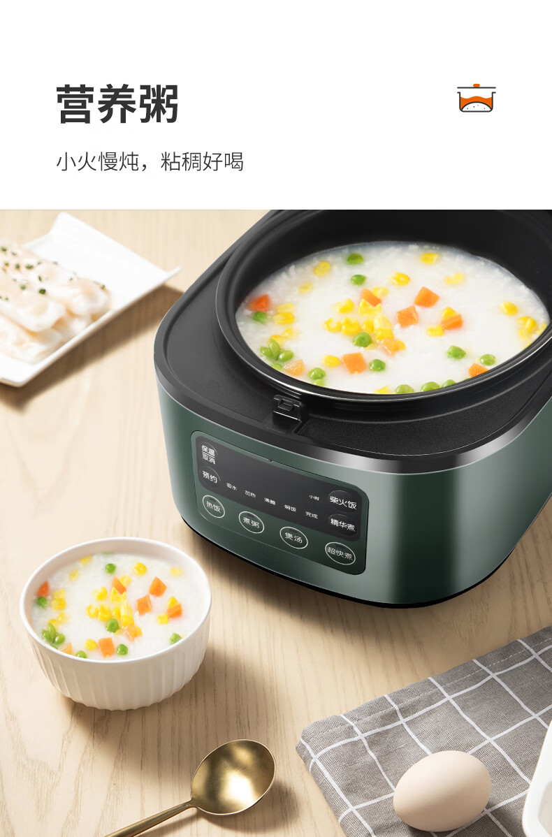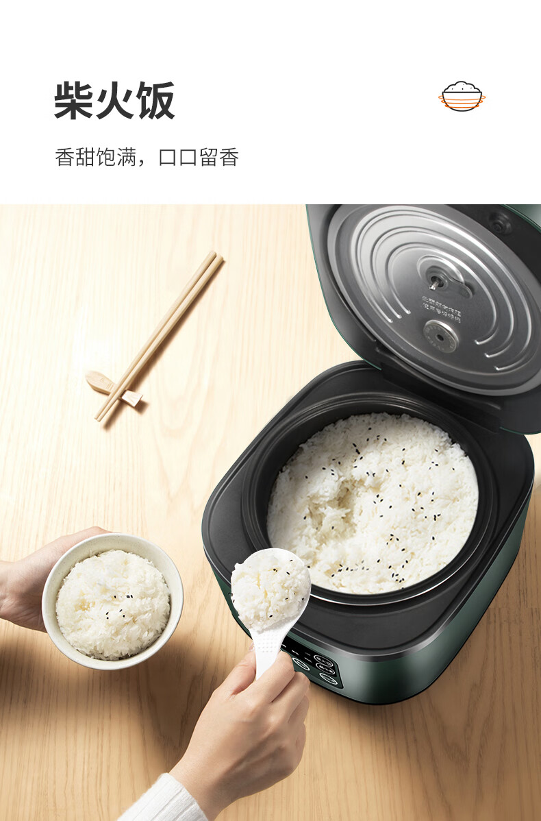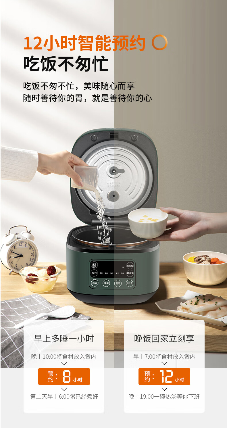 3L家用容量满足1-5人使用;12小时智能预约吃饭不匆忙吃饭不匆不忙,美味随心而;5层加厚耐磨材质,升温快,发热均匀米饭颗粒分明