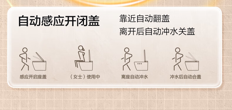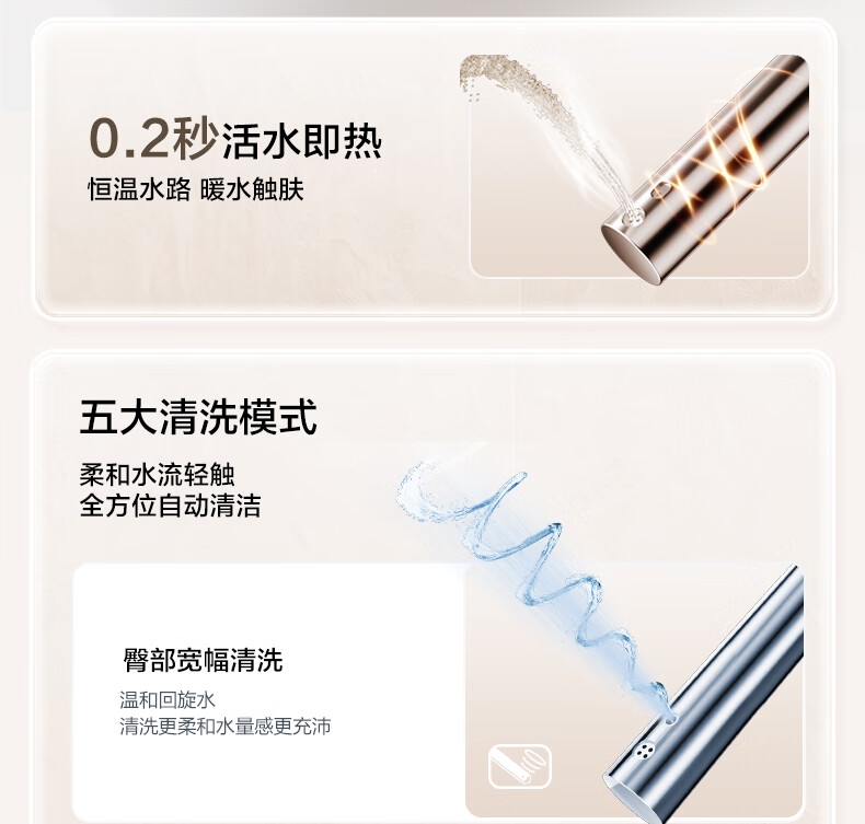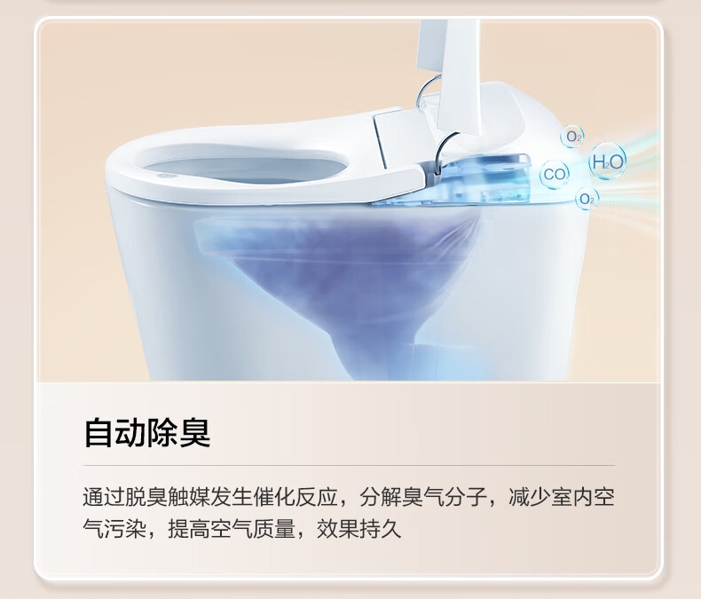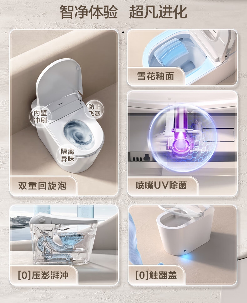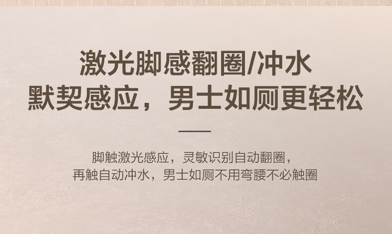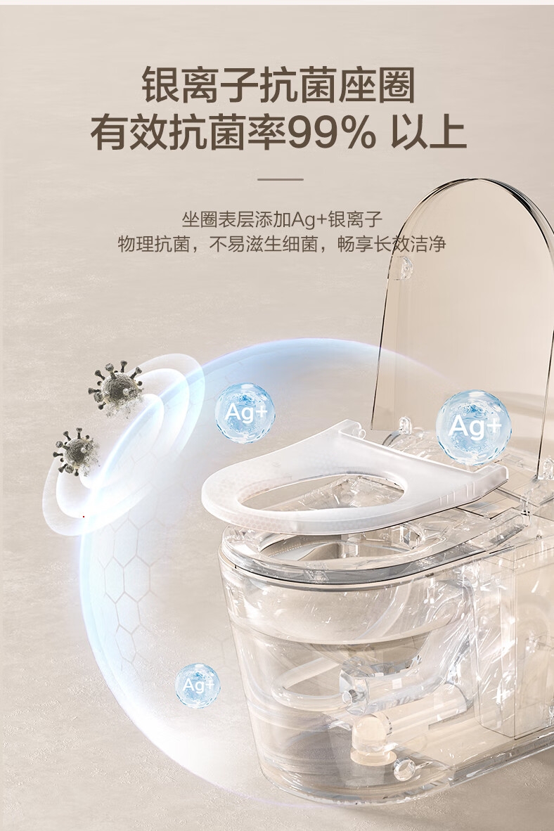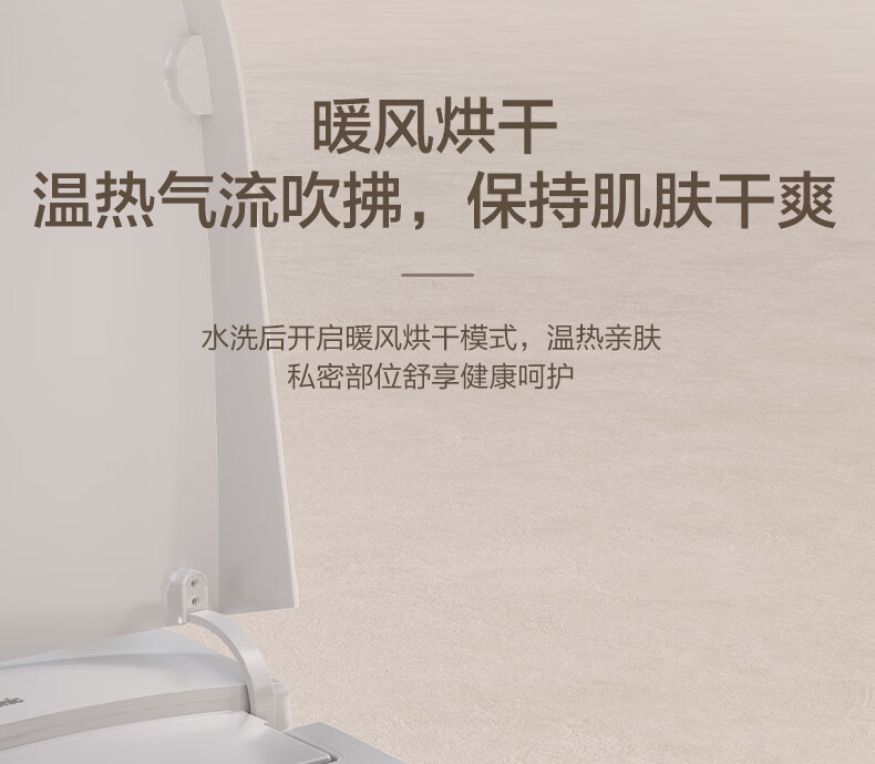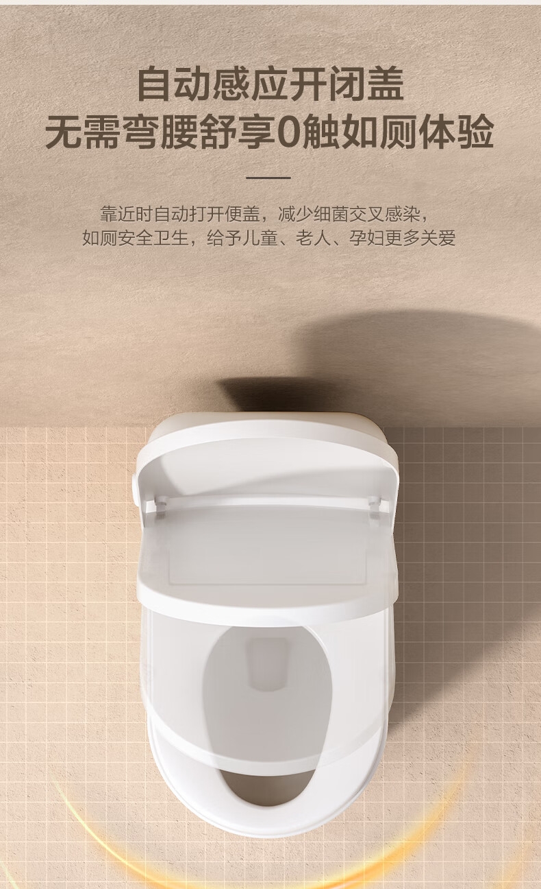 三档座圈加热+暖风烘干,四季舒适;泡沫盾防溅隔臭,如厕洁净无异味;脚感翻盖翻圈,全程免触更卫生;离座自动冲水,智能省心不遗忘;抗菌喷嘴+低水压适配,健康又实用