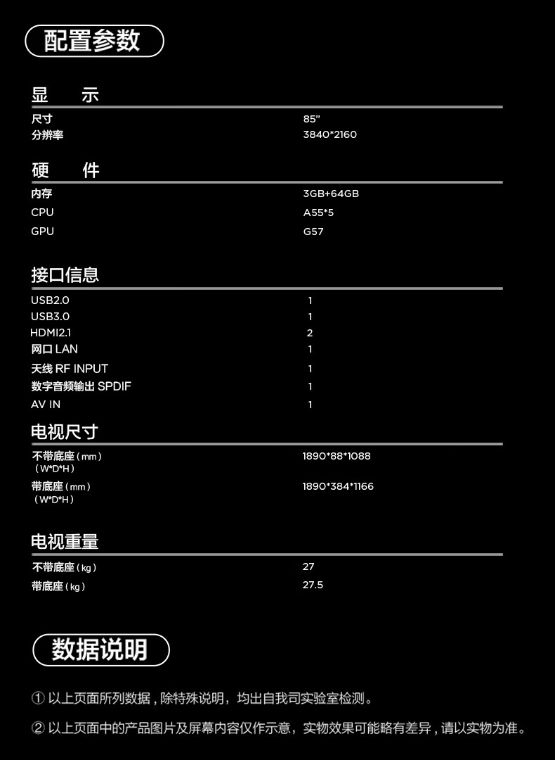 85英寸巨幕视野,沉浸观影如临影院;4K HDR超清画质,细节丰富色彩鲜活;MEMC动态补偿,高速画面流畅无卡顿;杜比全景声环绕,声场立体层次分明;AI智能语音操控,一句话轻松控全局