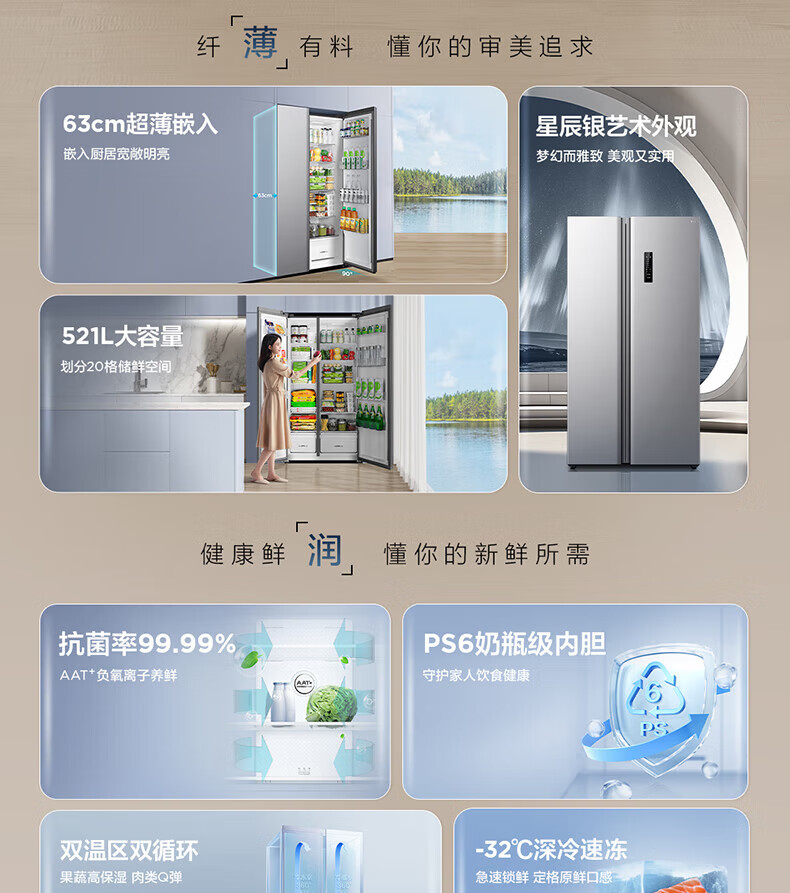TCL 521升一级变频大容量风冷无霜AAT负离子养鲜-32℃深冷速冻锁鲜对开门冰箱