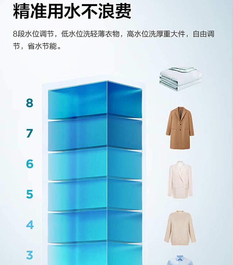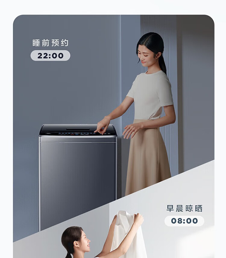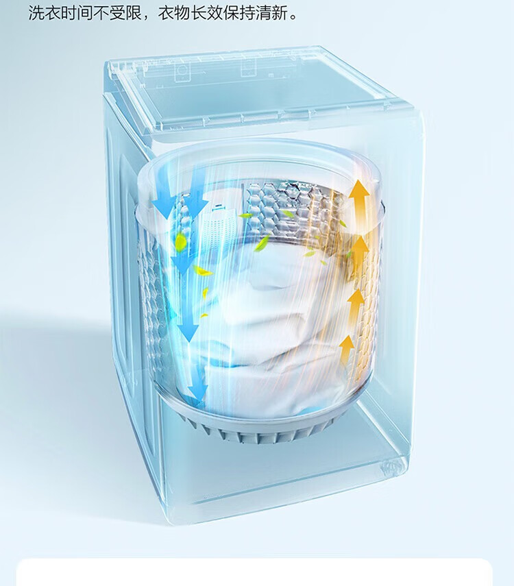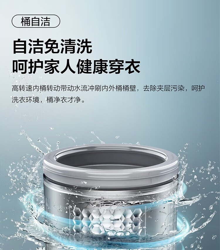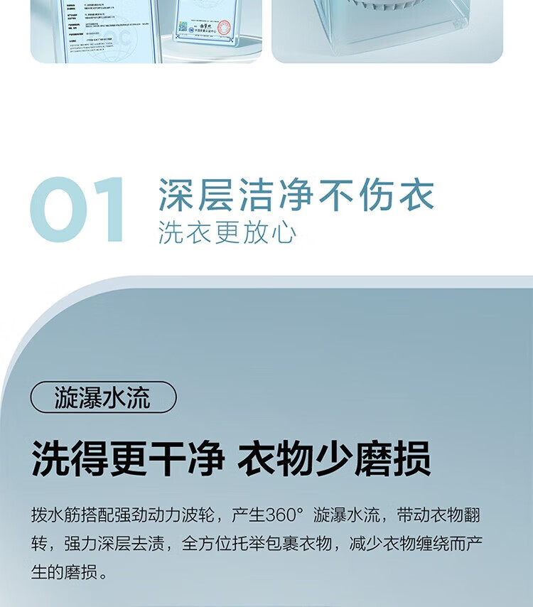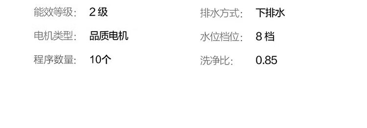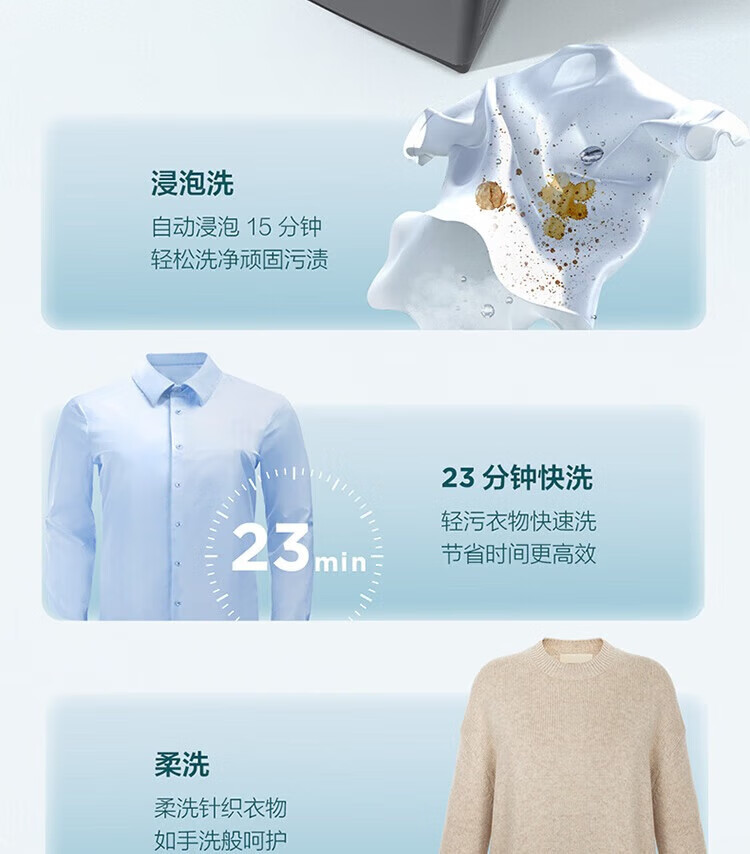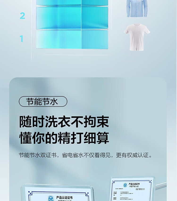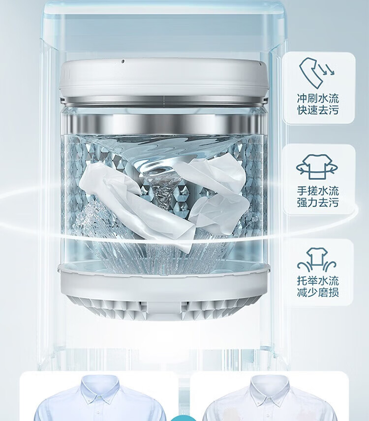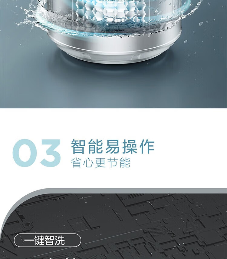 强劲动力高效去污,洗净衣物超轻松;节能省水又环保,长期使用更划算;简约外观超百搭,轻松融入家居环境