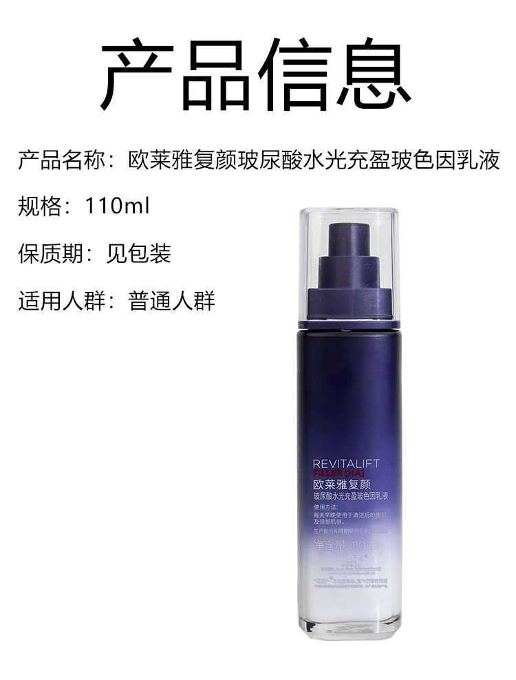 产品(注册/备案)名称:欧莱雅复颜玻尿酸水光充盈玻色因乳液