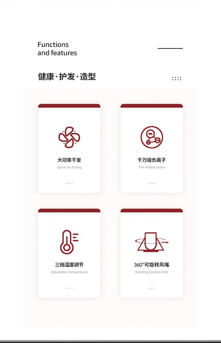 1、T型时尚外观; 2、轻巧身材便捷; 3、千万积;4、1800W大功率配合直线风道 风量损耗低;