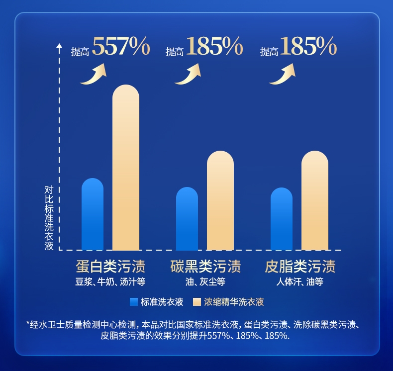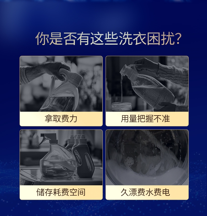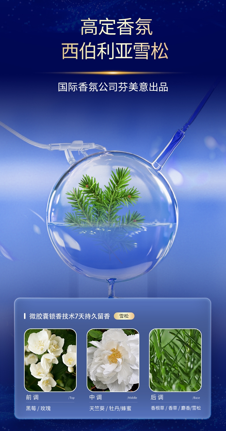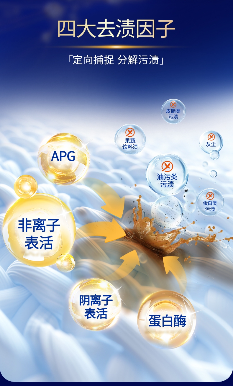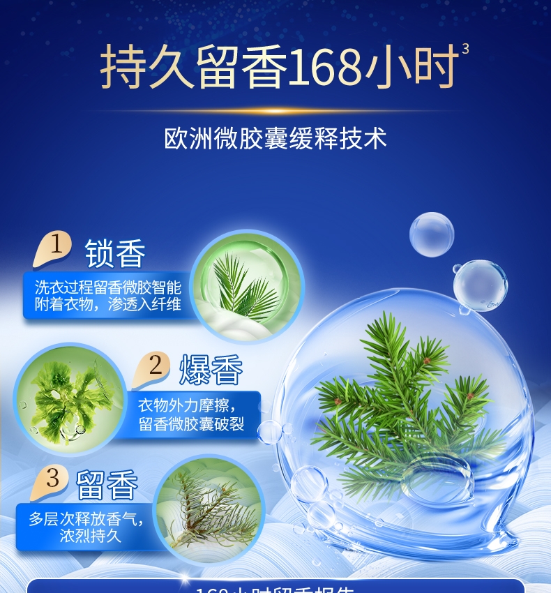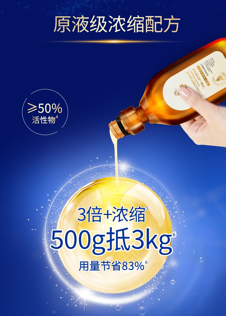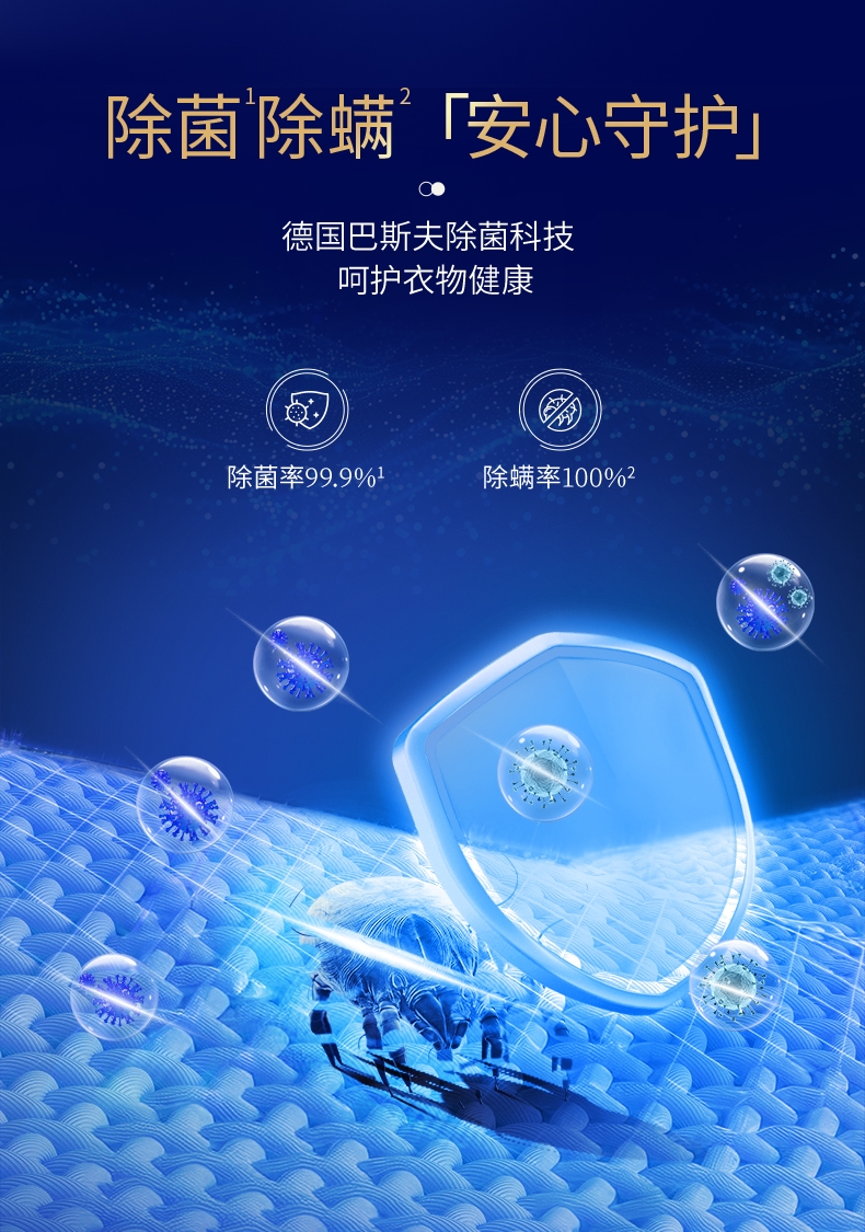 浓缩配方,活性物≥50%;浓缩洁净力,强劲去顽渍;德国巴斯夫除菌科技,除菌率99.9%;微胶囊锁香技术7天持久留香;专利定量瓶精准取用,手洗机洗均可适用