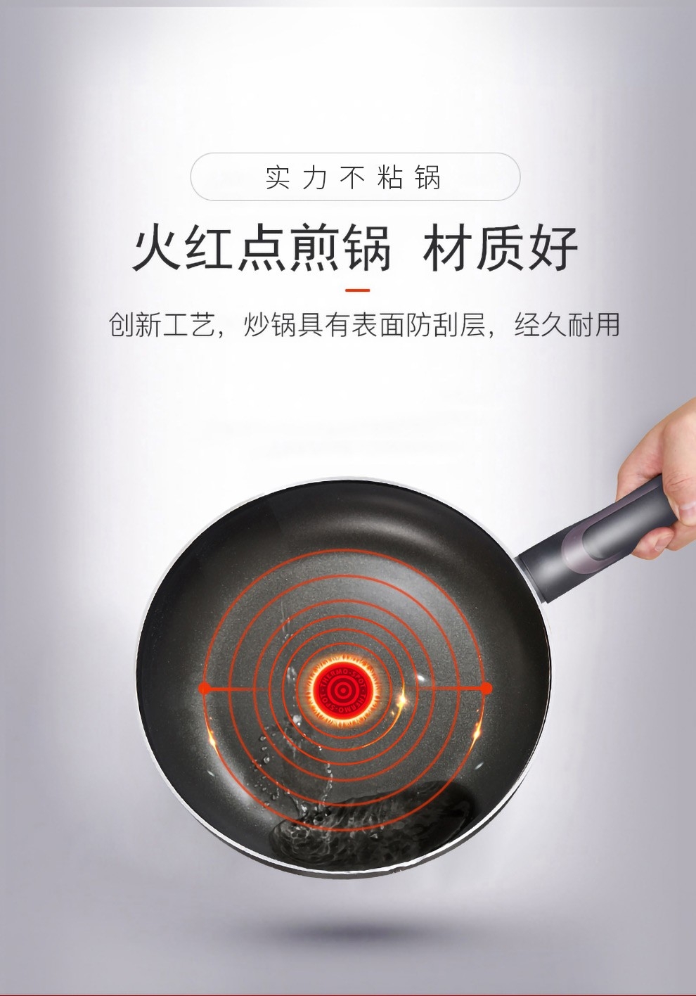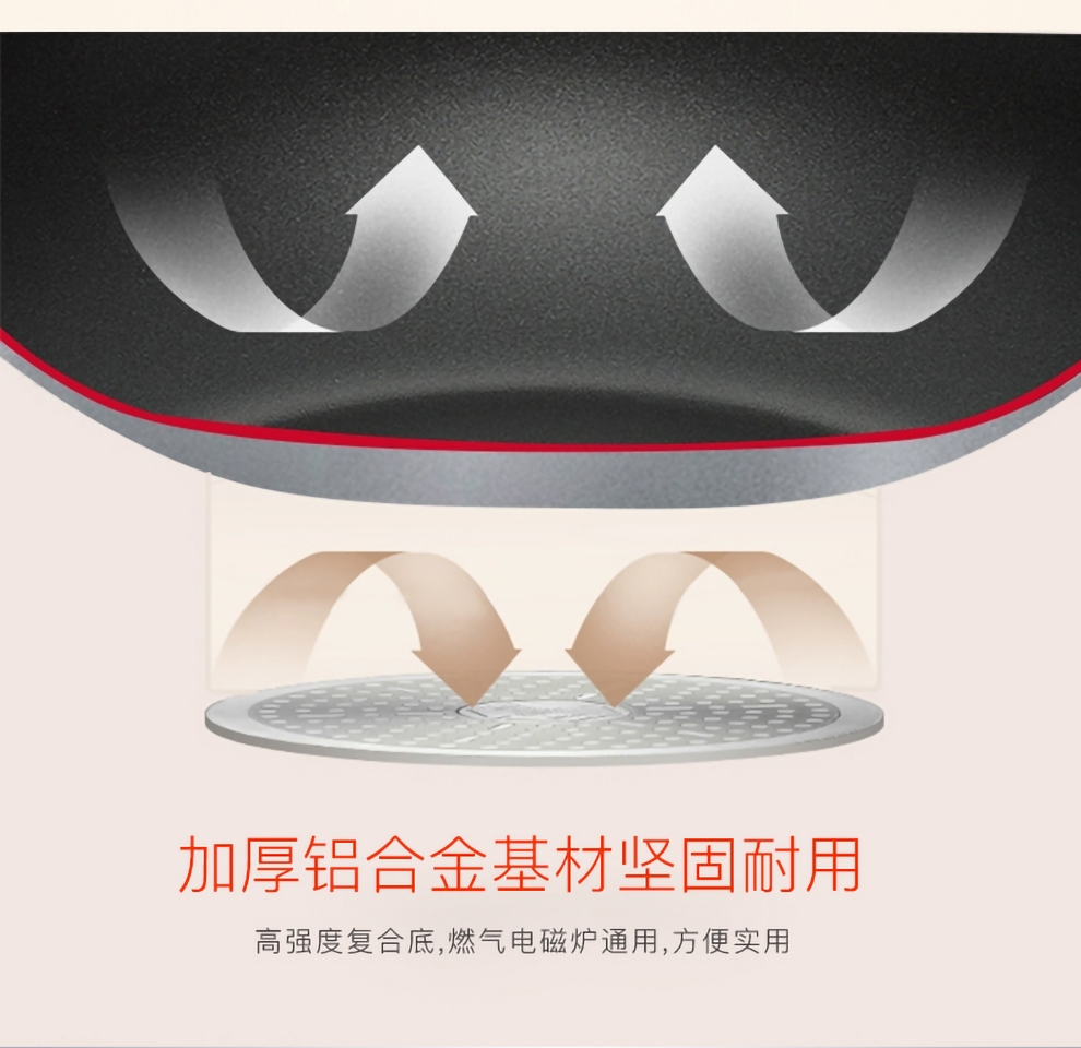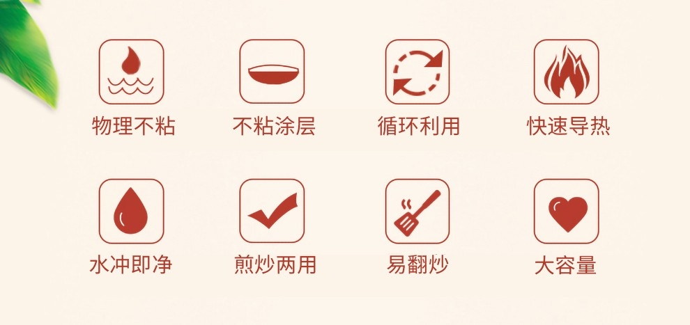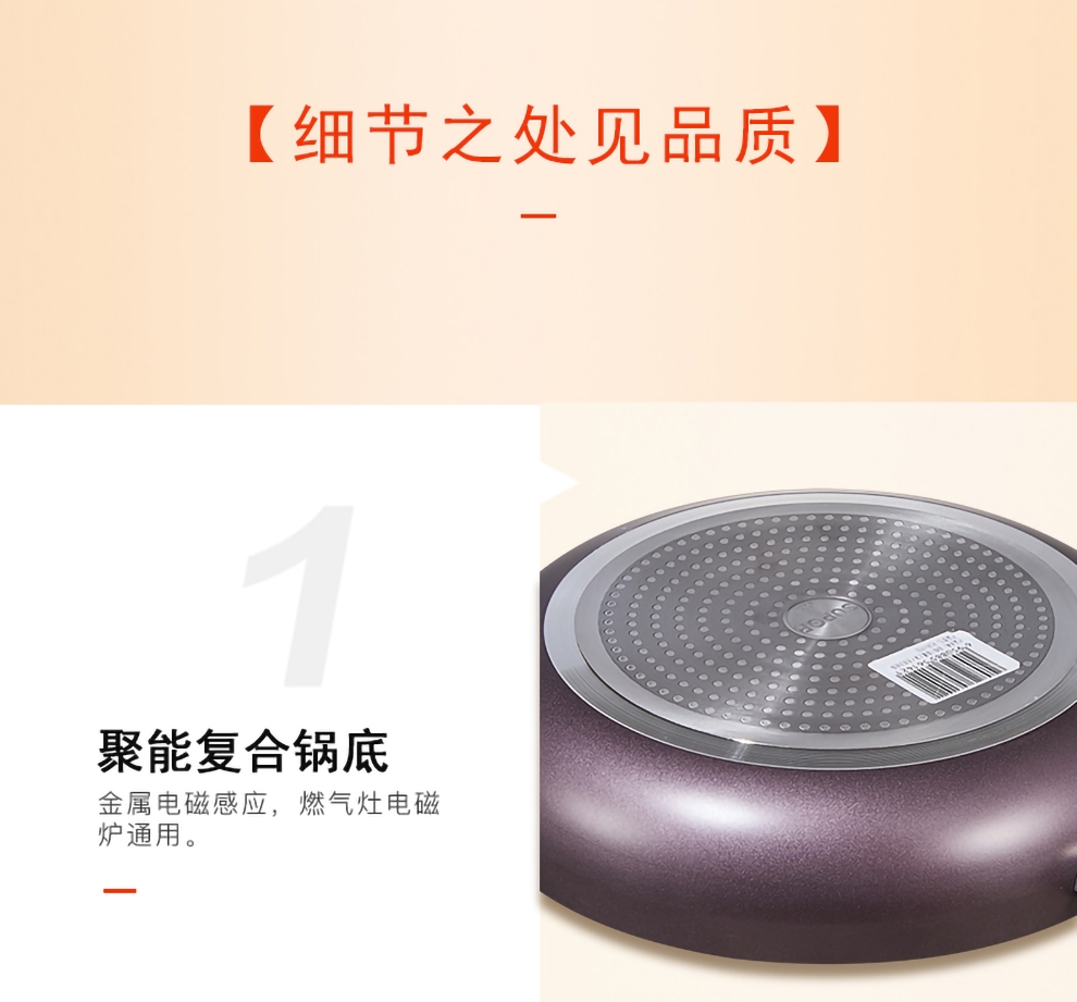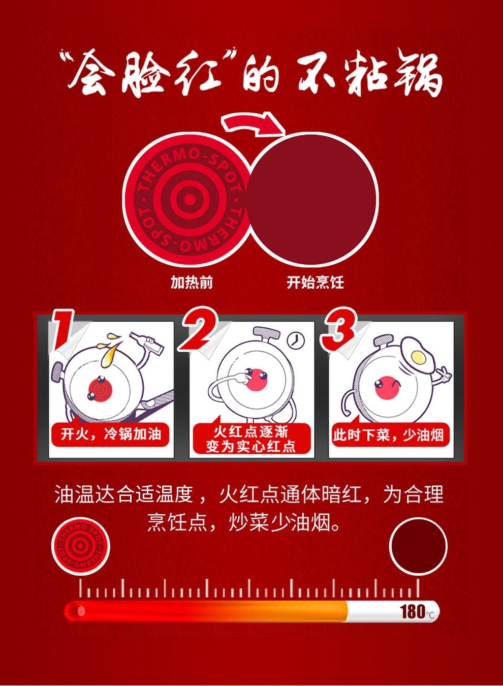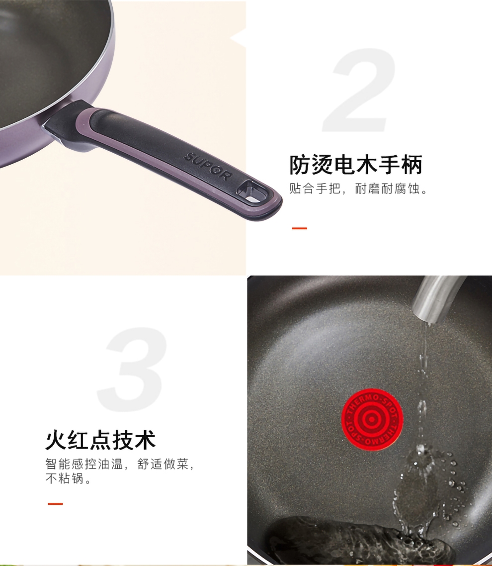 火红点智控油温,油温刚刚好,味道才更好;大平底,简单煎的好;内表面不粘材料,不粘易清洁;锅体色彩缤纷明亮,点亮时尚厨房