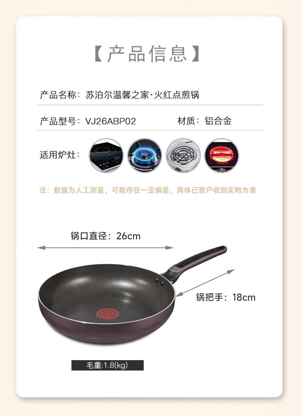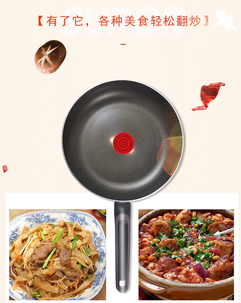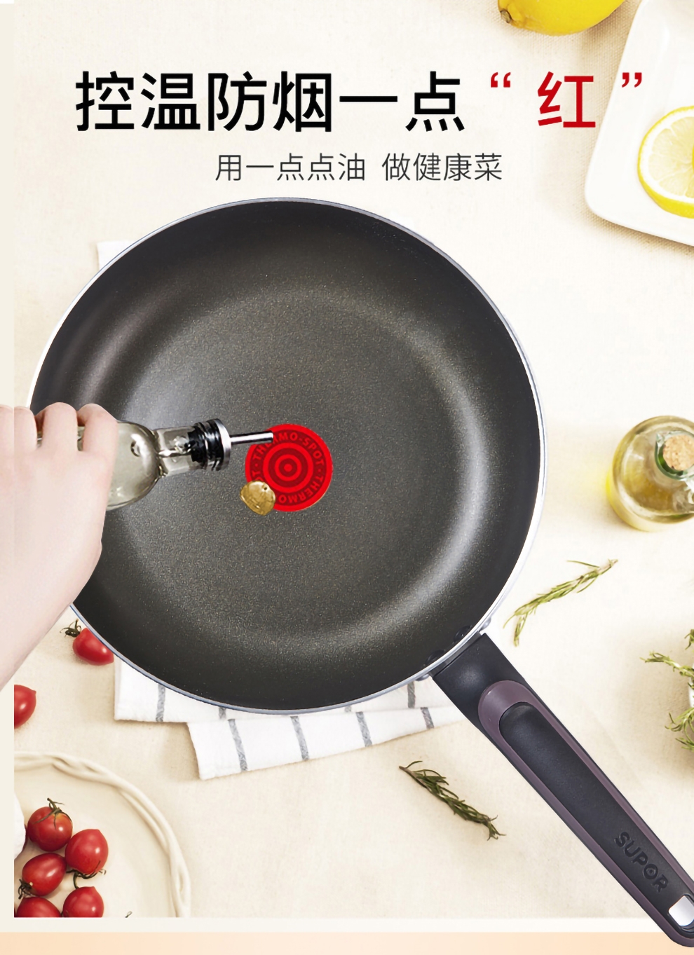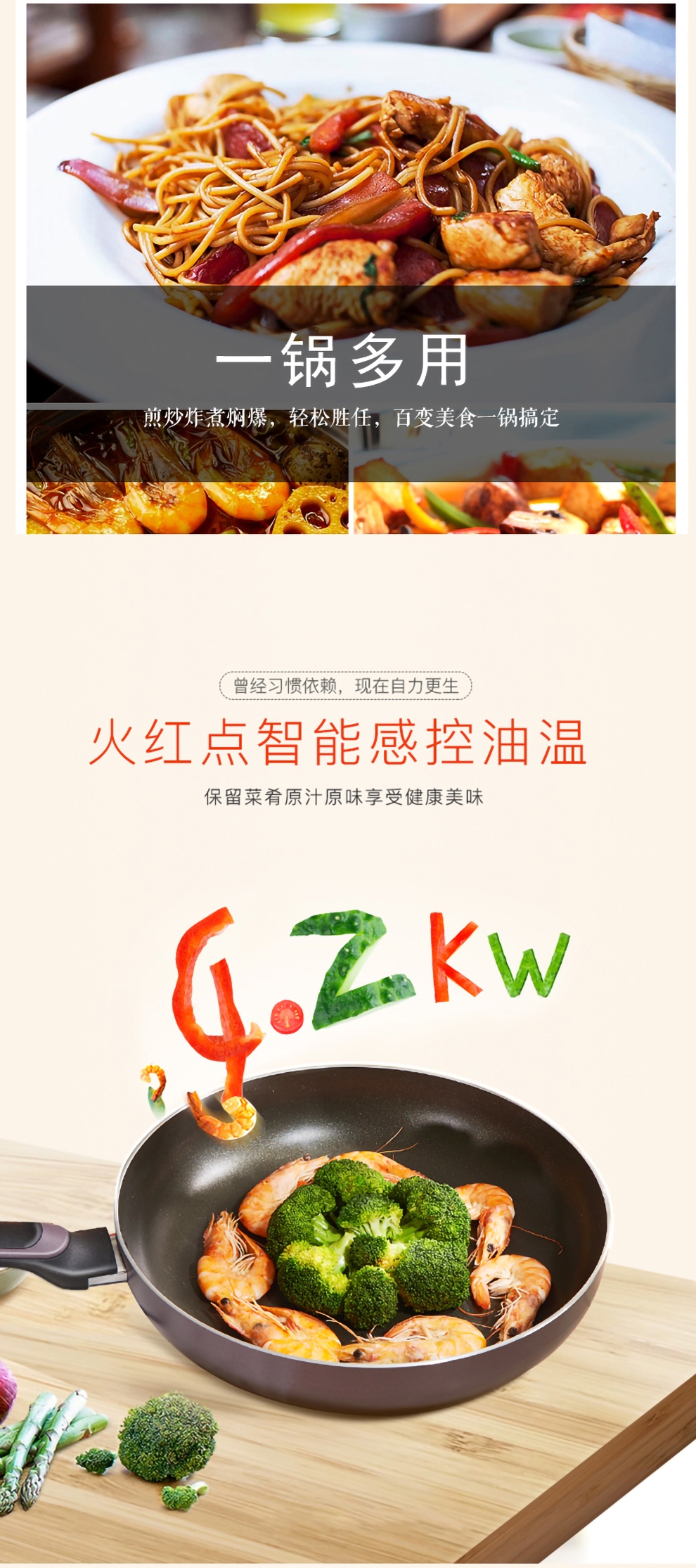 火红点智控油温,油温刚刚好,味道才更好;大平底,简单煎的好;内表面不粘材料,不粘易清洁;锅体色彩缤纷明亮,点亮时尚厨房