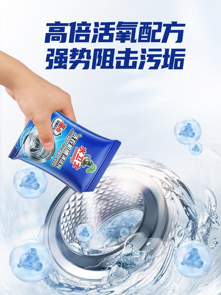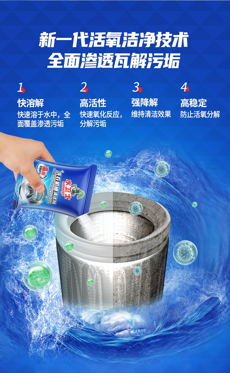 12.9% 高倍活氧配方,强势阻击污垢;快溶解:快速溶于水中,全面覆盖渗透污垢;高活性:快速氧化反应,分解污垢;高稳定:防止活氧分解;强降解:维持清洁效果