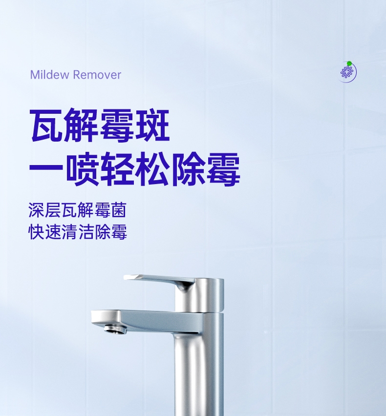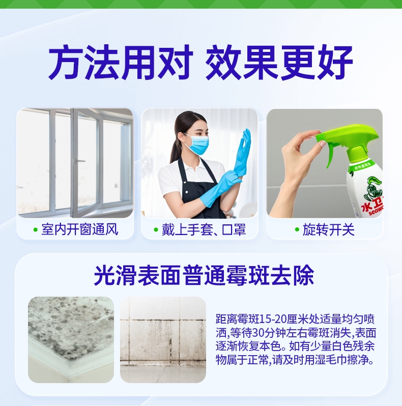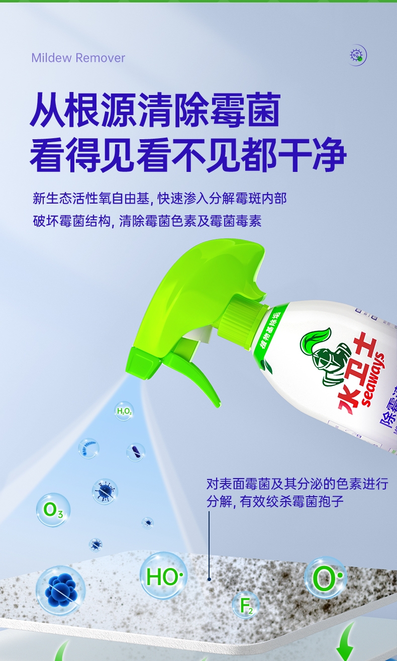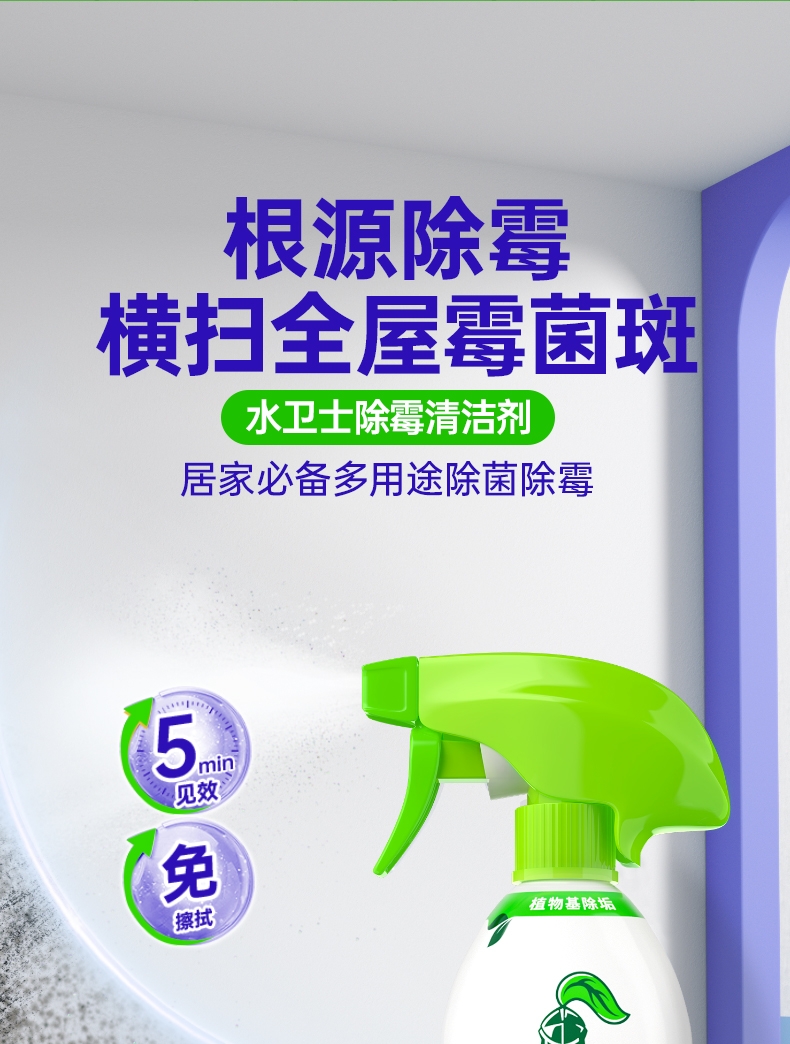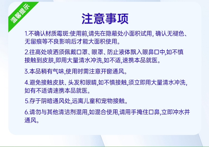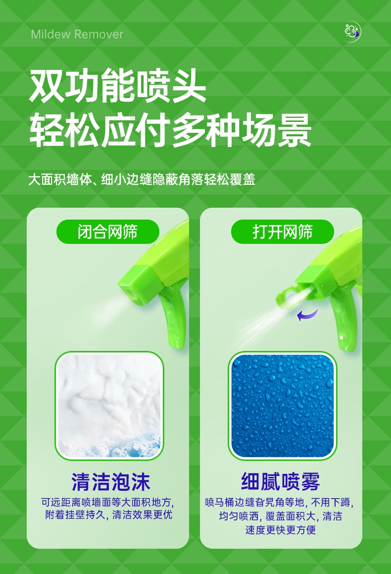 特含高效洁净因子,除霉去污一步到位;高效除霉配方,采用新生态活性氧自由基;99.9%去除黑曲霉菌,从根源清除霉菌;99.9%除菌率,去除多种常见致病菌;双功能喷头自由切换