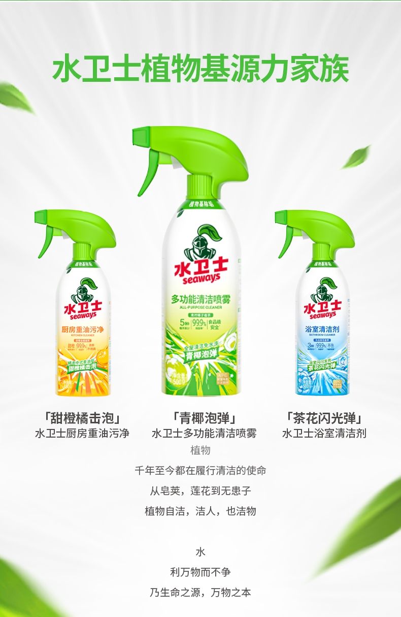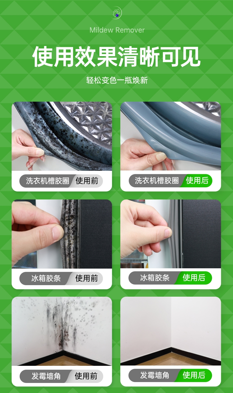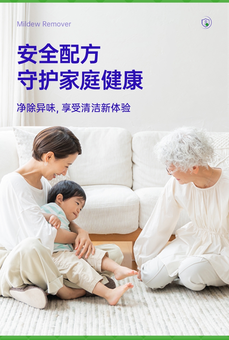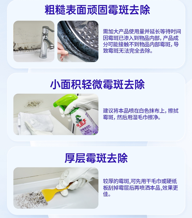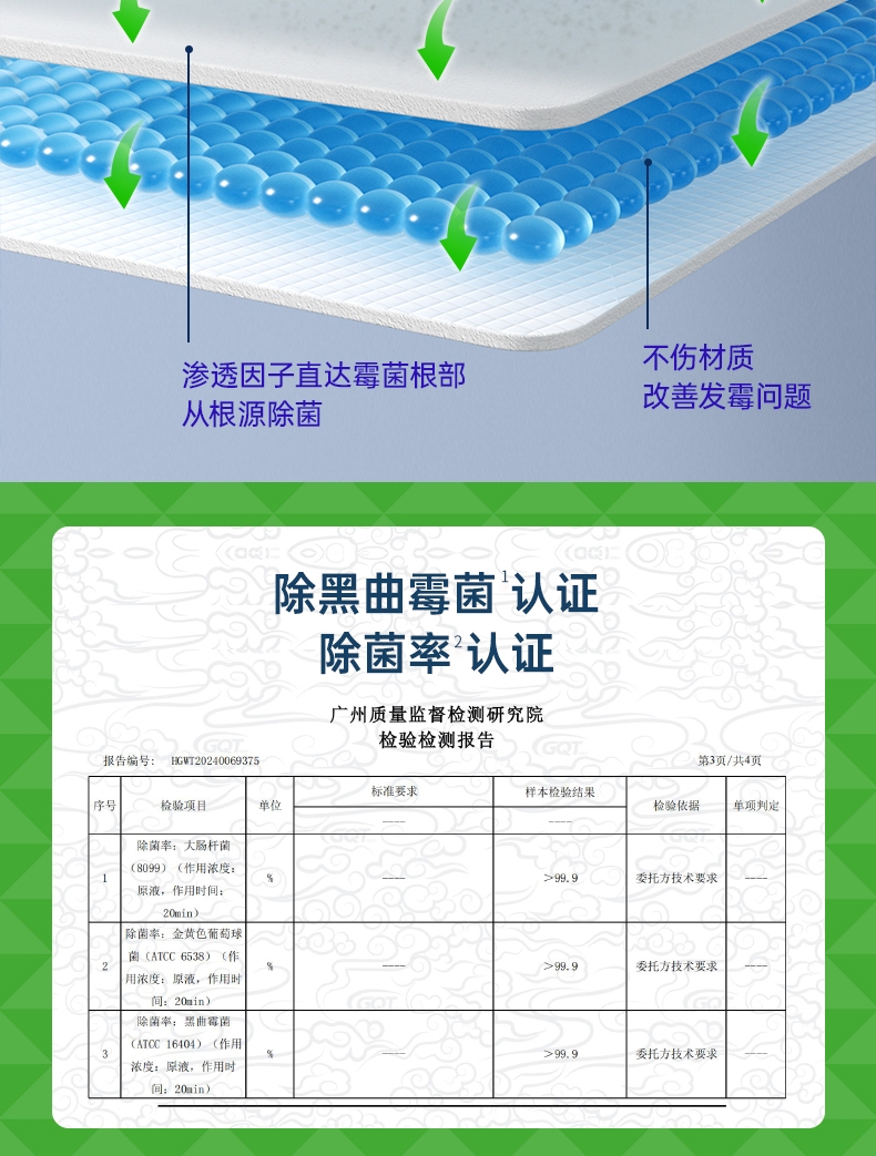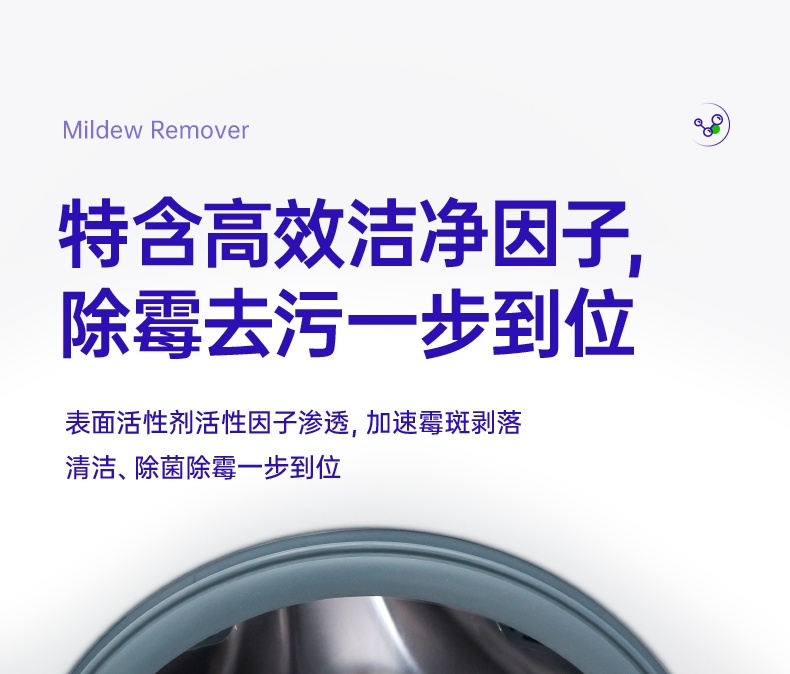 特含高效洁净因子,除霉去污一步到位;高效除霉配方,采用新生态活性氧自由基;99.9%去除黑曲霉菌,从根源清除霉菌;99.9%除菌率,去除多种常见致病菌;双功能喷头自由切换