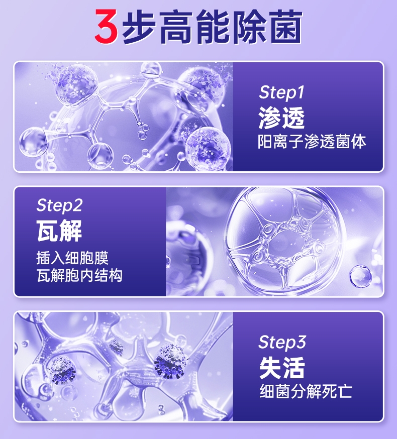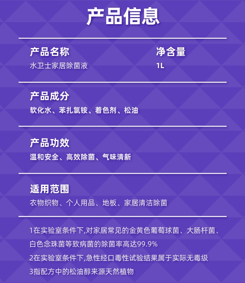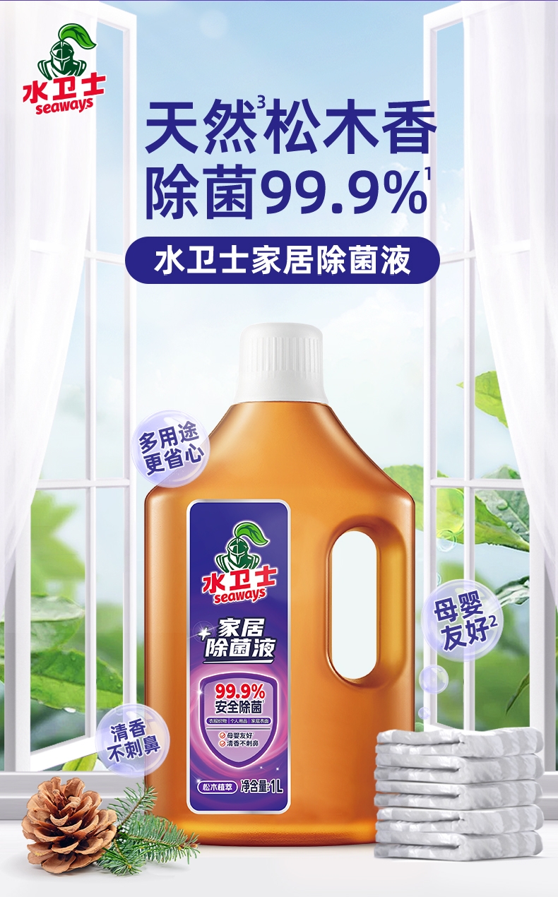 除菌99.9%,时刻保护;温和无毒 母婴友;天然植物萃取,天然松油醇,松木清香;1:100兑水稀释使用,高效浓缩配方,用量更省;