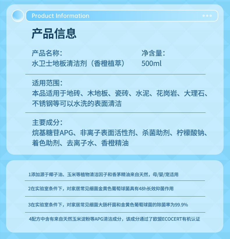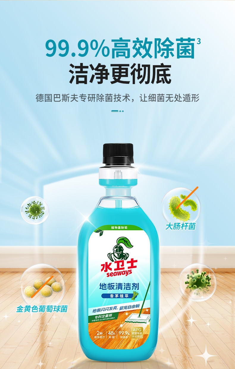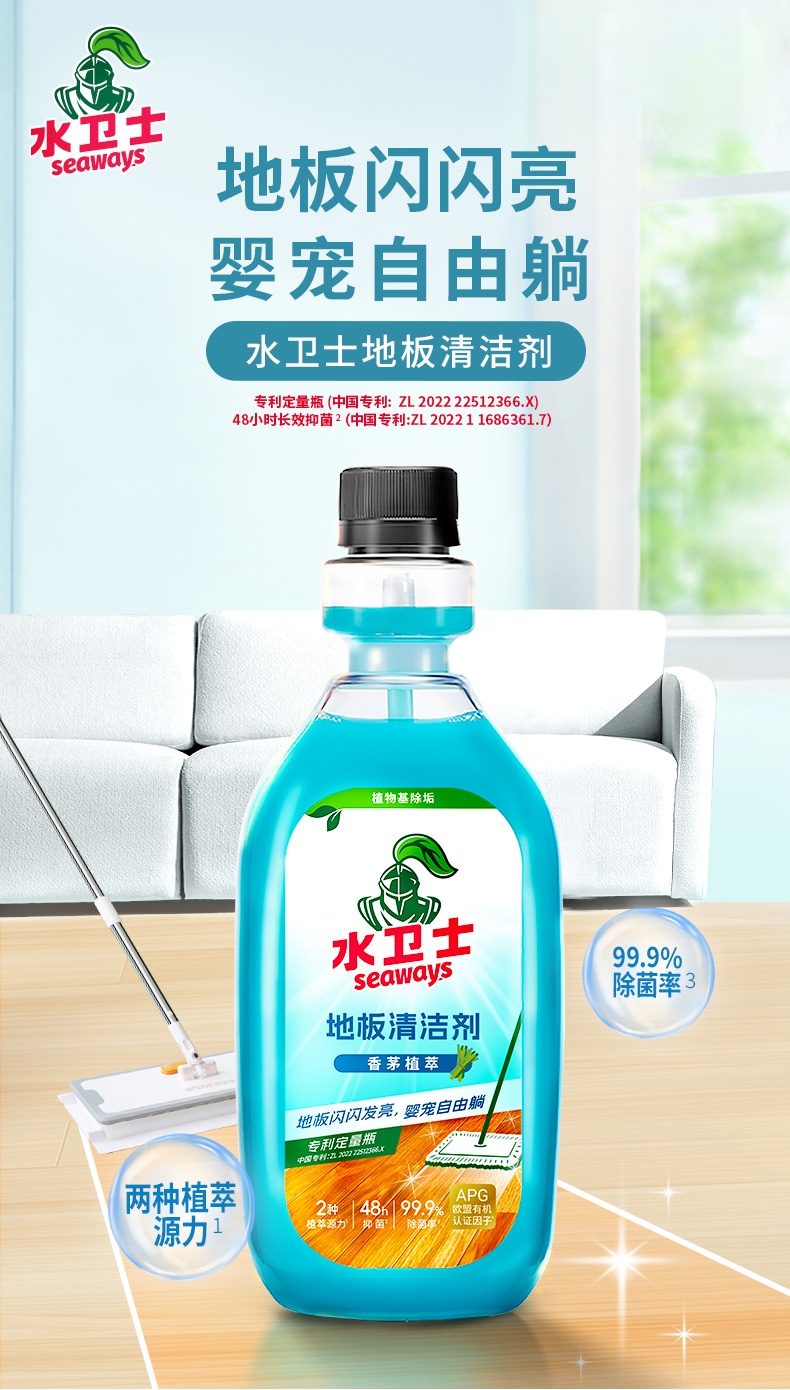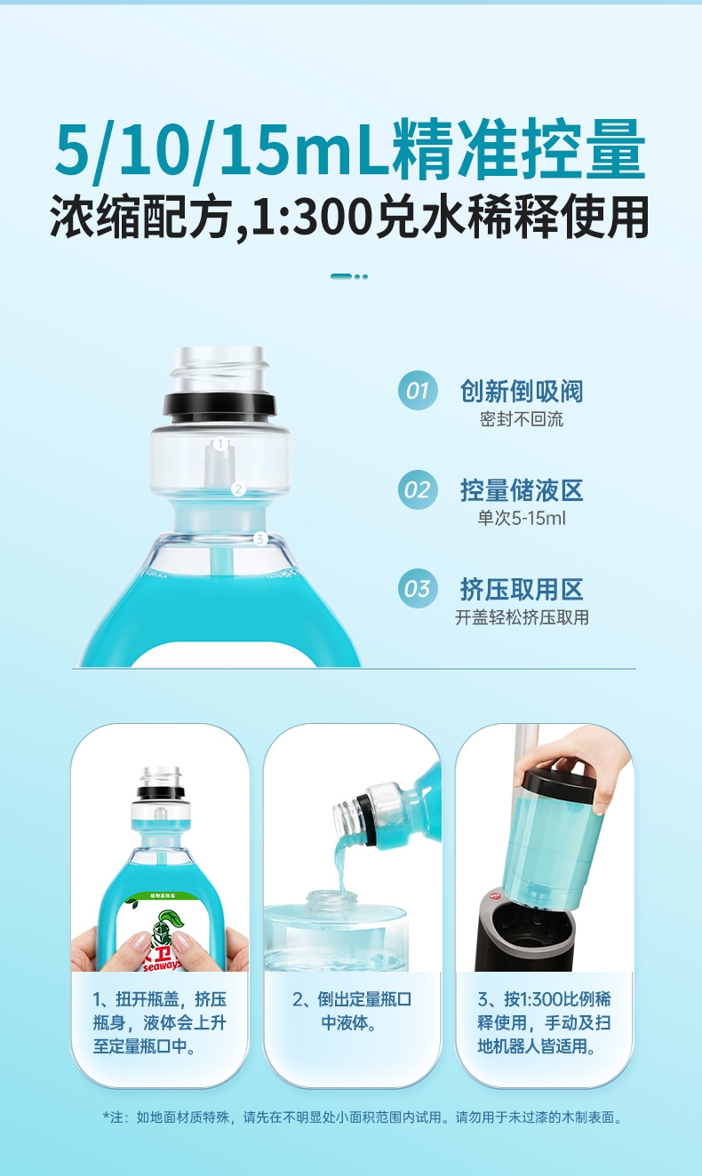 创新定量瓶型,定量使用,轻松拿捏;天然植萃配方,母/婴/宠适用;除菌率99.9%,48小时抑菌;适用于多种常见地面,使用方便