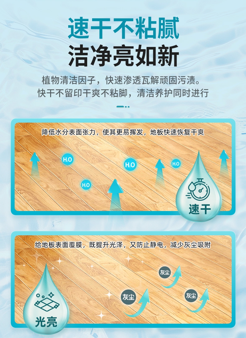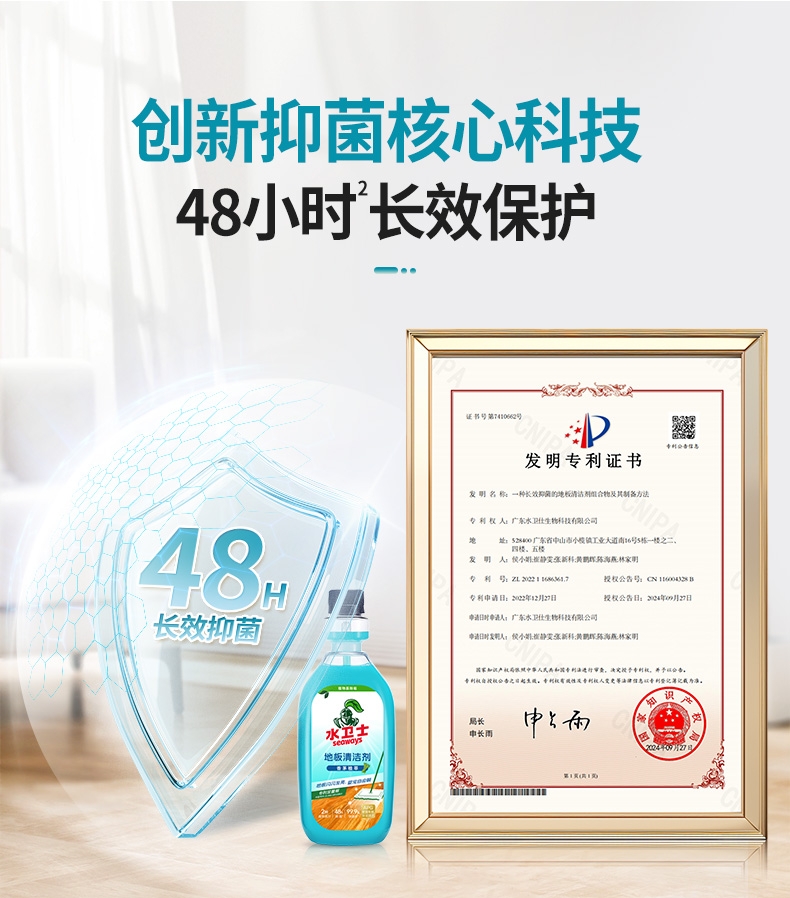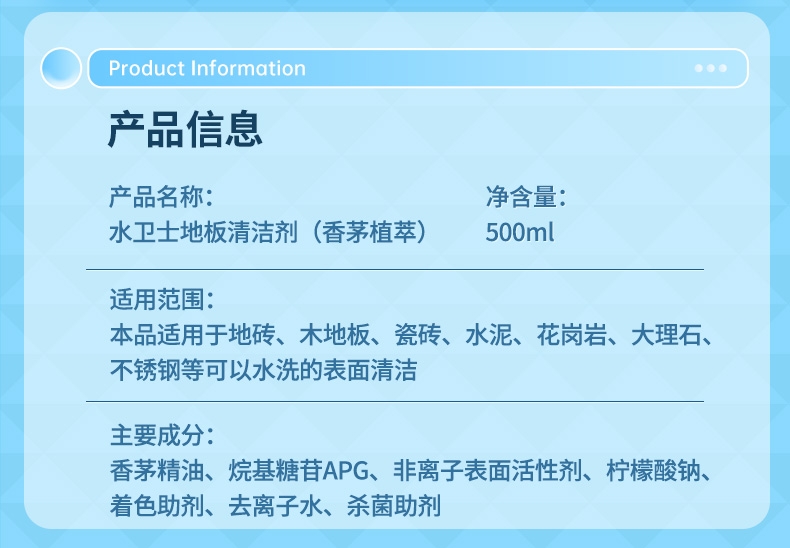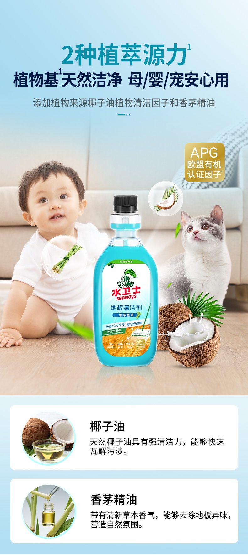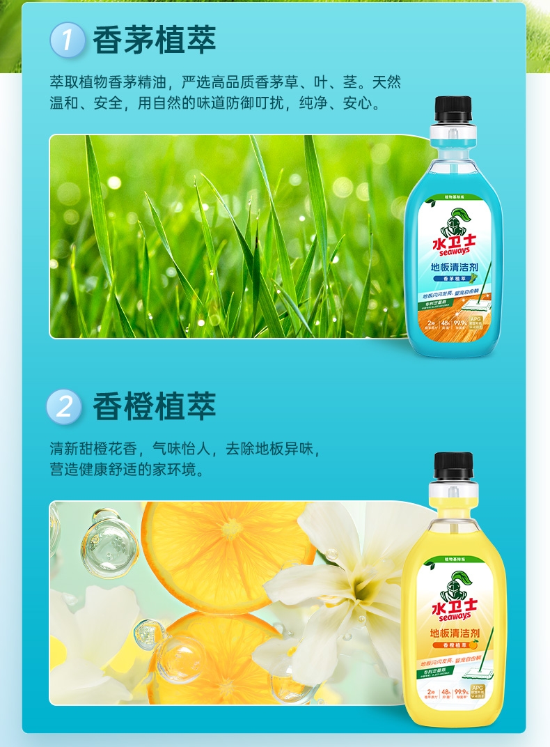 创新定量瓶型,定量使用,轻松拿捏;天然植萃配方,母/婴/宠适用;除菌率99.9%,48小时抑菌;适用于多种常见地面,使用方便