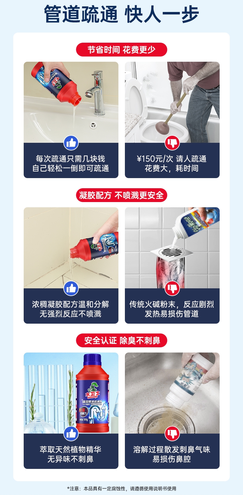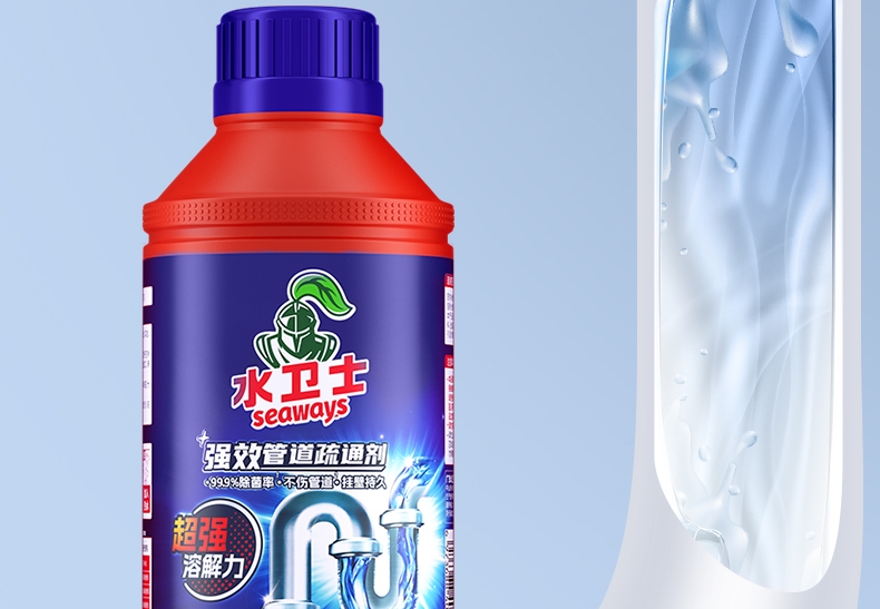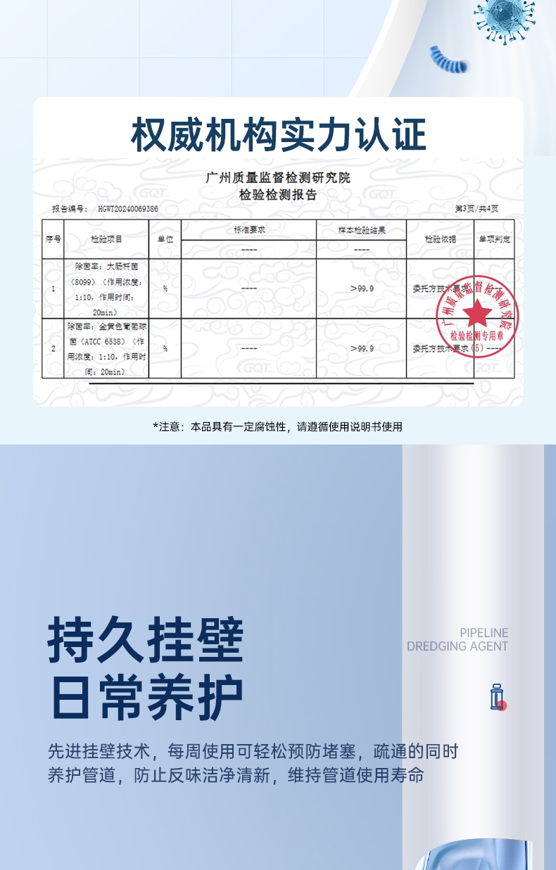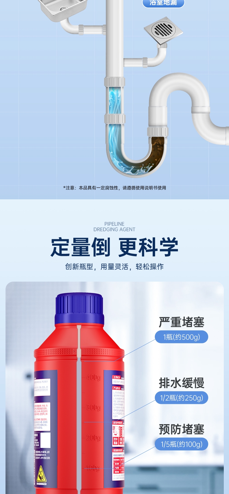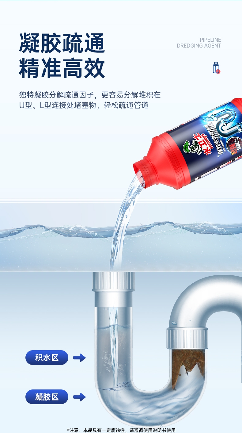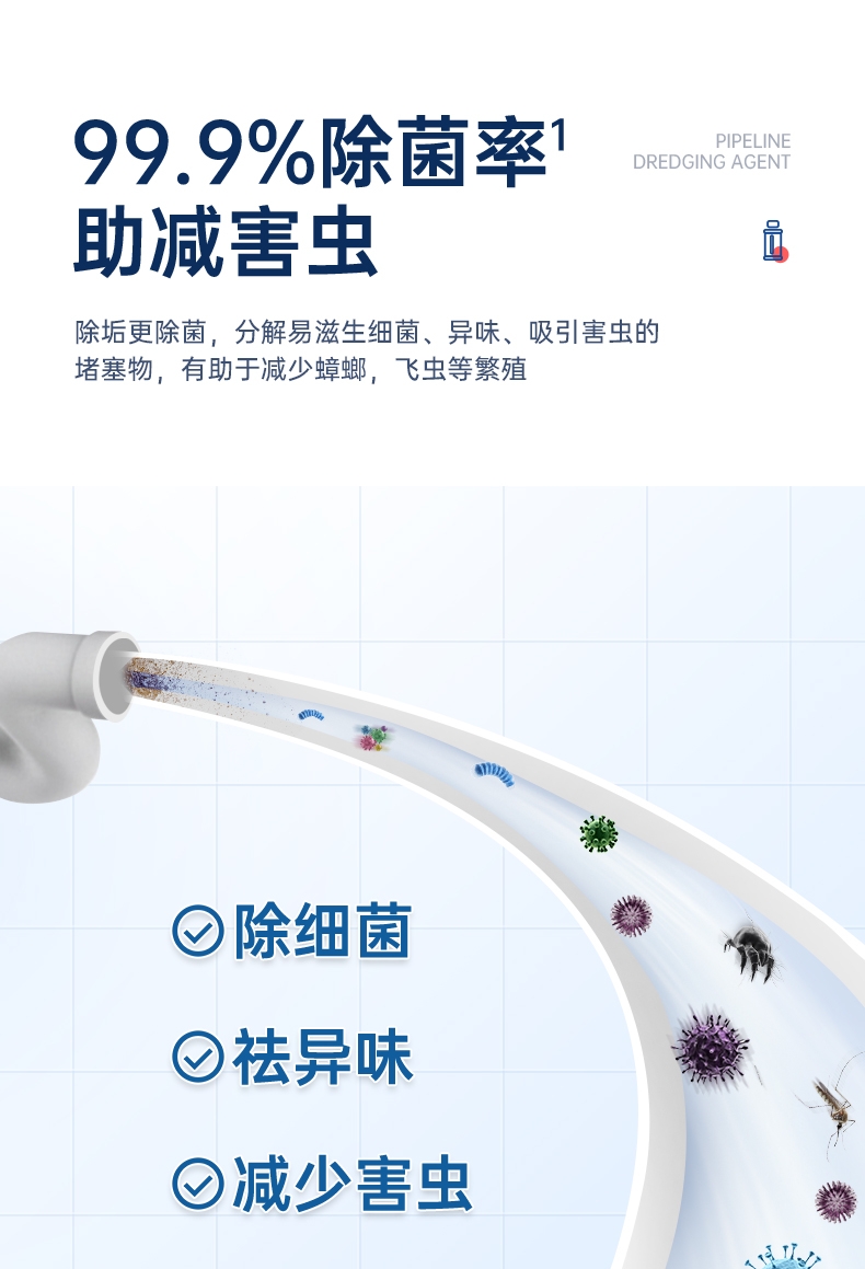 添加高效疏通因子+先进挂壁技术;除菌率99.9%,有效除菌、除味、减少害虫;创新定量瓶型,科学定量使用;用量灵活,轻松操作;适用于多种形状和大小的下水管道口