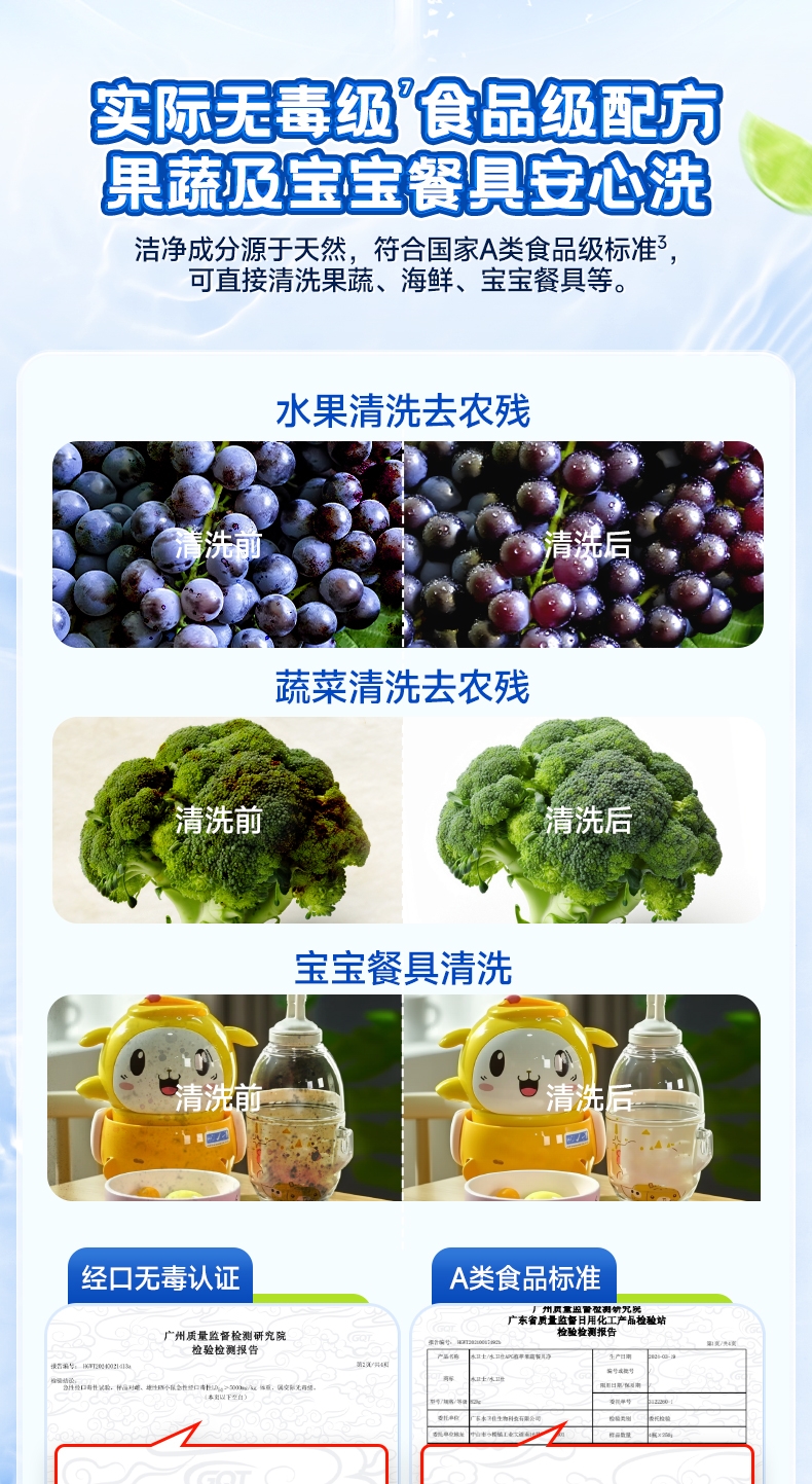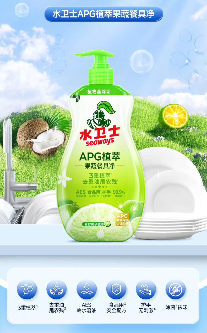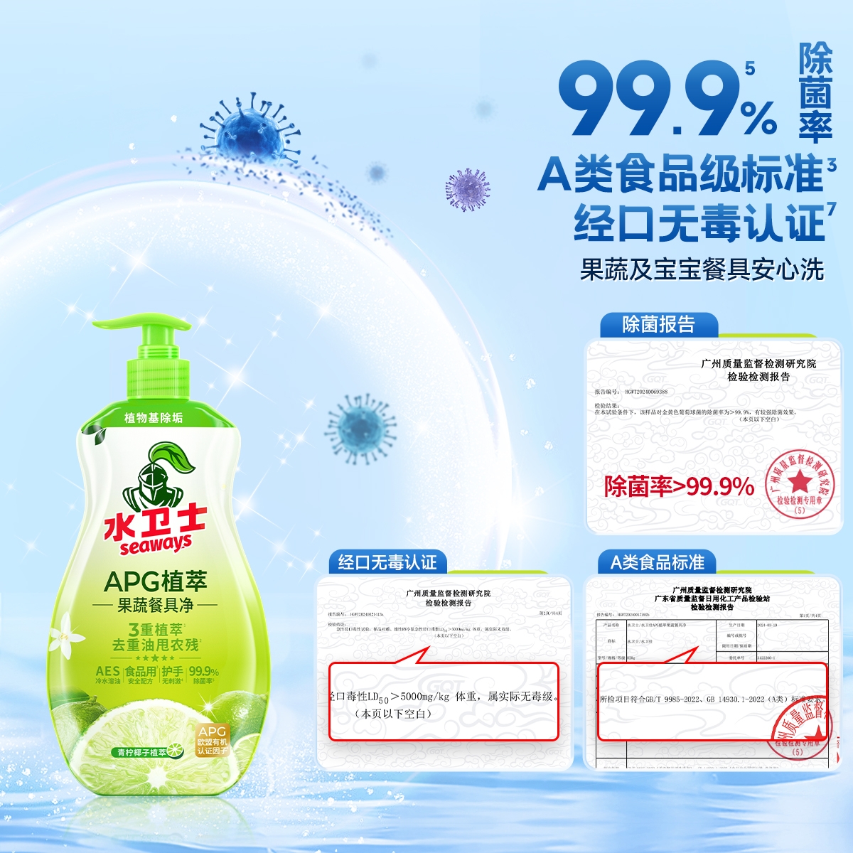 3重植萃去污,全方位去除餐具油污;AES强渗透配方,帮助洁净成分渗透油污内部;食品用,果蔬及宝宝餐具安心洗;除菌去味去农残,守护入口健康;护手无刺激。呵护双手
