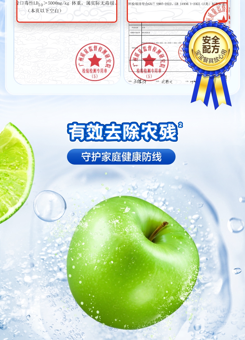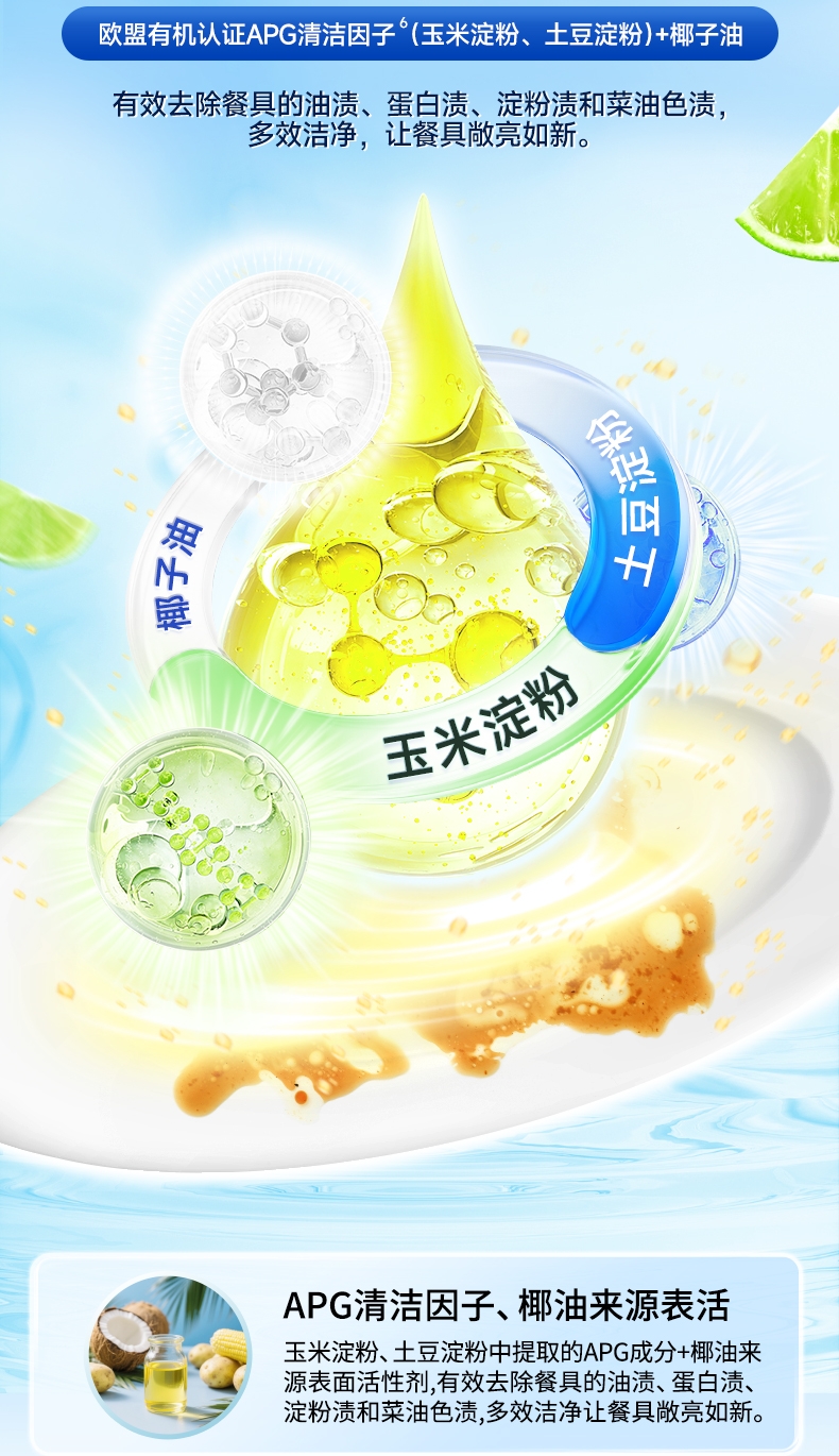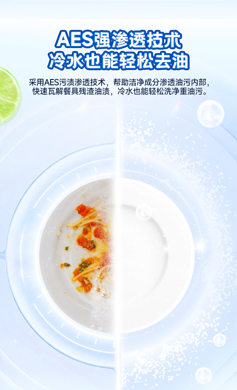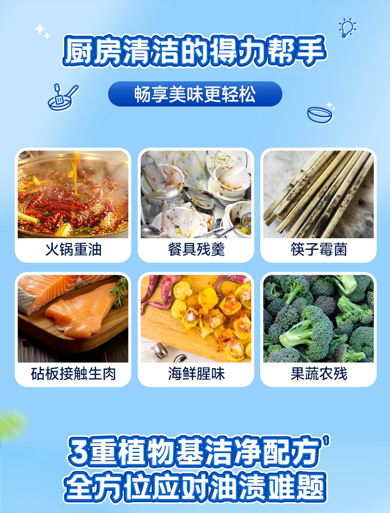 3重植萃去污,全方位去除餐具油污;AES强渗透配方,帮助洁净成分渗透油污内部;食品用,果蔬及宝宝餐具安心洗;除菌去味去农残,守护入口健康;护手无刺激。呵护双手