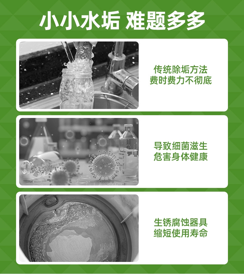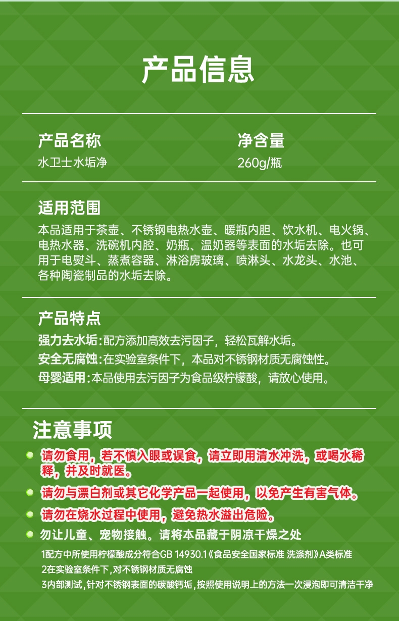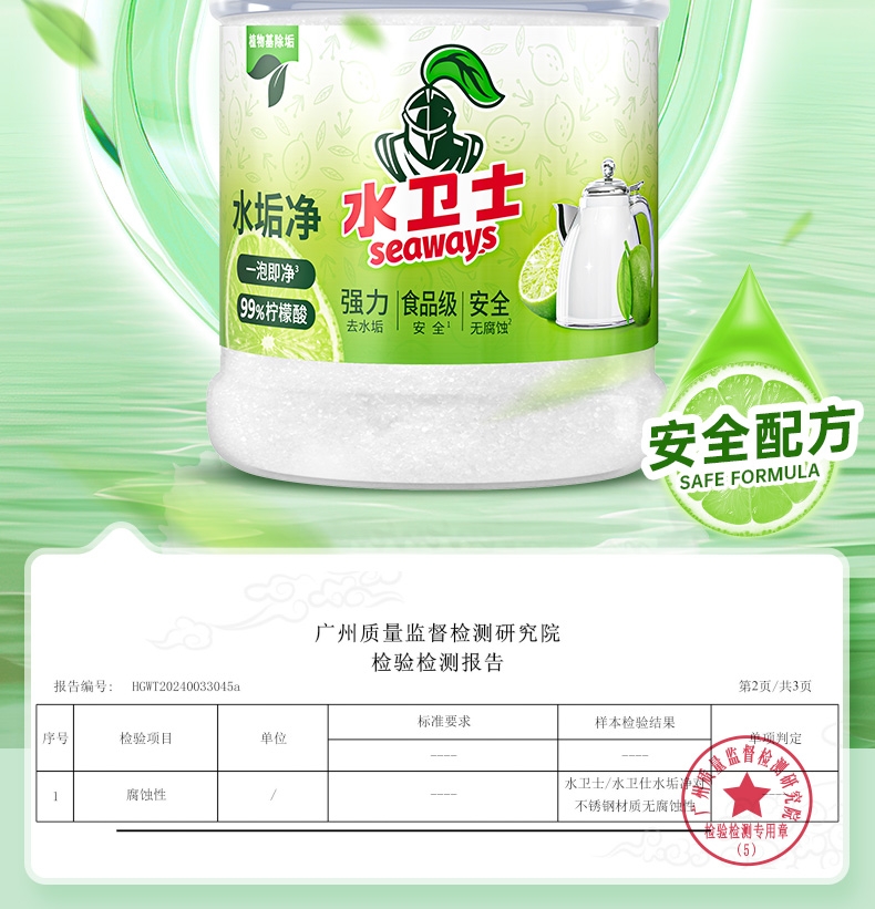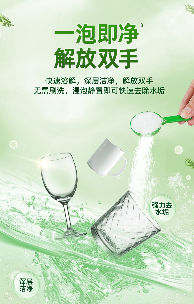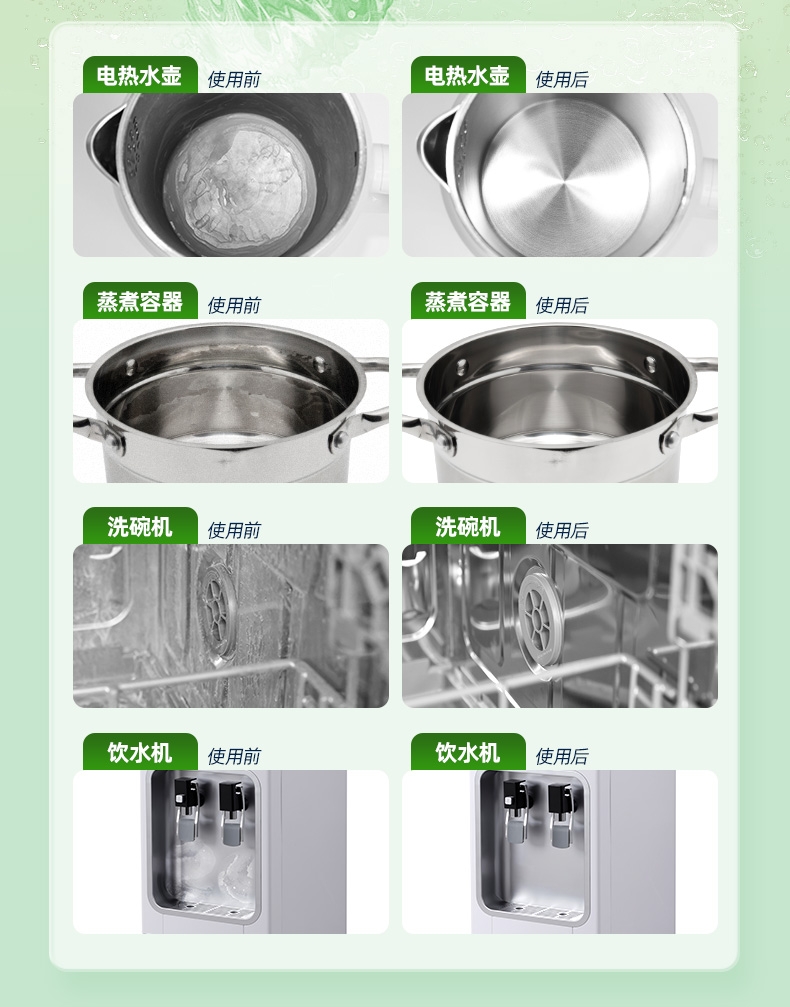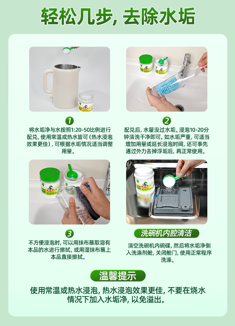高纯度柠檬酸,轻松去除水垢;一瓶多场景适用;食品级配方,安心除水垢;温和清洁,安全无腐蚀