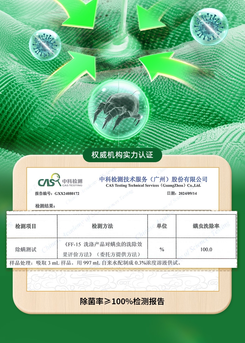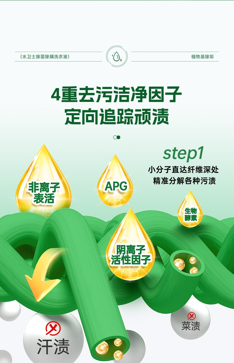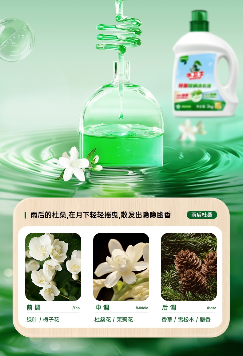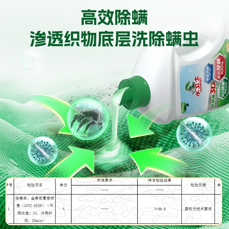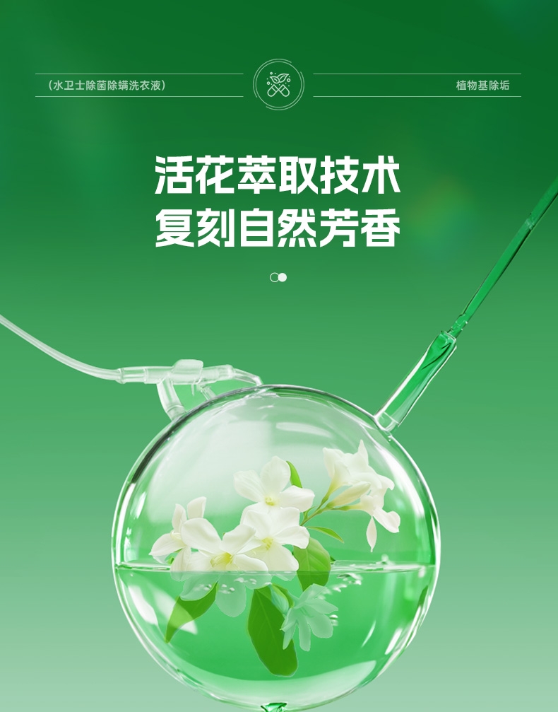 99.9%除菌率,复配HP除菌科技;高效除螨100%,渗透织物底层洗除螨虫;4重去污洁净因子,定向追踪顽渍;植物基配方,天然净护力;活花萃取技术,复刻自然芳香