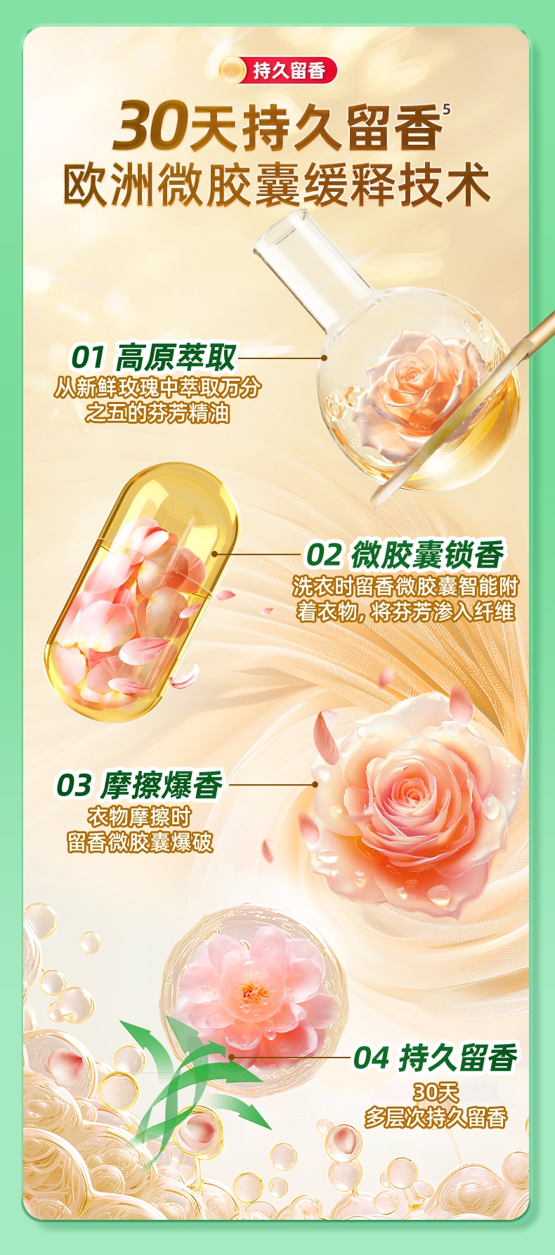 9倍浓缩洁净力,APG天然洁净因子;99.9%除菌,德国巴斯夫专研除菌技术;摩擦生香,欧洲微胶囊缓释技术;3大特调香氛,国际调香大师调配,打造心机伪体香;伪体香; 温和配方,低泡易漂洗