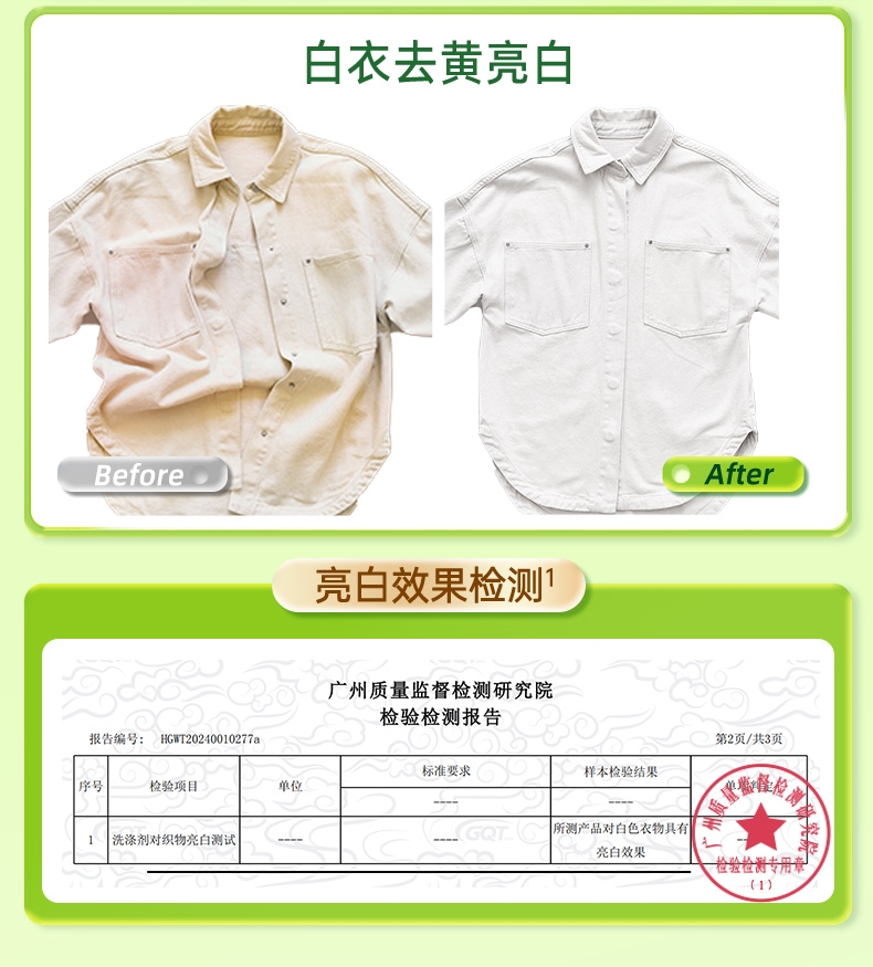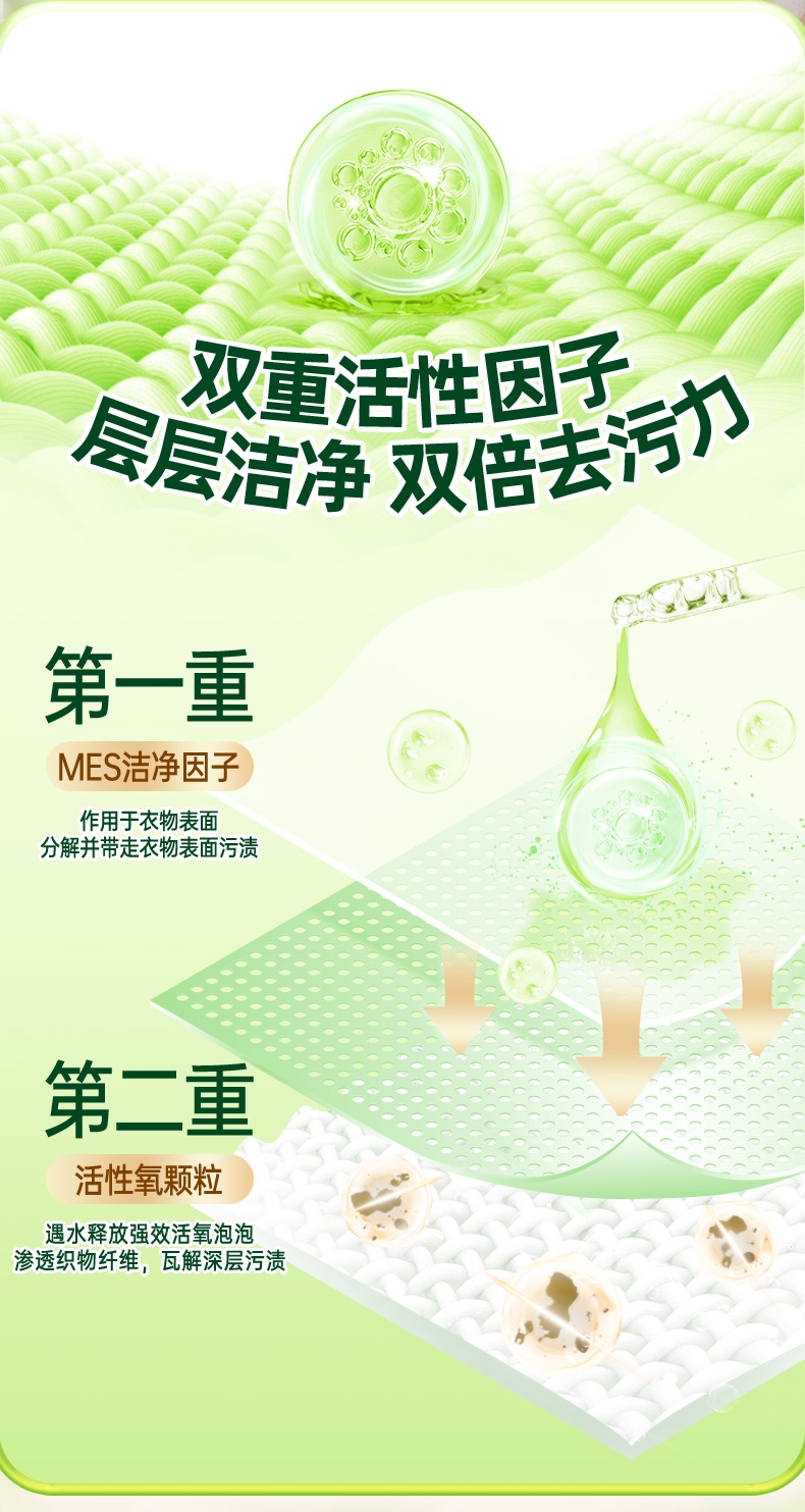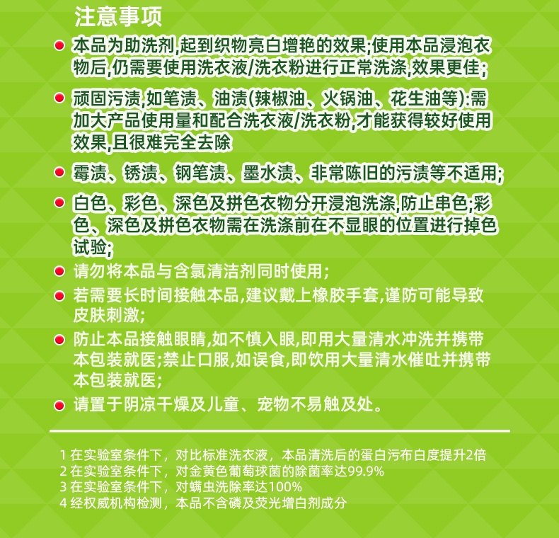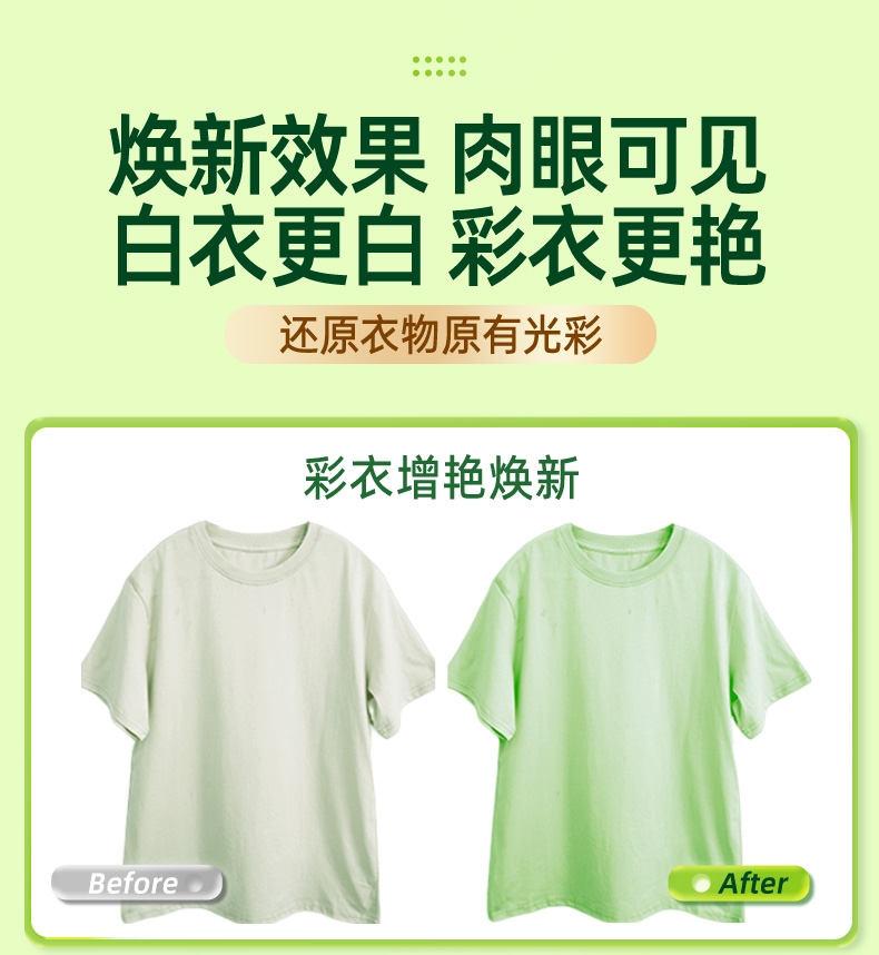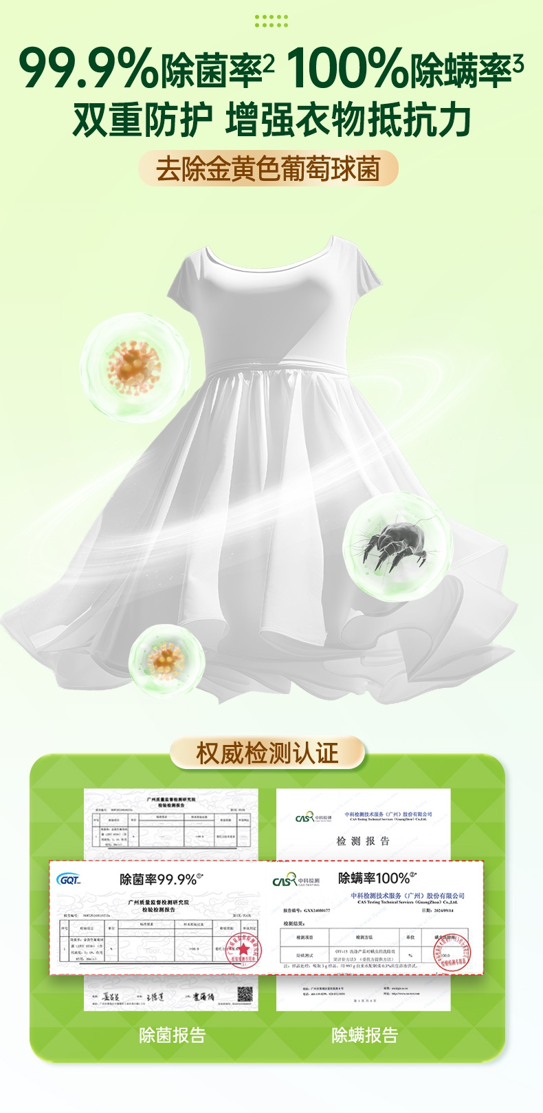 作用于衣物表面,分解并带走;天然洁净配 方,白衣彩衣通;成分源于天然 , 温和不伤衣;除菌率99.9%,除螨100%