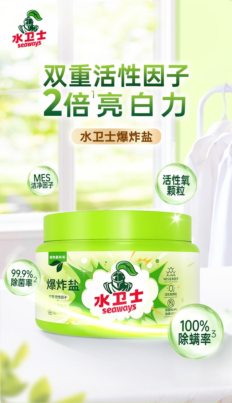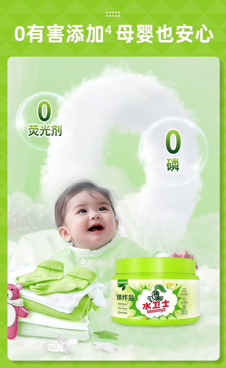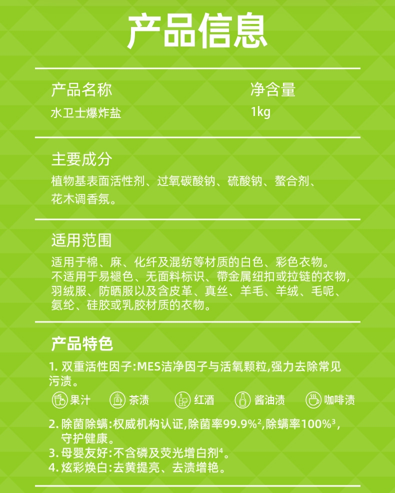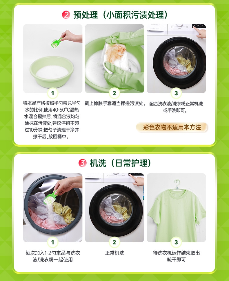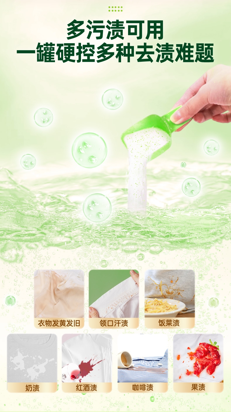 作用于衣物表面,分解并带走;天然洁净配 方,白衣彩衣通;成分源于天然 , 温和不伤衣;除菌率99.9%,除螨100%
