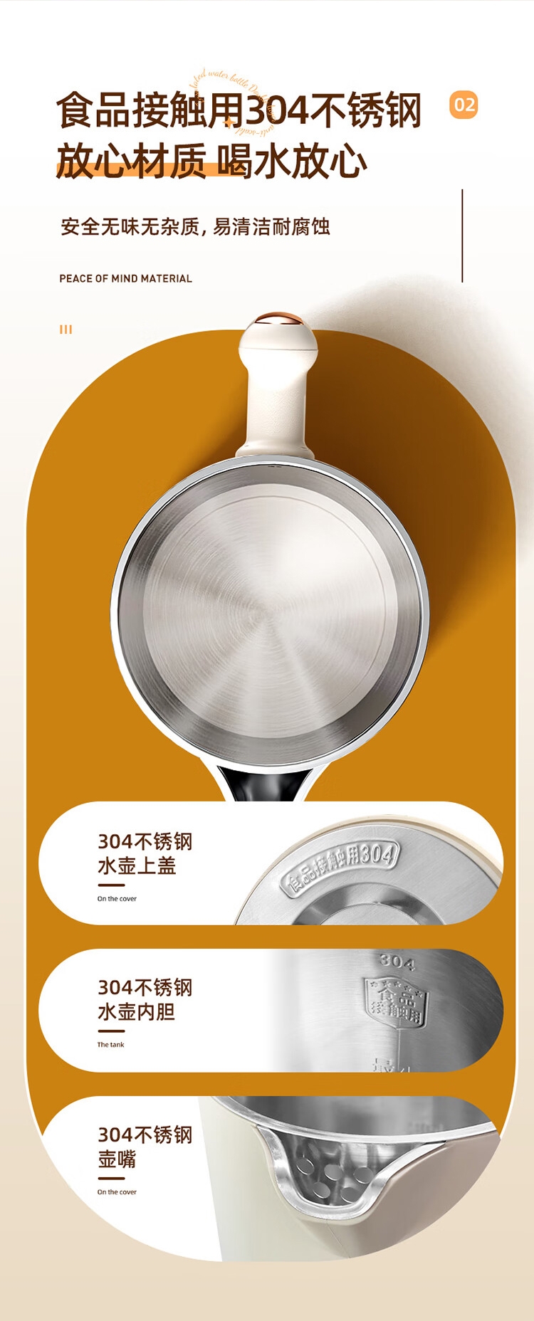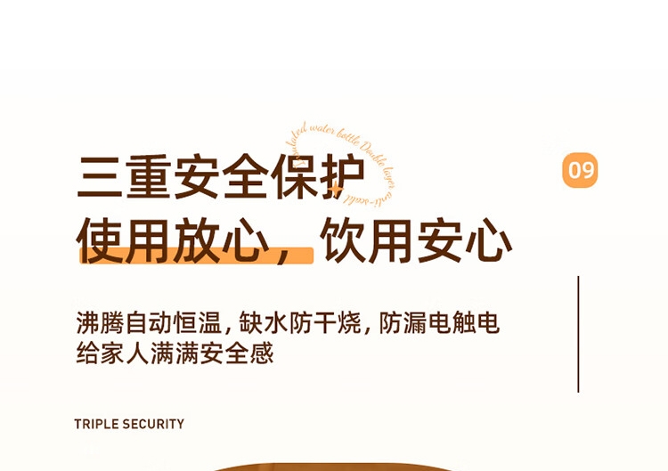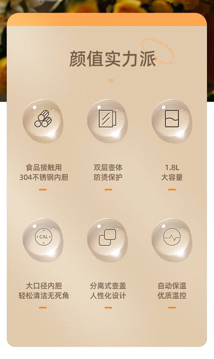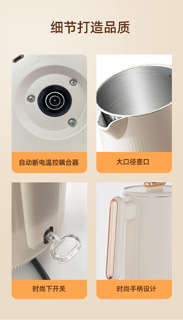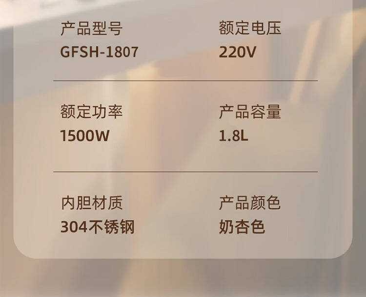 配置清单:1、额定电压:220V 2、功率:1500W 3、容量:1.8L 4、材质:304不锈钢 5、颜色:奶杏色