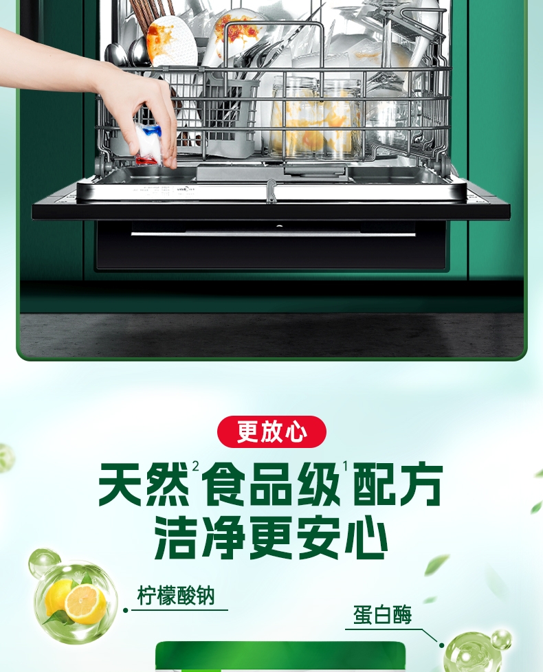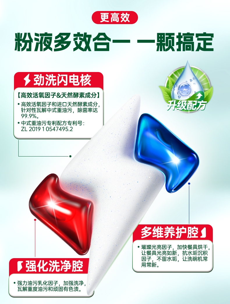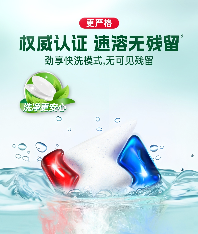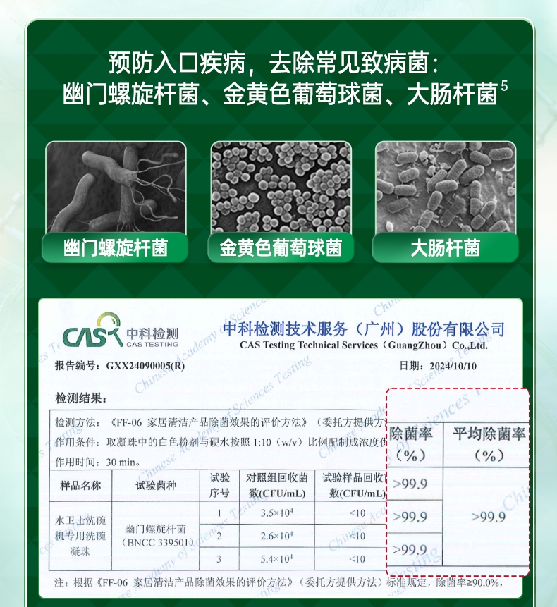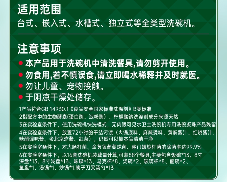 速溶配方,快洗超净;凝胶形态,溶解迅速;食品级1天然2酵素洁净配方;团灭入口害菌,除菌率99.9%;