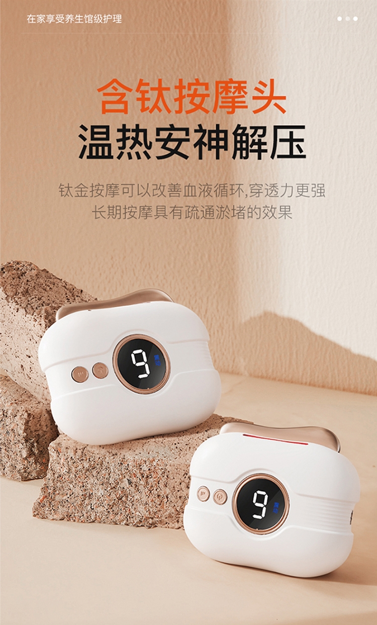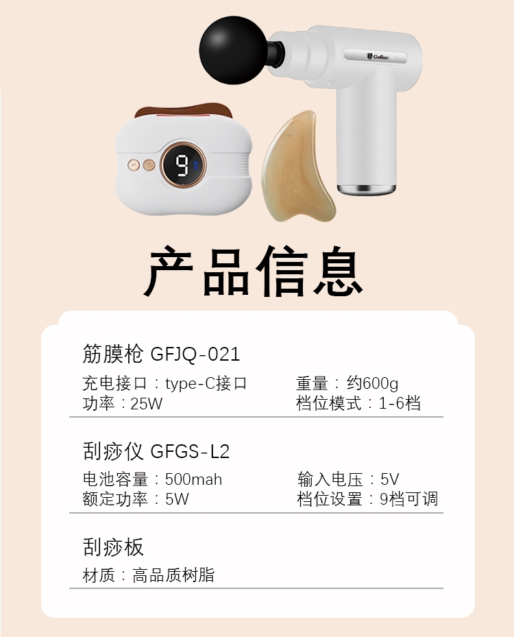 配置清单:筋膜枪GFJQ-021 1、充电接口:type-C接口 2、功率:25W 3、档位模式:1-6档 刮痧仪GFGS-L2 1、电池容量:500mah 2、额定功率:5W 3、档位设置:9档可调 刮痧板 1、材质:高品质树脂