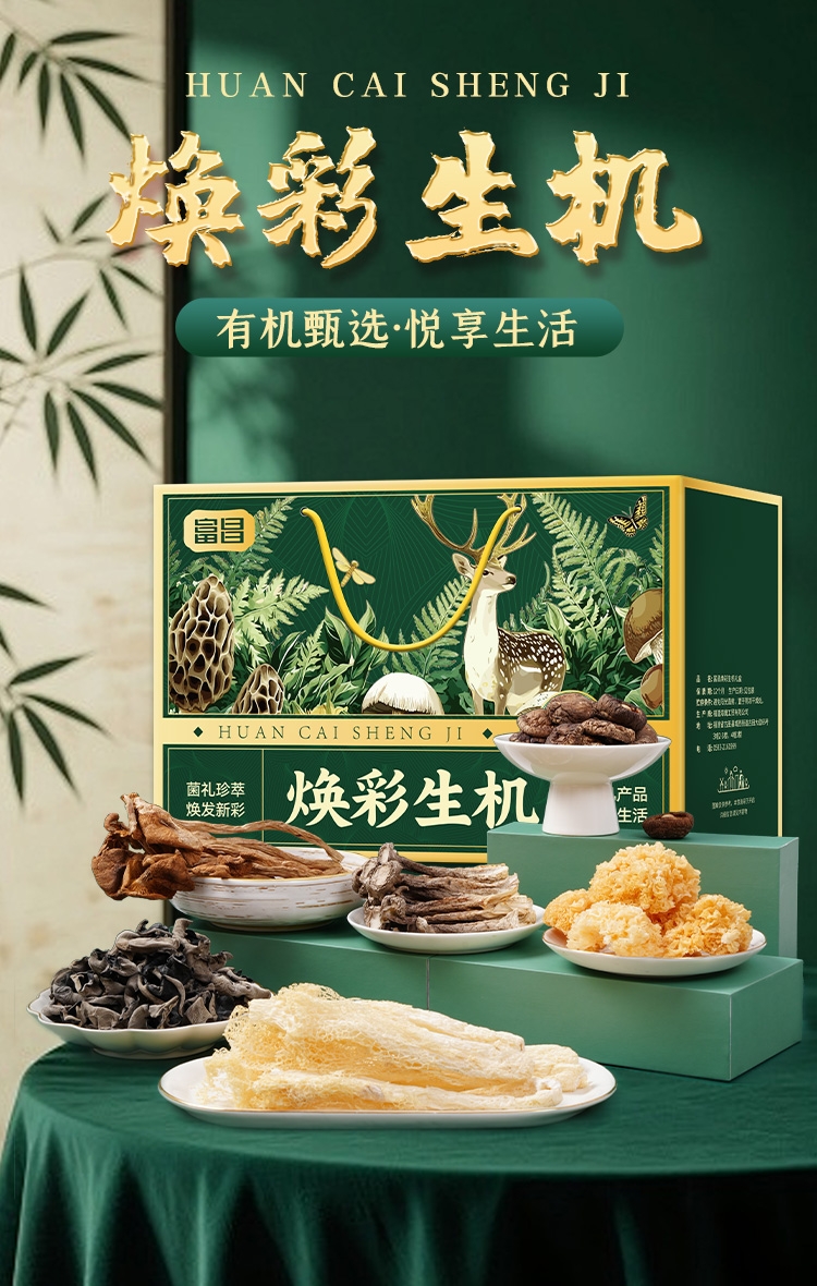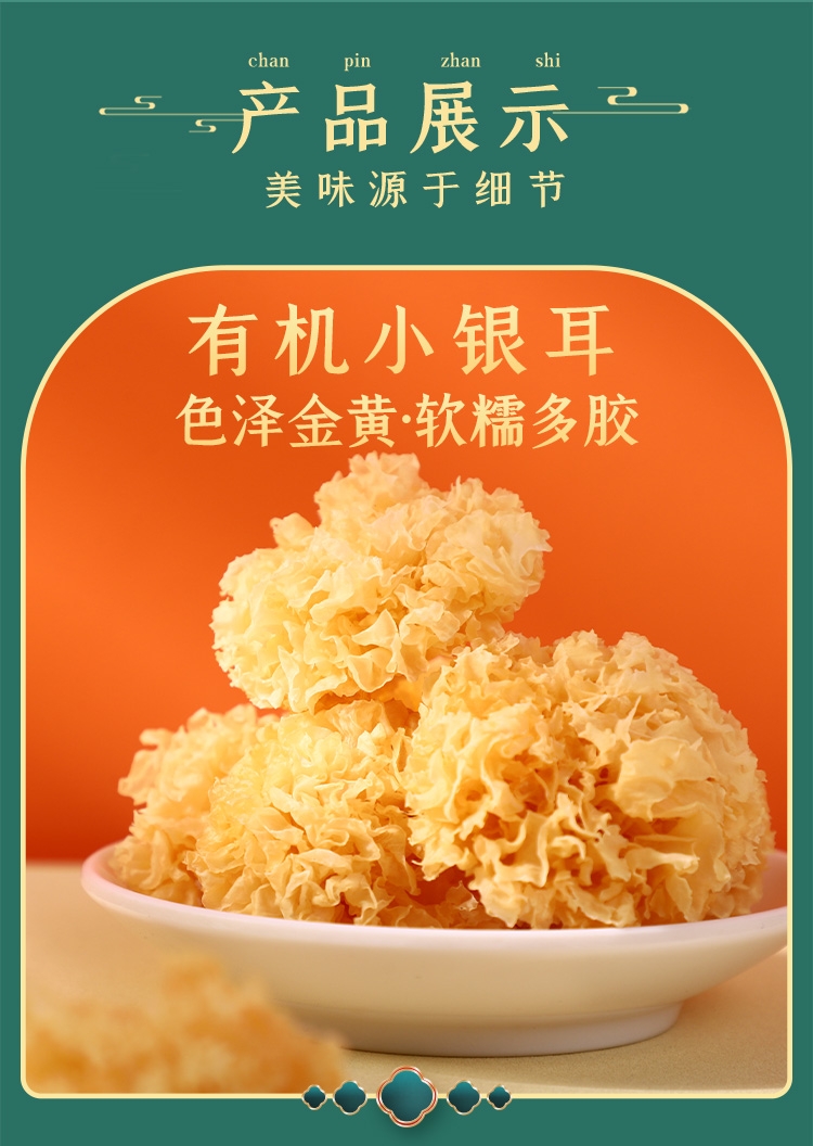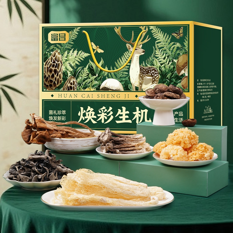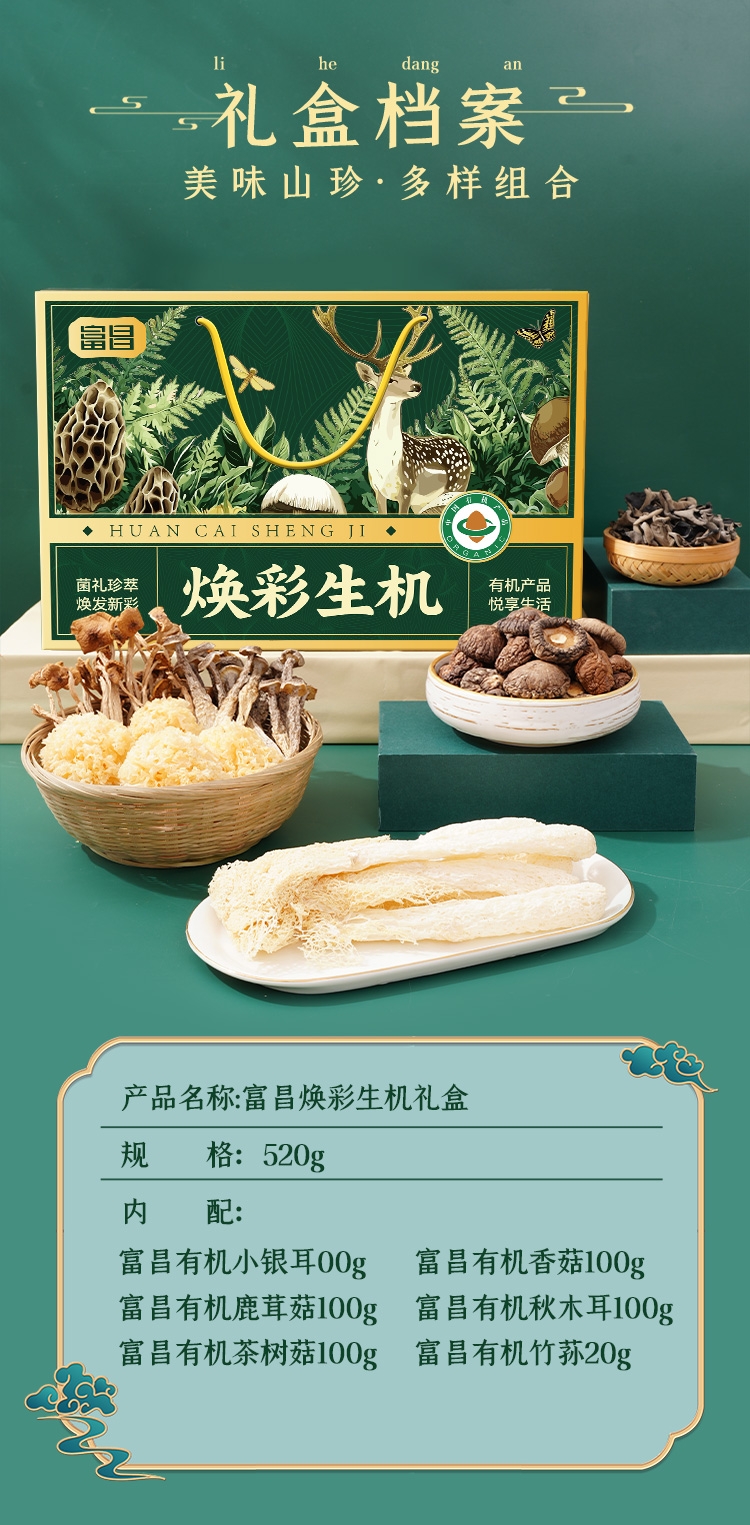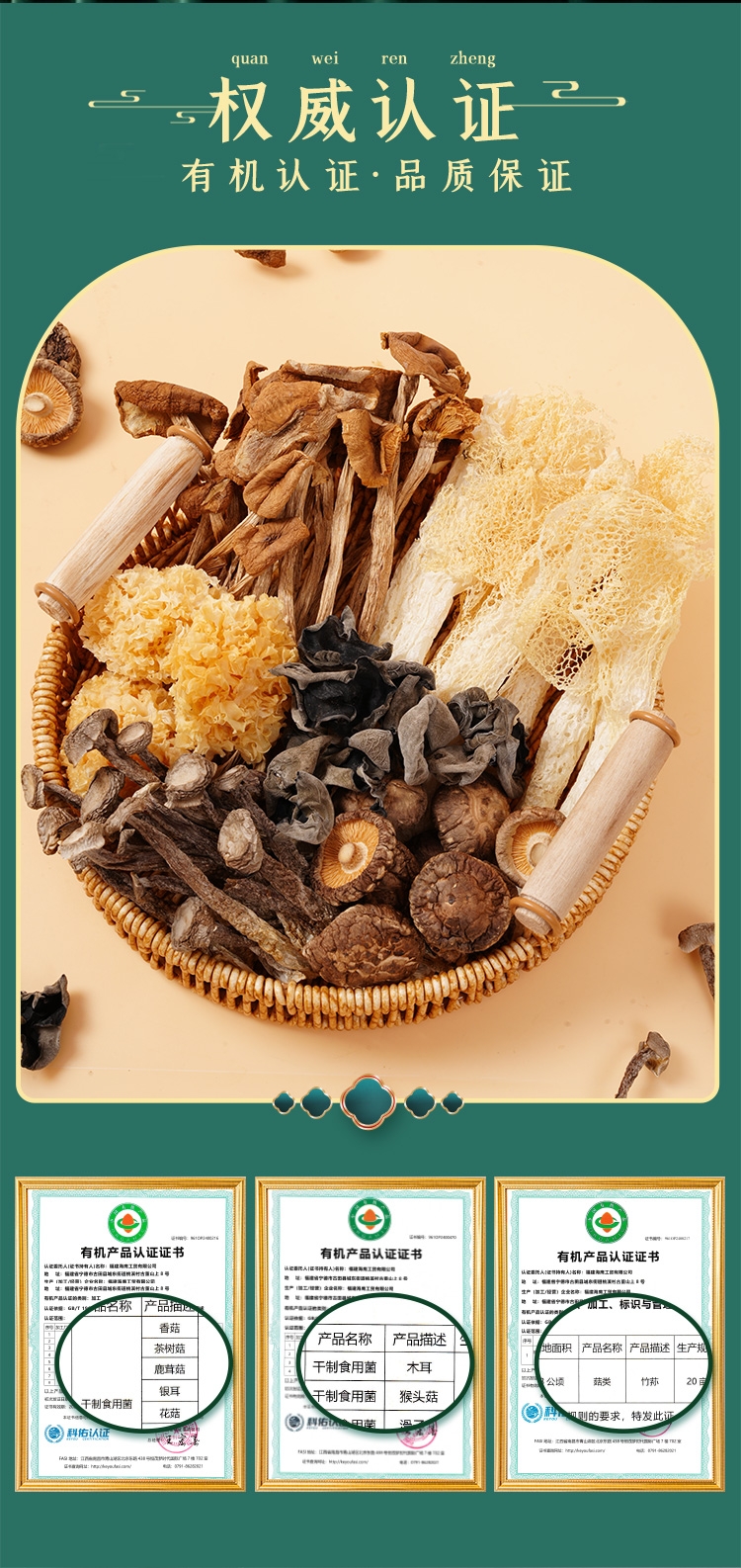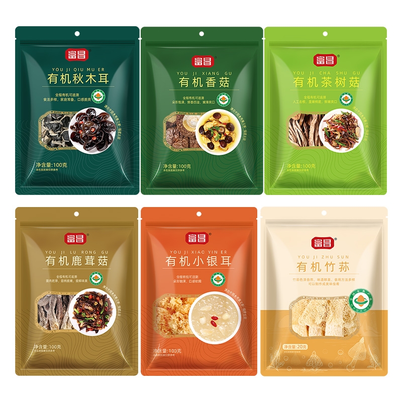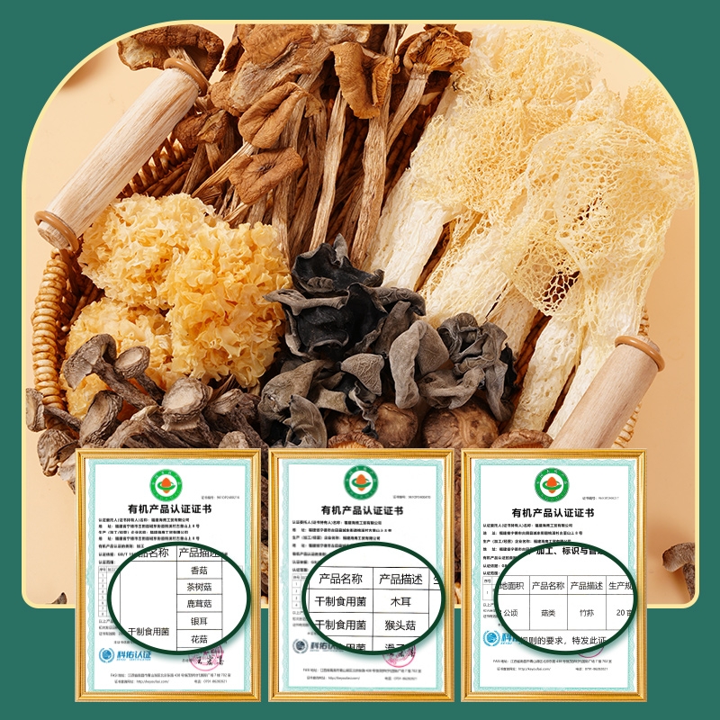 配置清单:富昌有机小银耳100g 富昌有机鹿茸菇100g 富昌有机茶树菇100g 富昌有机香菇100g 富昌有机秋木耳100g 富昌有机竹荪20g