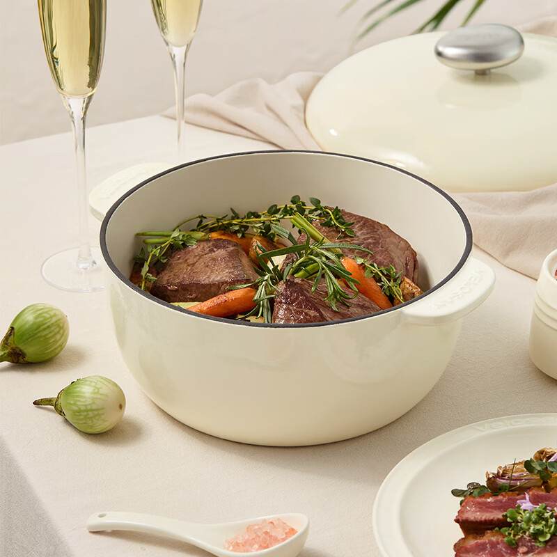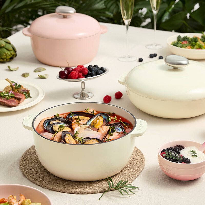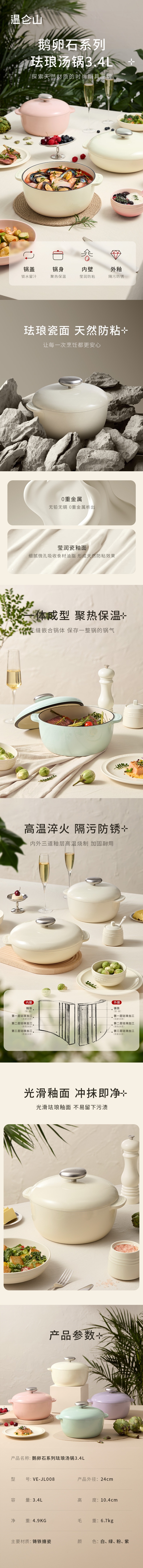 优选珐琅,高颜值,易清洁;微压烹饪,锁住营养;水汽自循环,保留鲜味
