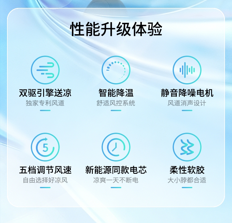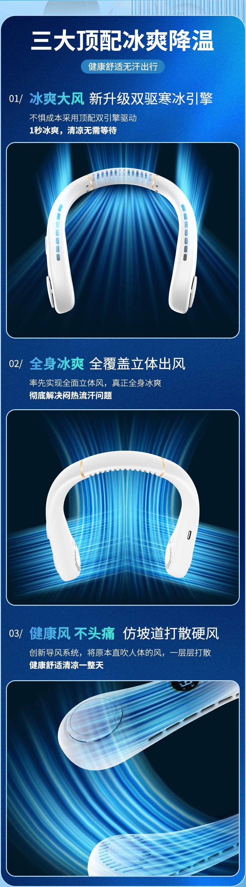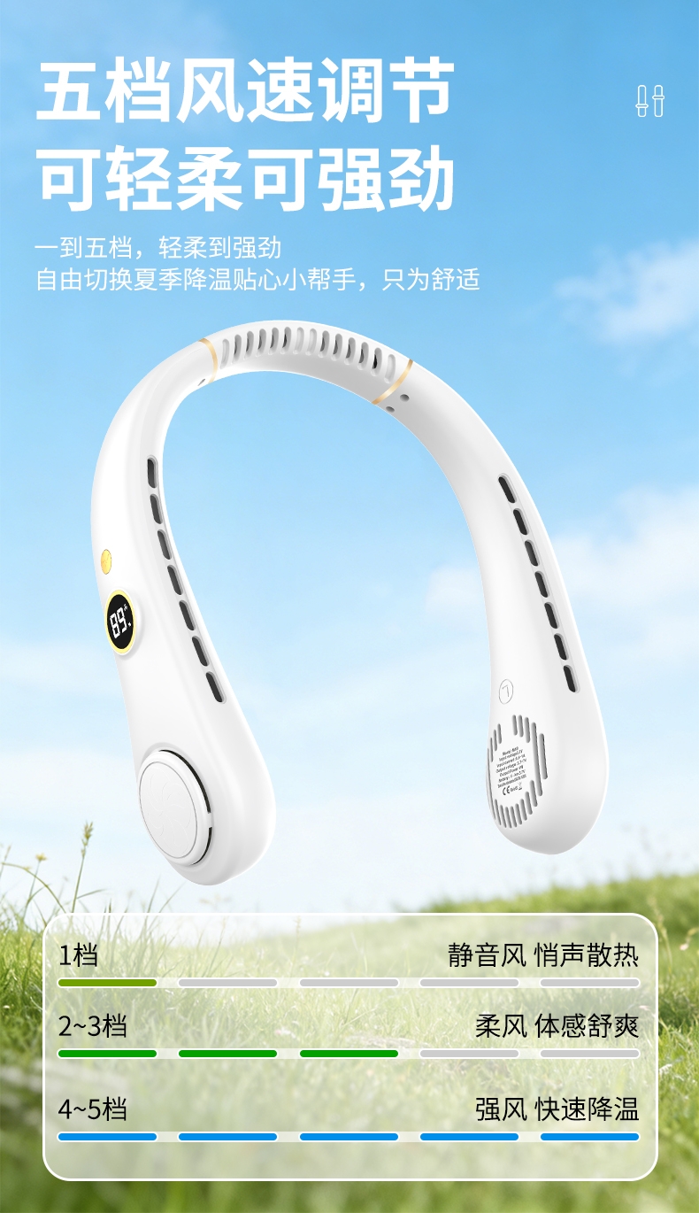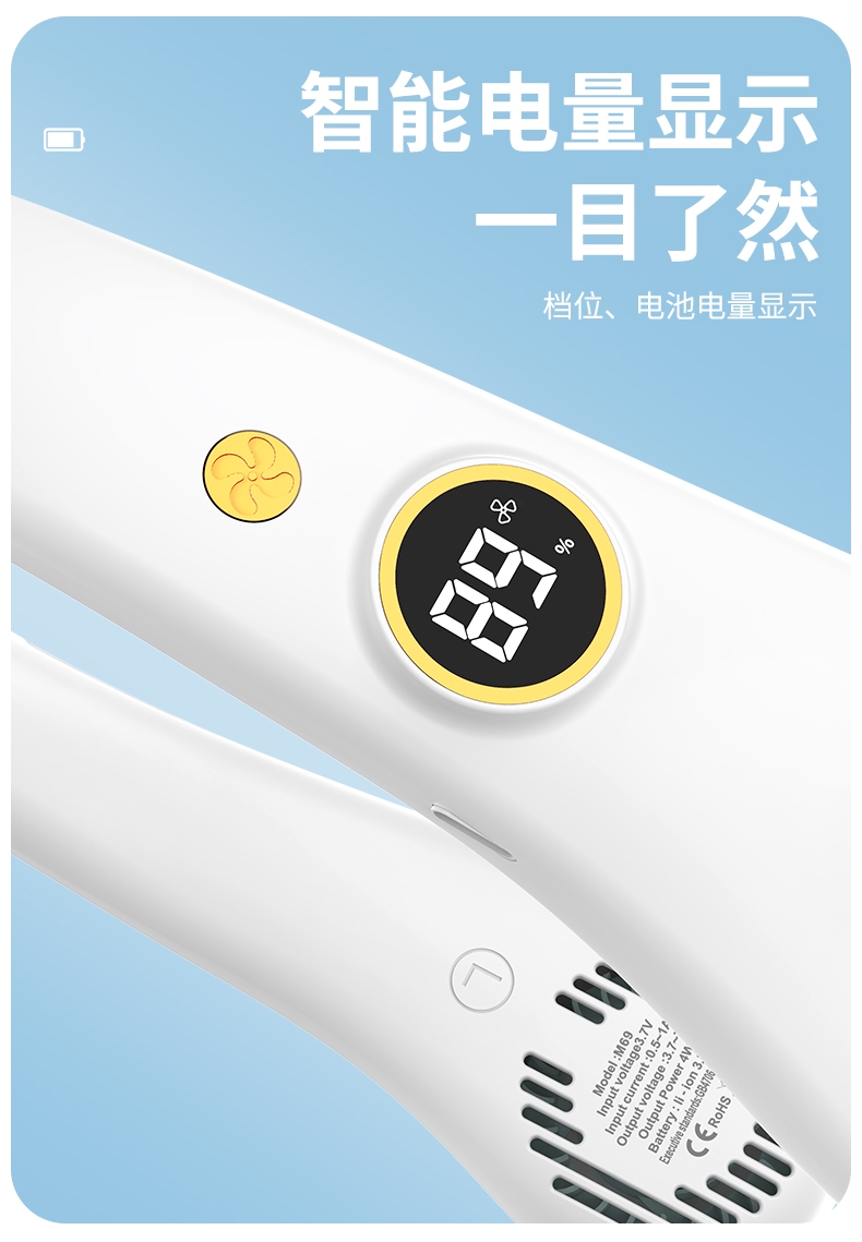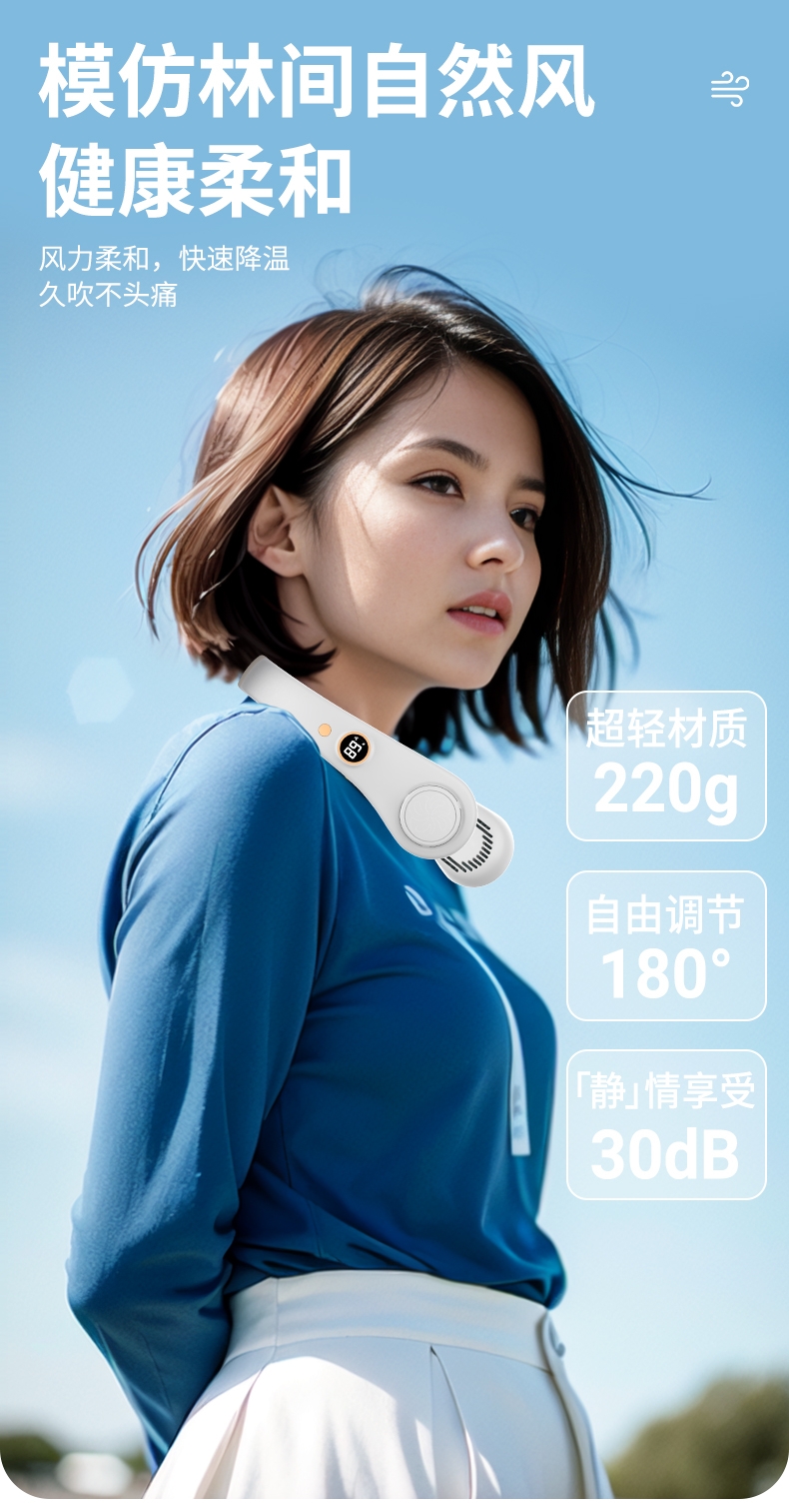 多档风速调节,定制专属清凉;静音舒适设计,畅享无扰清凉;无叶送风设计,向绞发Saygoodbay;智能数显黑科技,告别盲目使用
