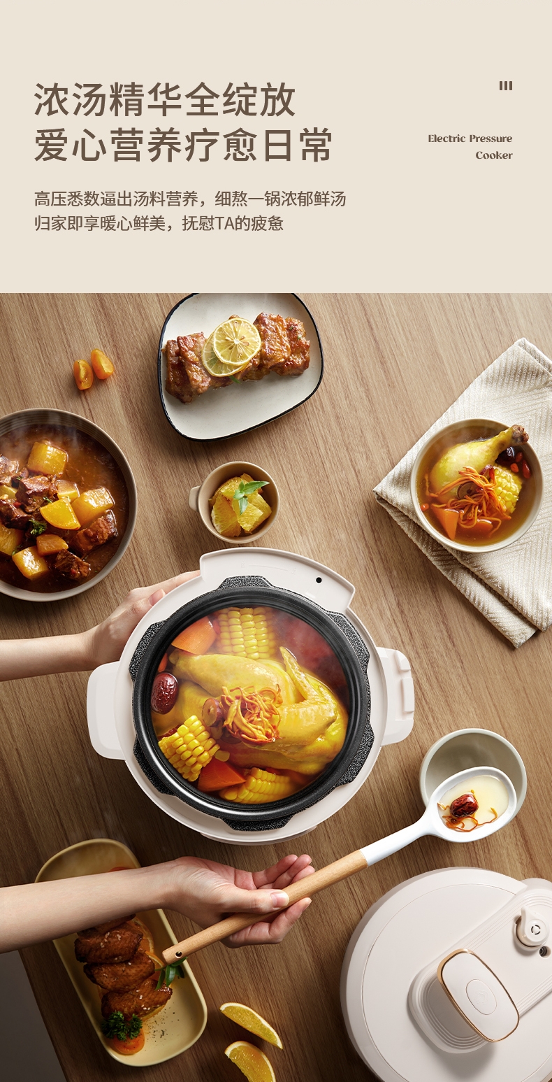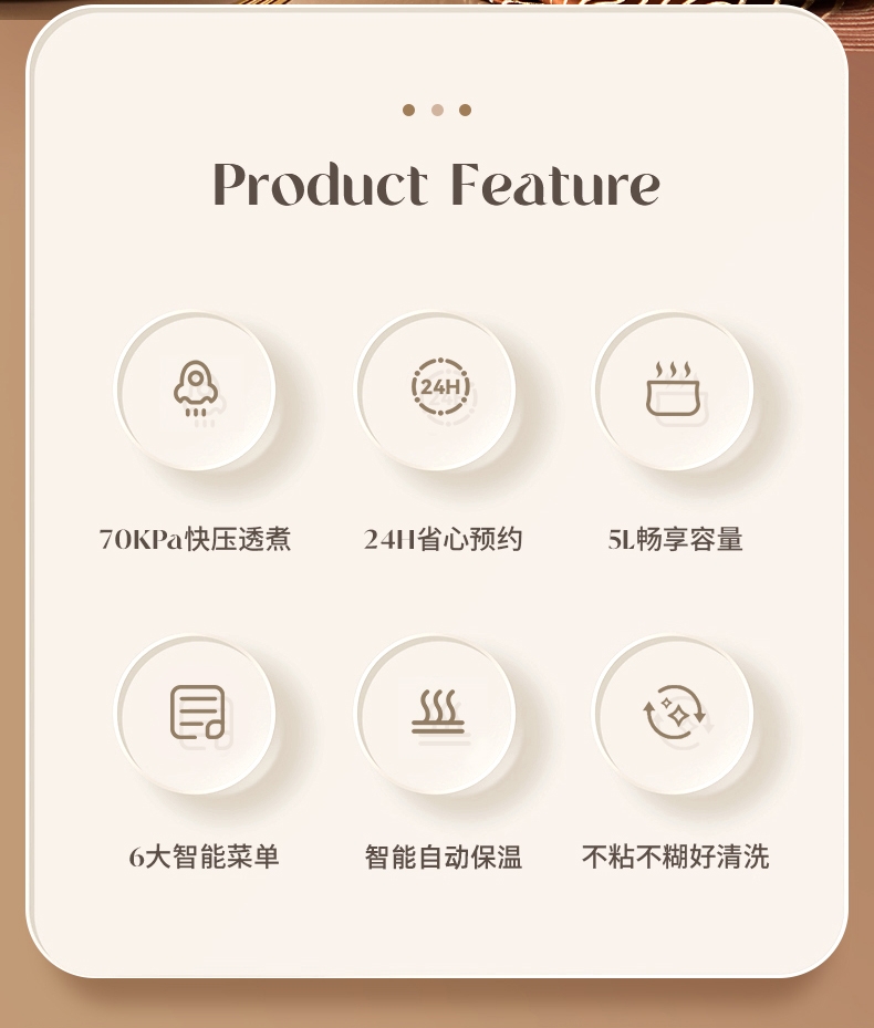 微压设计,使用放心安全;24H智能预约,全自动烹饪;六大功能菜单,百式美味不重样