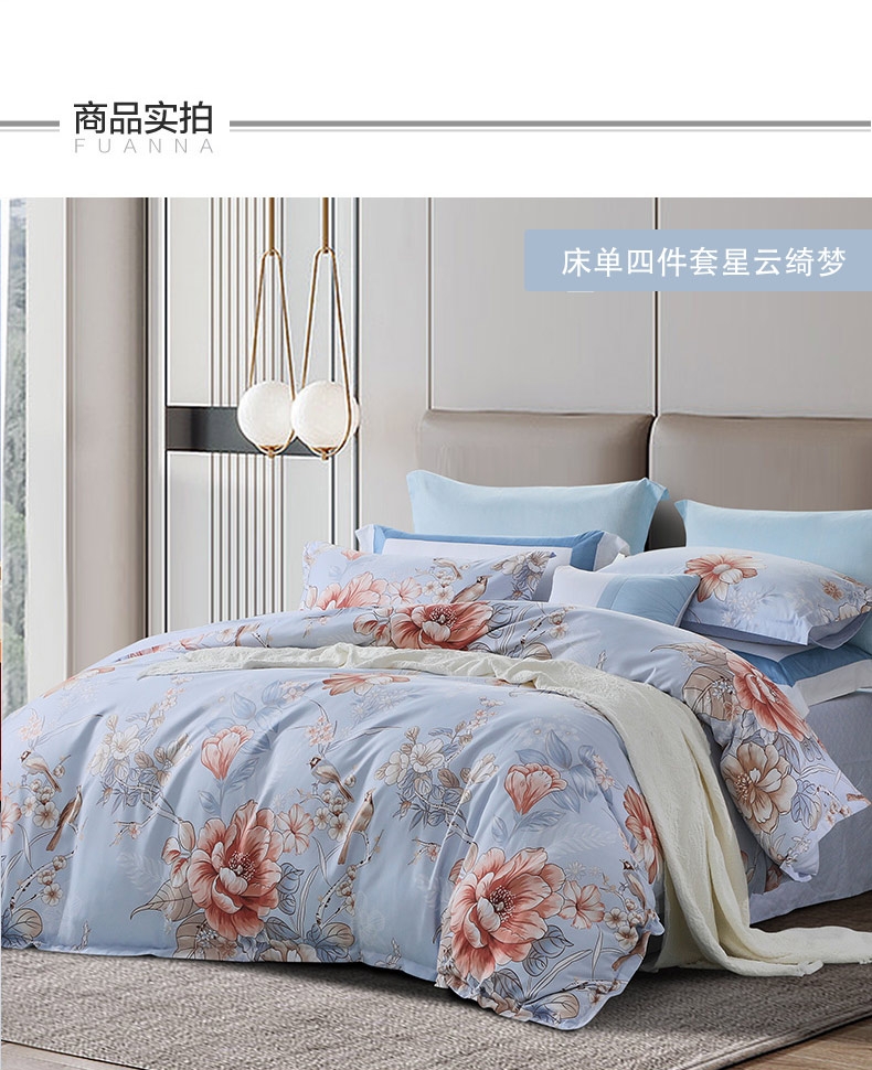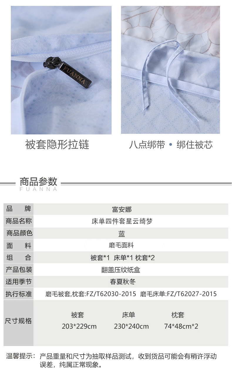 配置清单:【产品材质】磨毛印花 (100%聚酯纤维) 【产品规格】1.5 /1.8m床 被套203*229cm*1件 床单230*240cm*1件 枕套74*48cm*2件