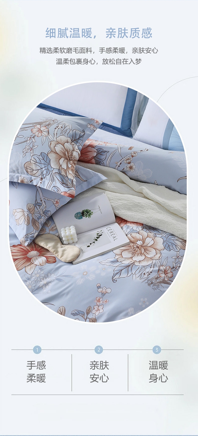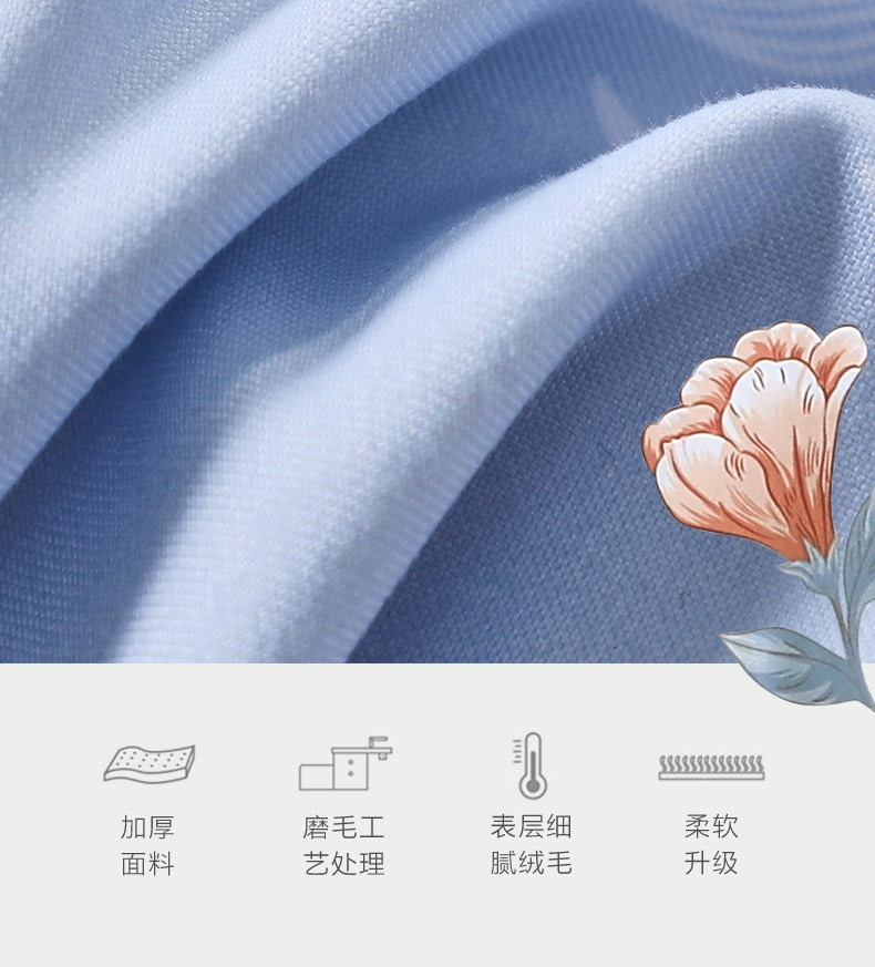 好磨毛一触即暖 面料经过两次打磨处理,在表面会形;原创设计更独特 原创印花,鲜活印染,花型更立体,