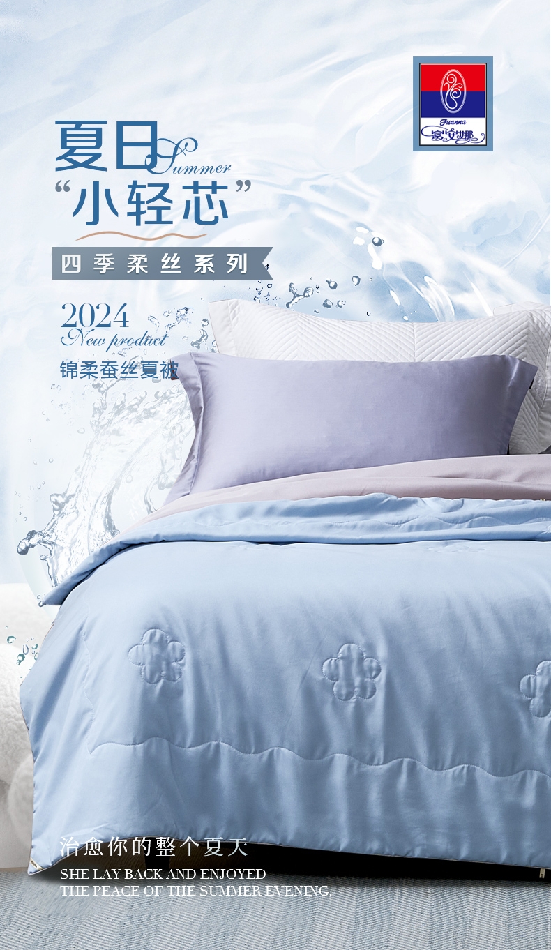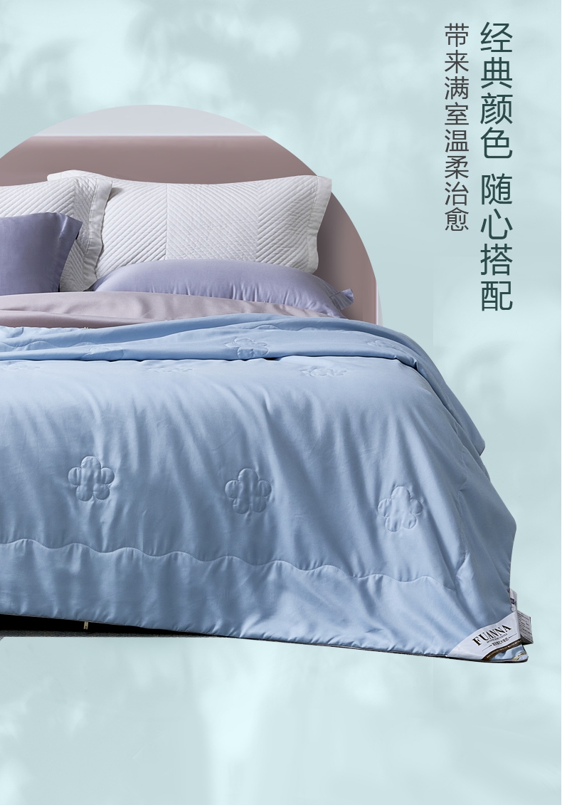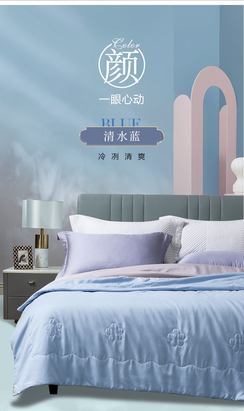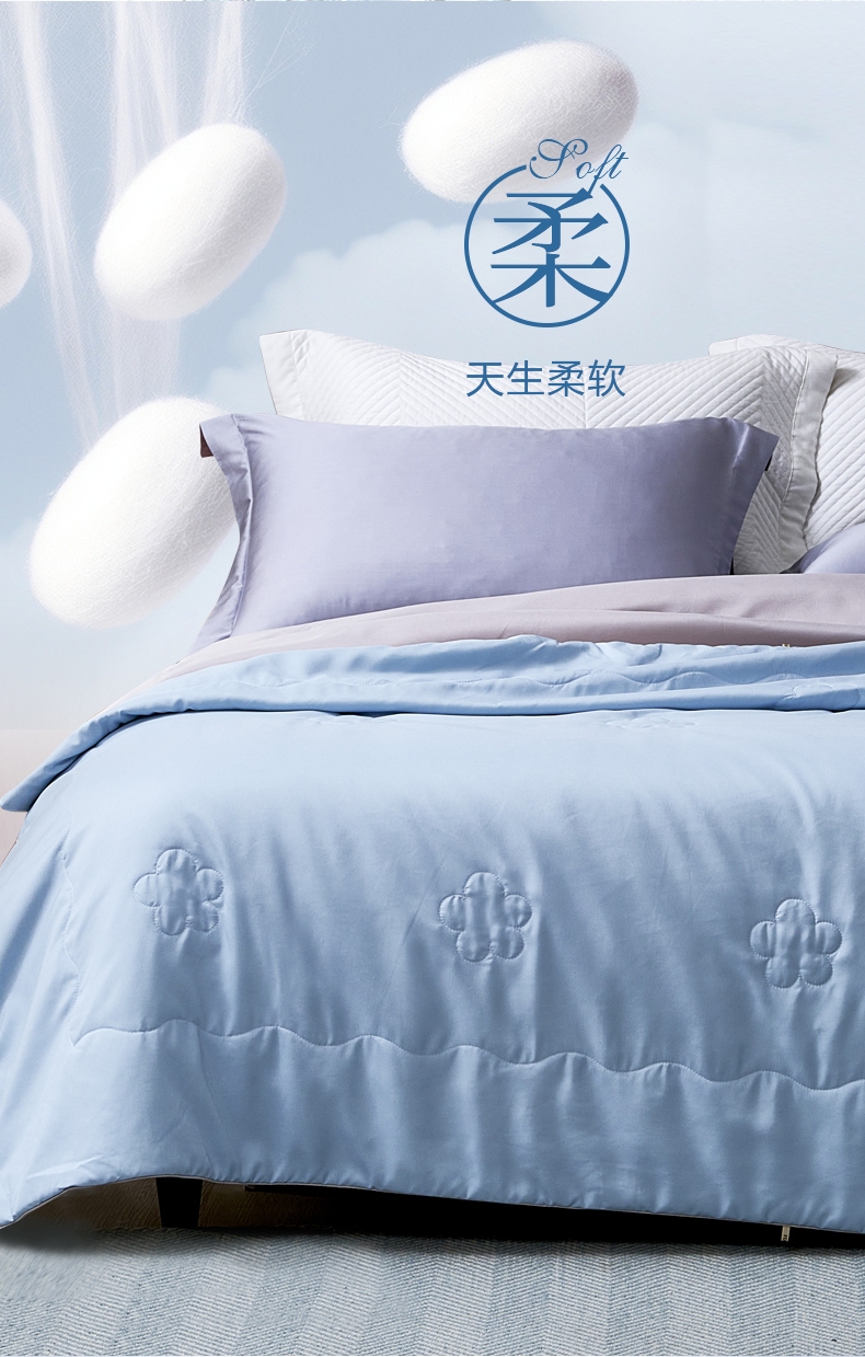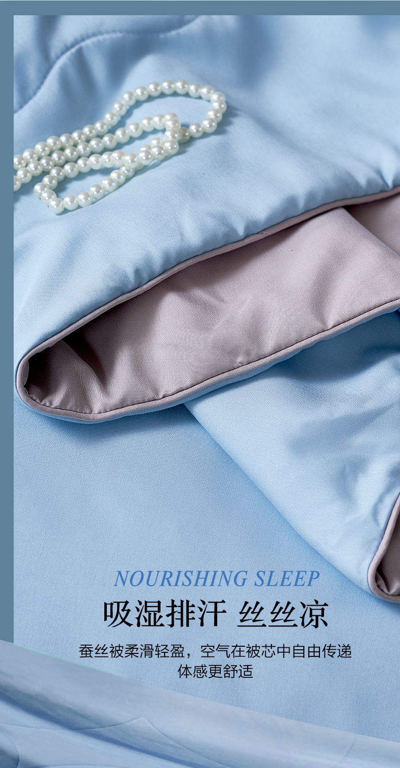 好蚕丝 集轻,柔,细为一体的蚕丝,素有人体“第二皮;精选磨毛好面料 沁凉浅蓝色的磨毛印花面料,手接触肌