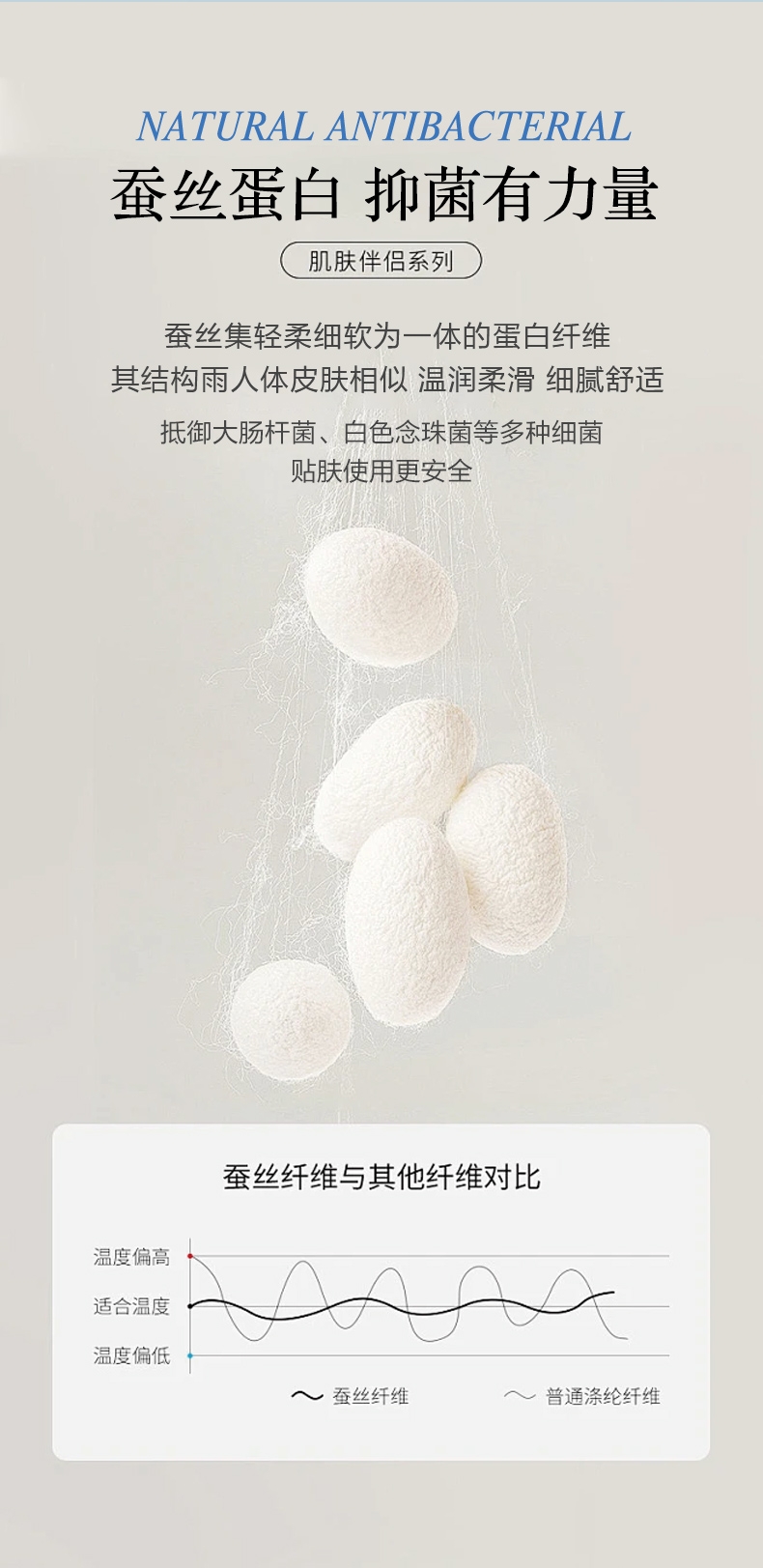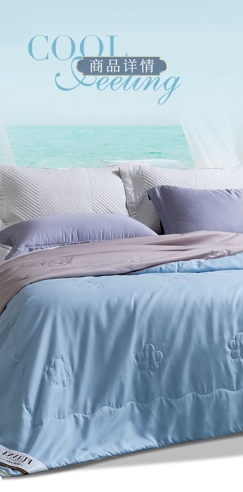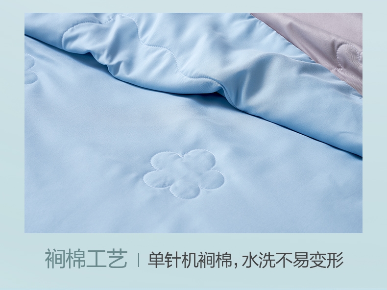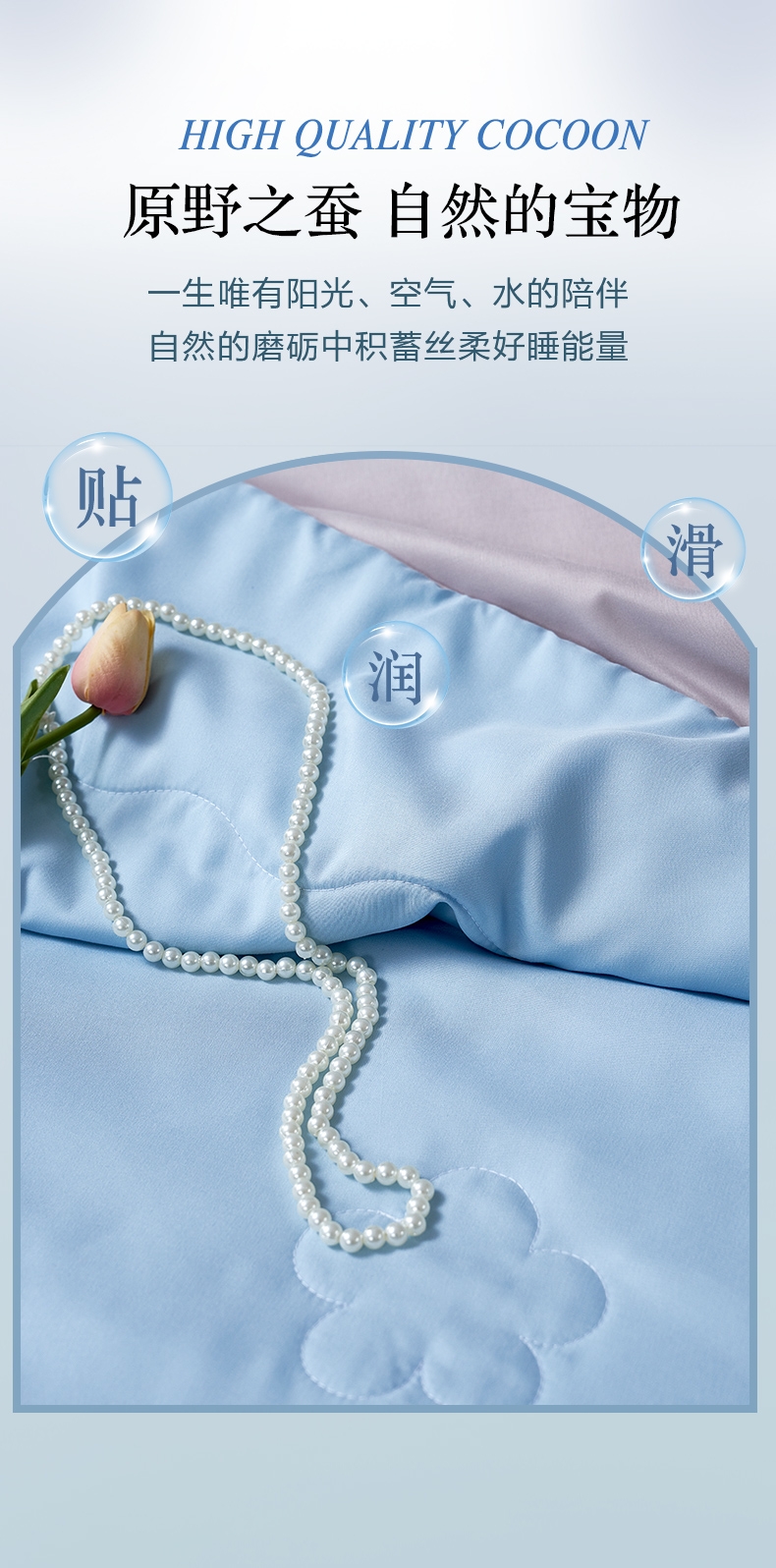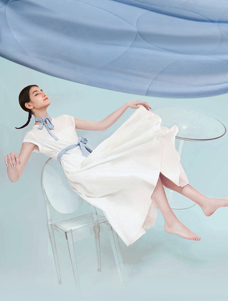 好蚕丝 集轻,柔,细为一体的蚕丝,素有人体“第二皮;精选磨毛好面料 沁凉浅蓝色的磨毛印花面料,手接触肌