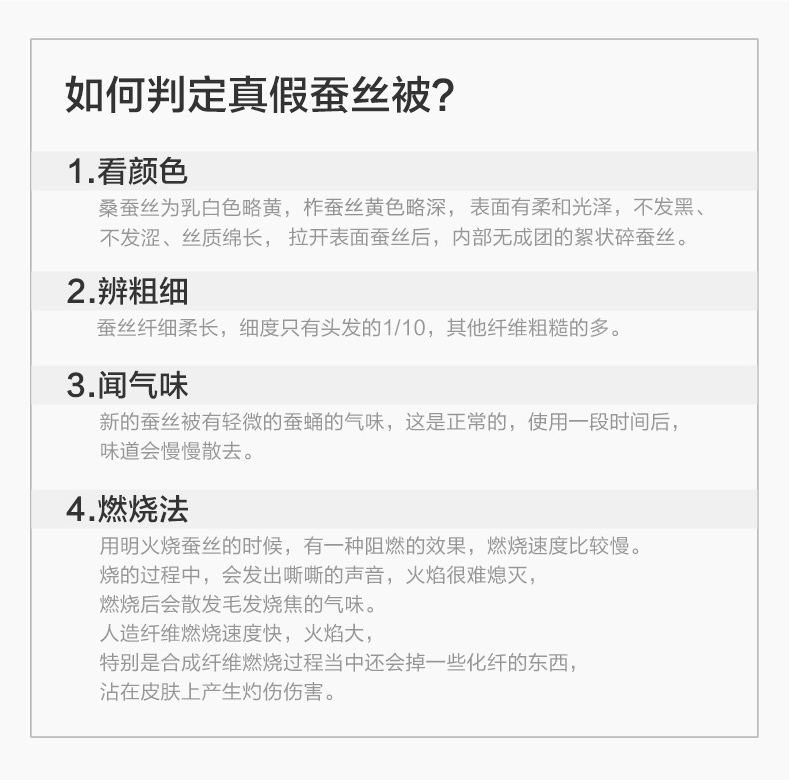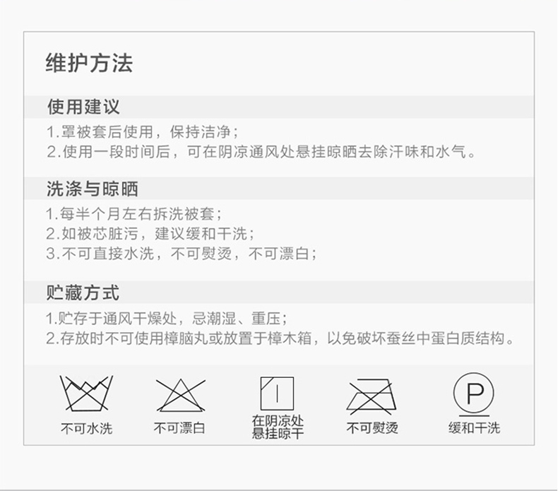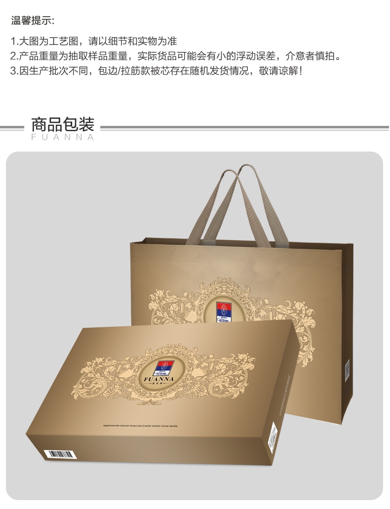 配置清单:【产品面料】全涤磨毛印花 【产品填充】100%柞蚕丝( 中长丝) 【产品规格】203*229cm(400g) 【产品重量】毛重约2.5kg 净重约1.5kg 【包装尺寸】天地盖礼盒55x35x8cm 【每箱数量】5床
