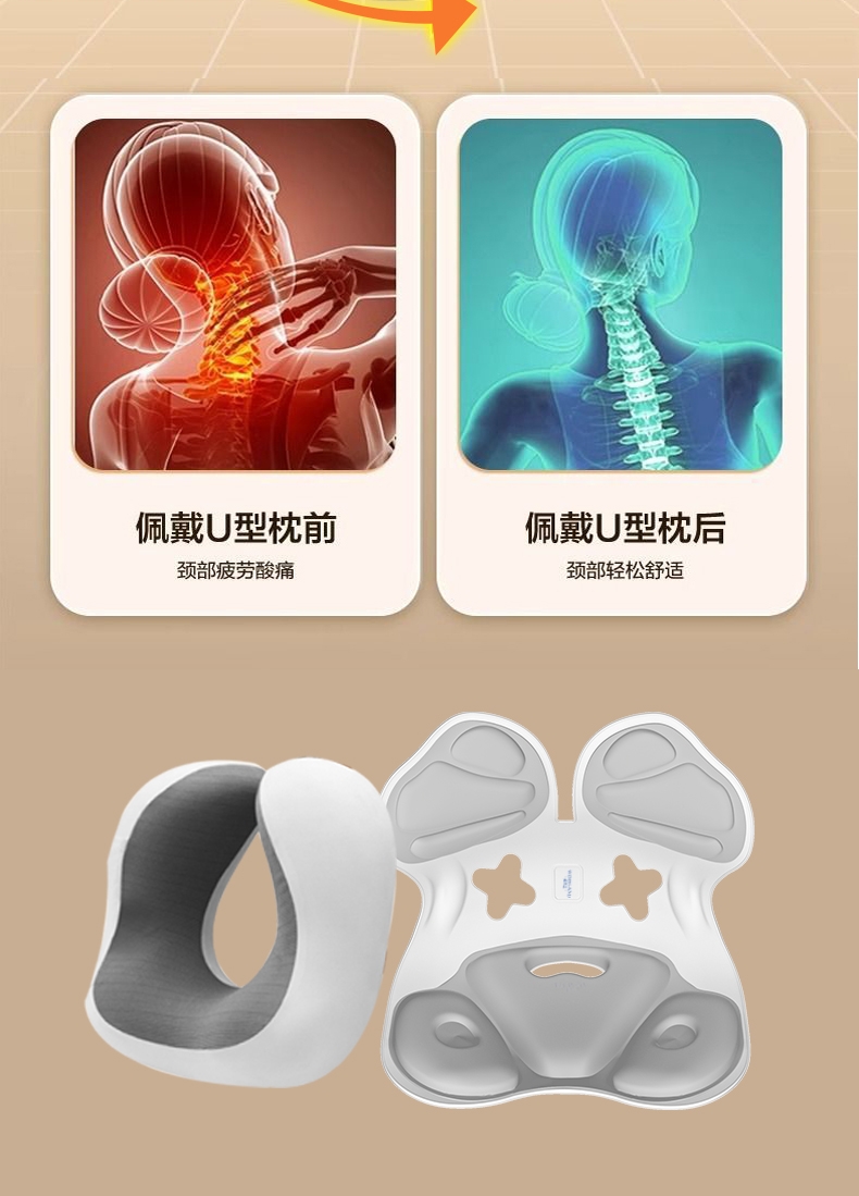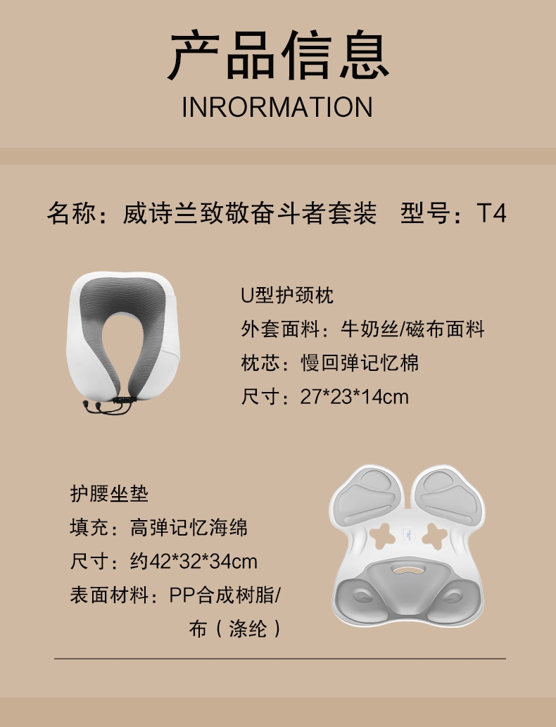 配置清单:1、护腰坐垫WL-Y05 表面材料:PP合成树脂/布(涤纶) 填充:高弹记忆海绵 尺寸:约42*32*34cm 2、U型护颈枕WL-Y06 外套面料:牛奶丝/磁布面料 枕芯:慢回弹记忆棉 尺寸:27*23*14cm