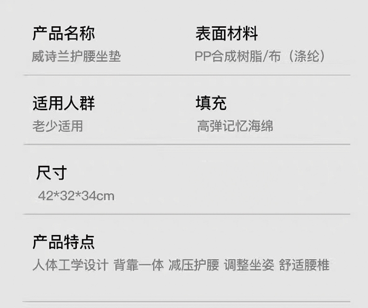 配置清单:护腰坐垫 表面材料:PP合成树脂/布(涤 填充:高弹记忆海绵 尺寸:约42*32*34cm