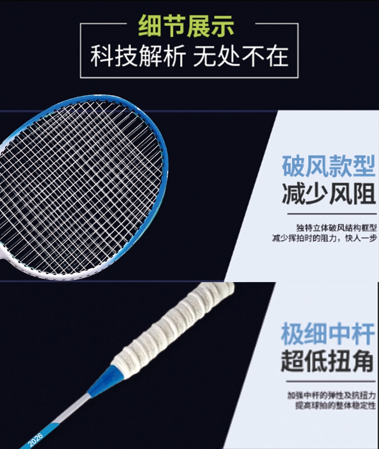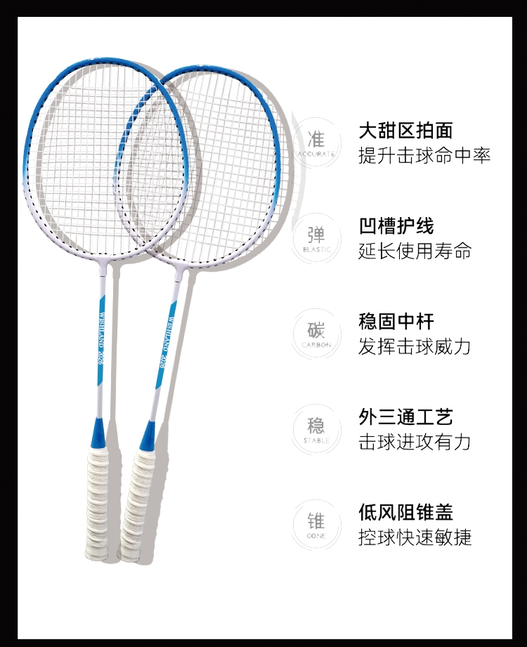 拍框线孔平滑拱形设计,有效减小线的压力并提高耐用度;方形拍框,大幅度提升击球面积,受力均匀,提升击球准