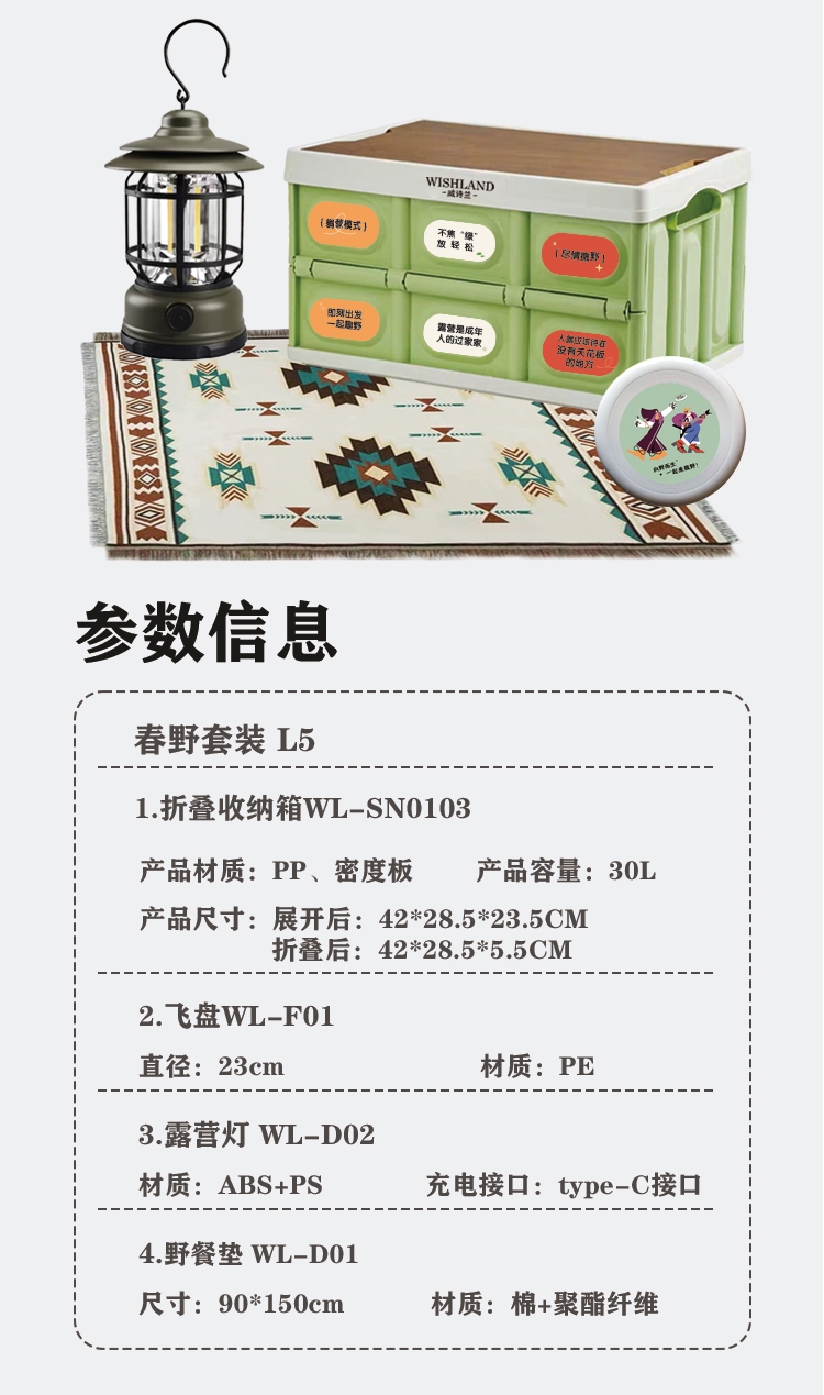 配置清单:1、折叠收纳箱WL-SN0103 产品材质:PP、密度板 产品容量:30L 产品尺寸:展开后:42*28.5*23.5CM 折叠后:42*28.5*5.5CM 2、飞盘 WL-F02 直径:23cm 材质:PE 3、露营灯 WL-D02材质:ABS+PS 充电接口:type-C接口4、野餐垫 WL-D01 尺寸:90*150cm 材质:棉+聚酯纤维