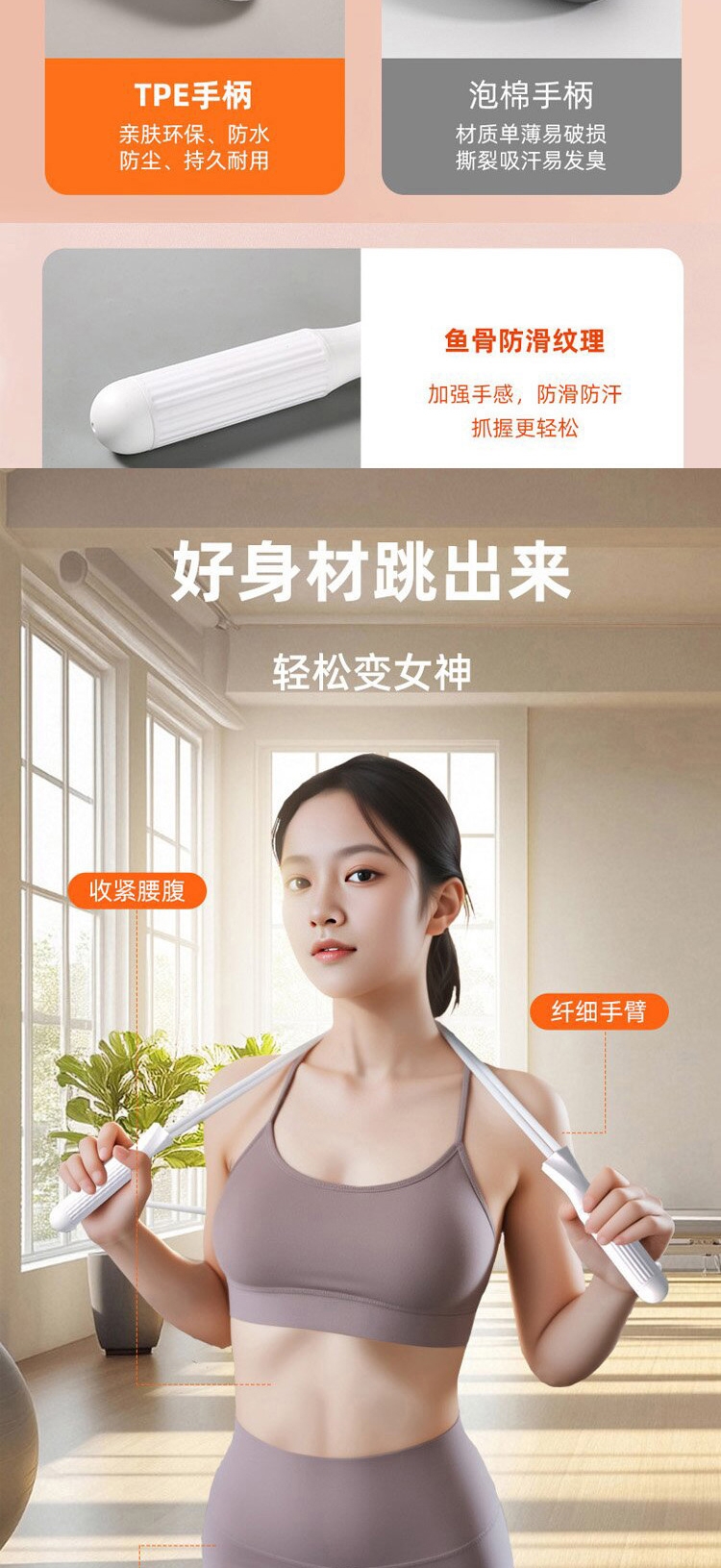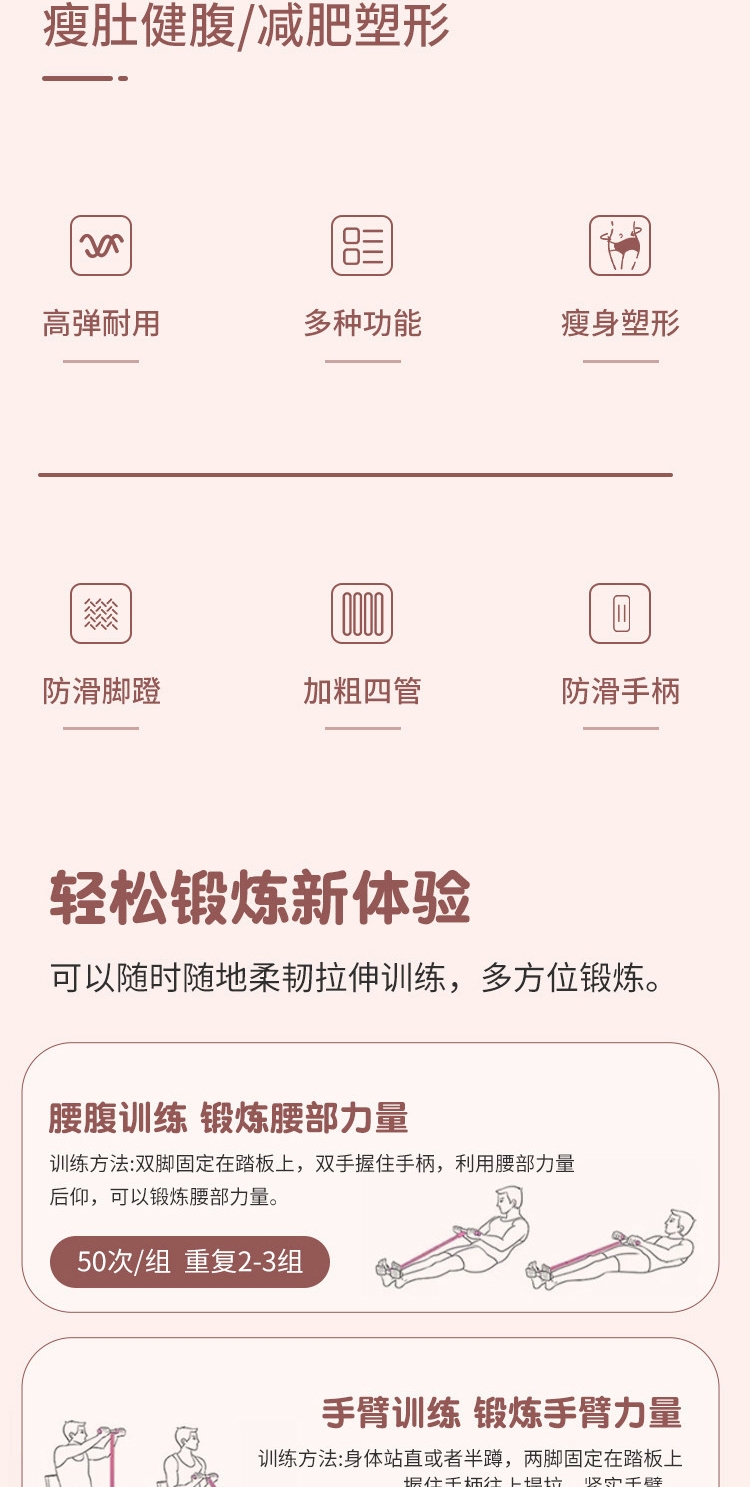 跳绳加粗钢丝绳体,稳定不漂移,内置调节卡扣,可方便;多功能脚蹬拉力器,针对性全身锻炼,打造S型曲线;