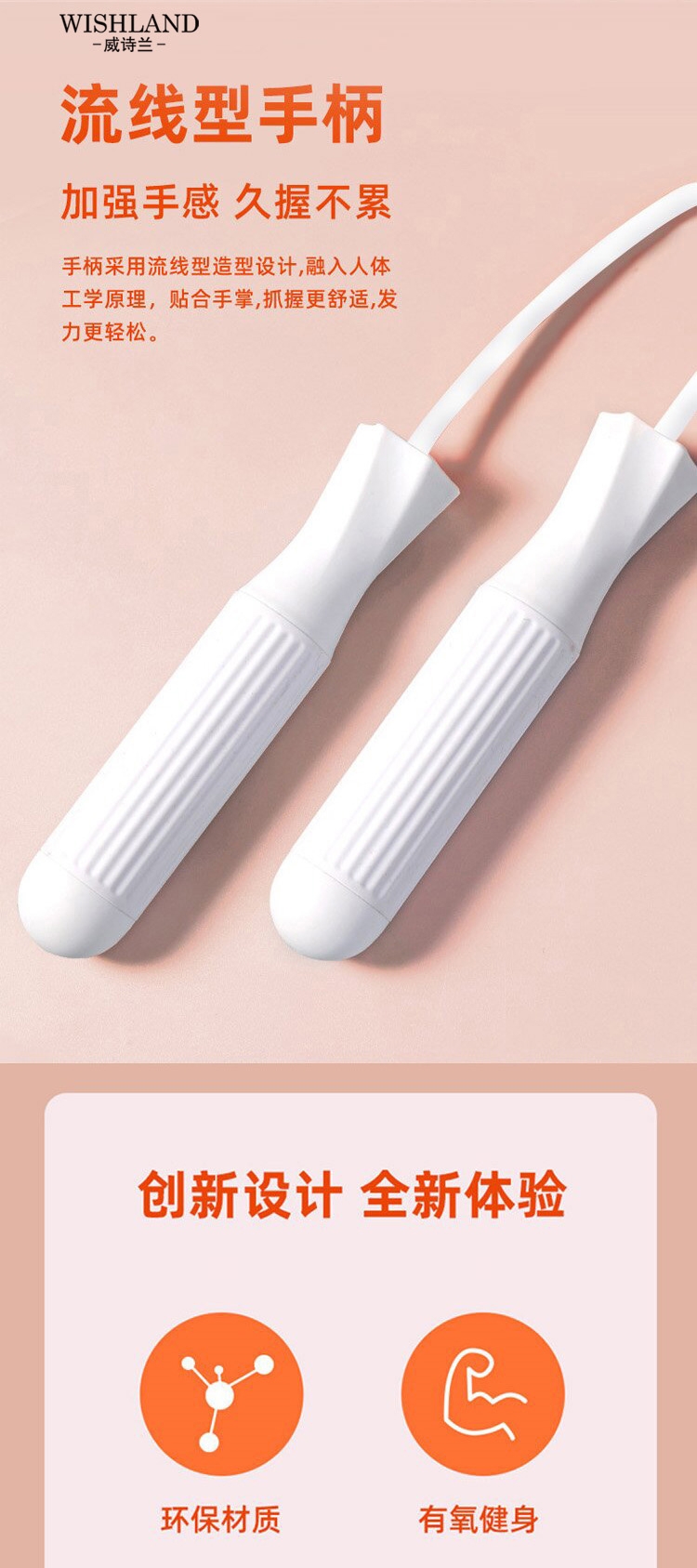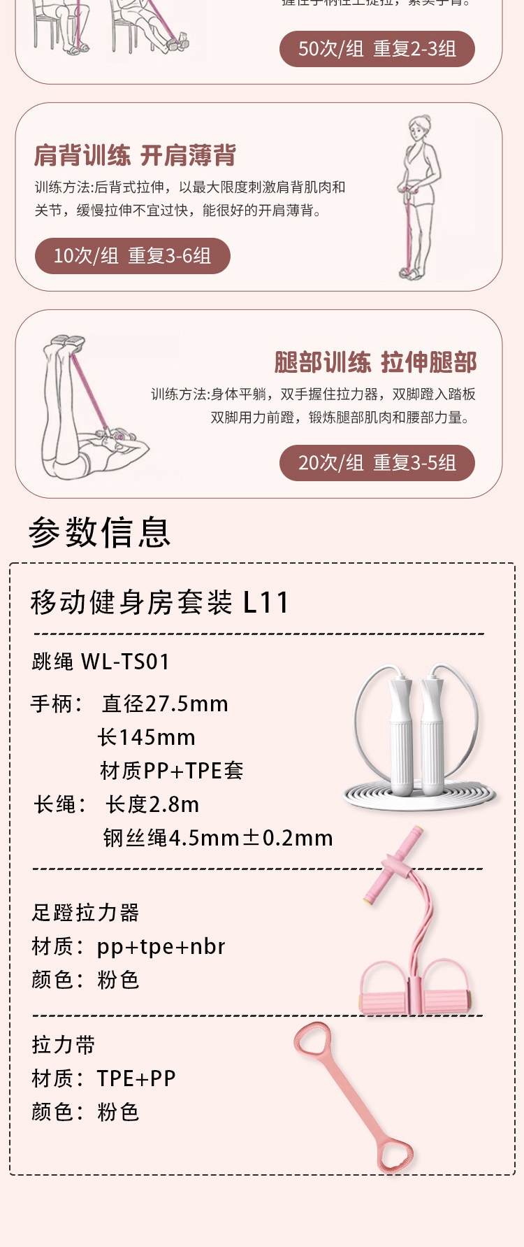 配置清单:1、跳绳 WL-TS01手柄:直径27.5mm,长145mm,材质PP+TPE套 长绳:钢丝绳4.5mm±0.2mm,长度2.8m 2、足蹬拉力器 材质:pp+tpe+nbr颜色:粉色 3、拉力带 材质:TPE+PP颜色:粉色