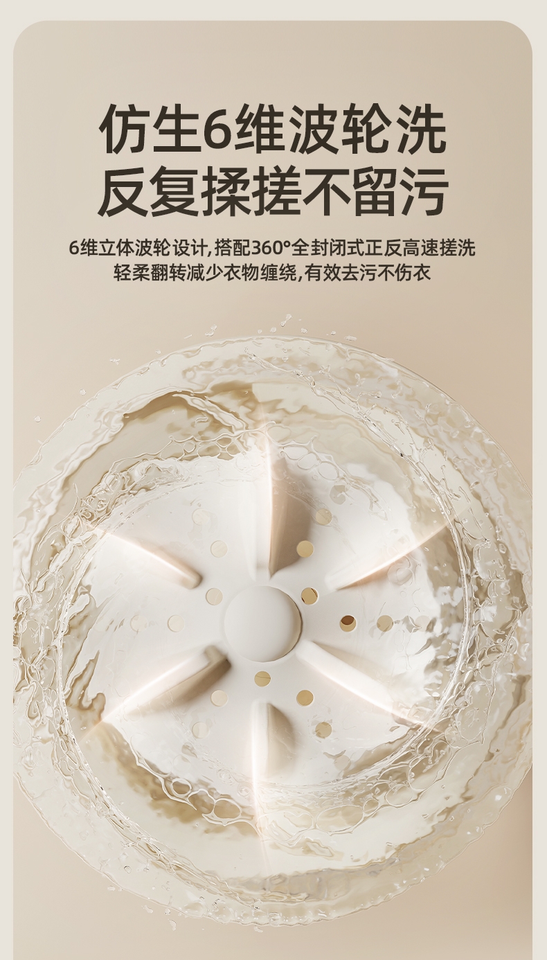 携带方便,家居旅行两不误;6维涡轮旋转,高效去除衣物污渍;换桶设计,洗衣桶能直拆,清洗方便