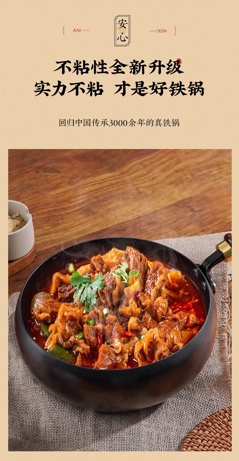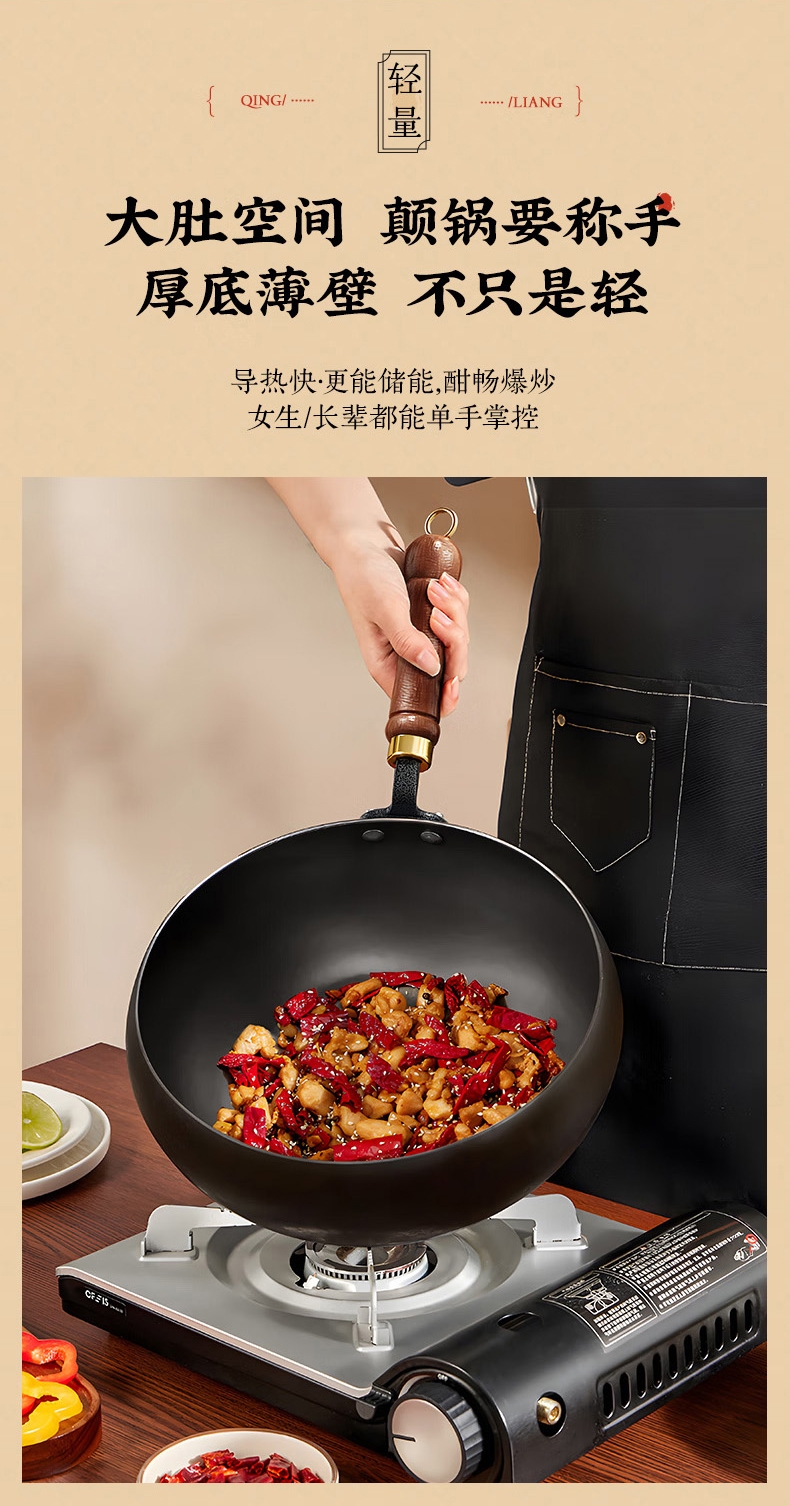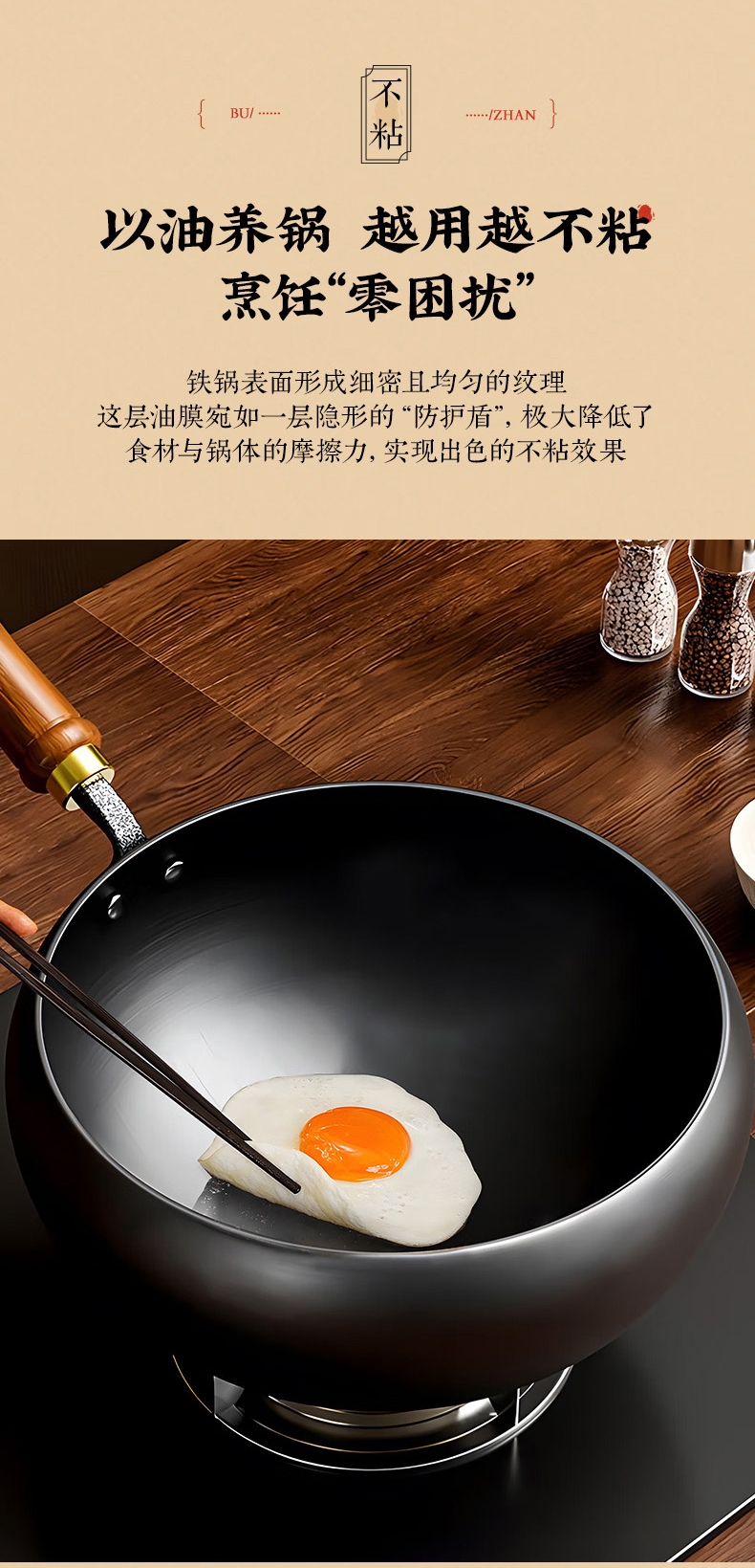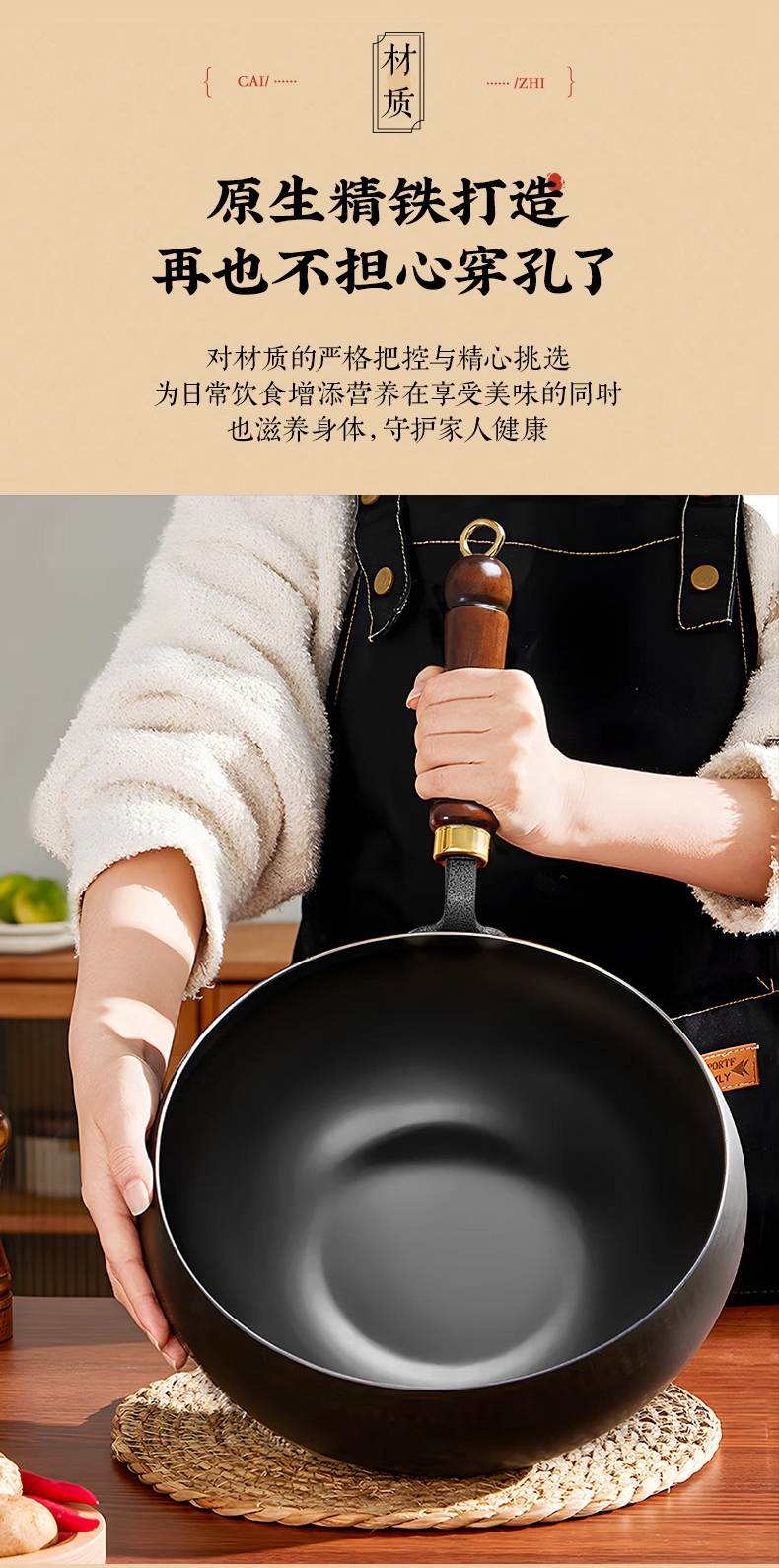 采用国家标准食品接触精铁材质精制而成;不添加任何涂层;锅具适用所有炉具