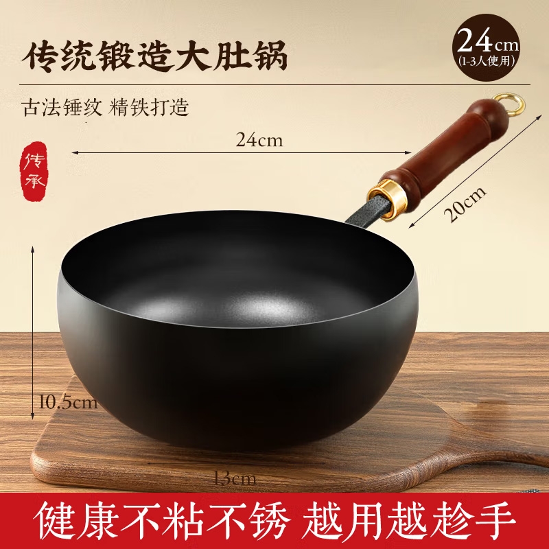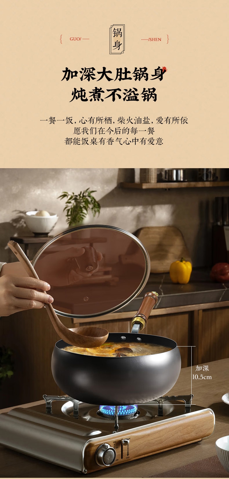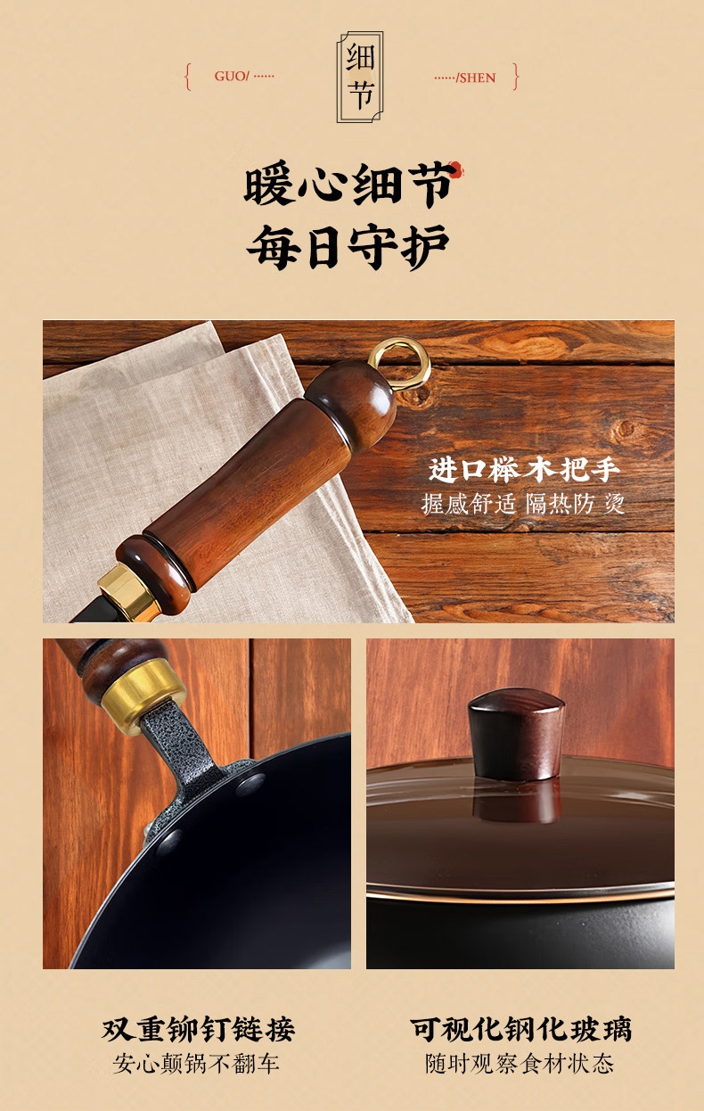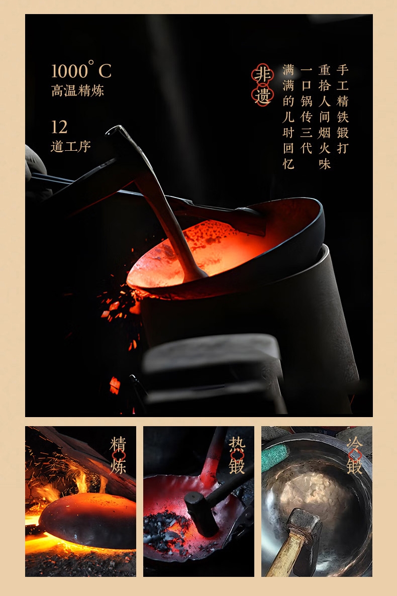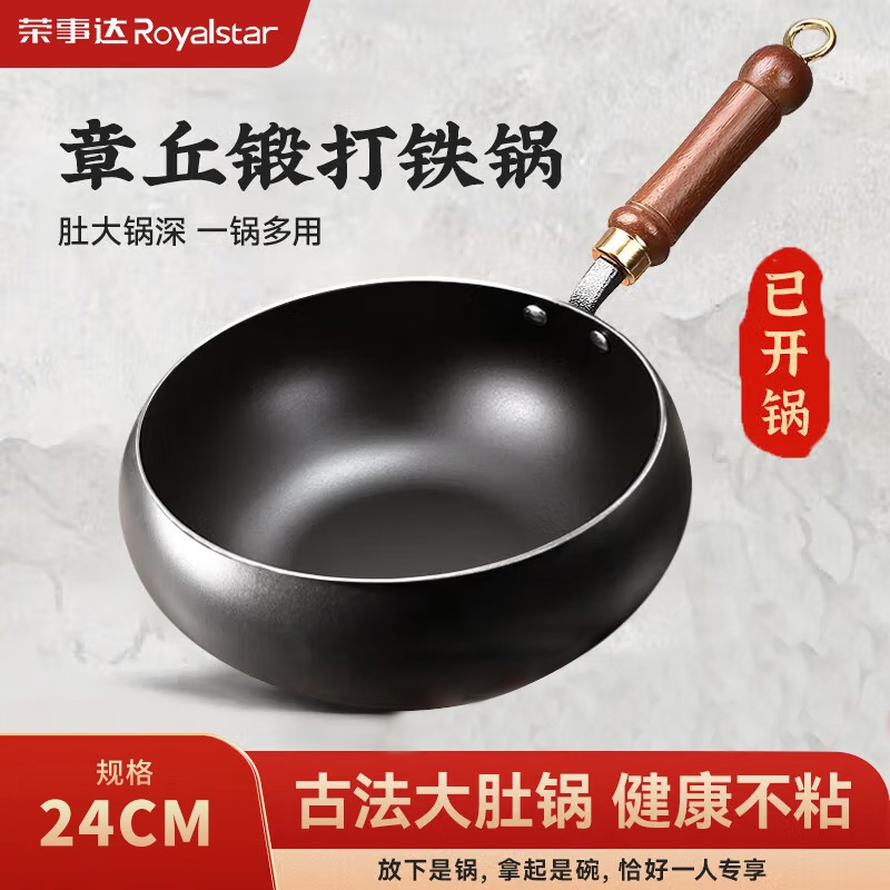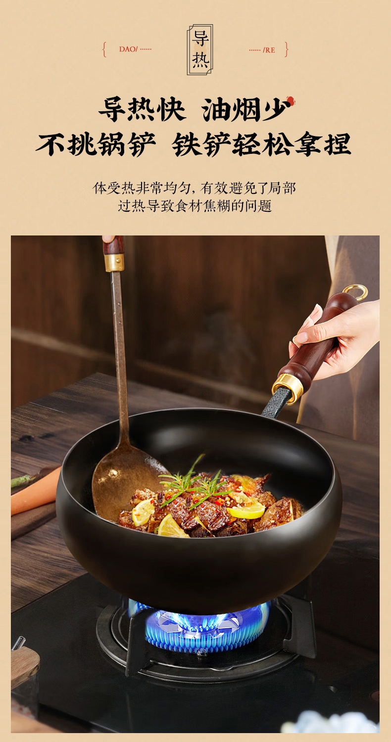 采用国家标准食品接触精铁材质精制而成;不添加任何涂层;锅具适用所有炉具