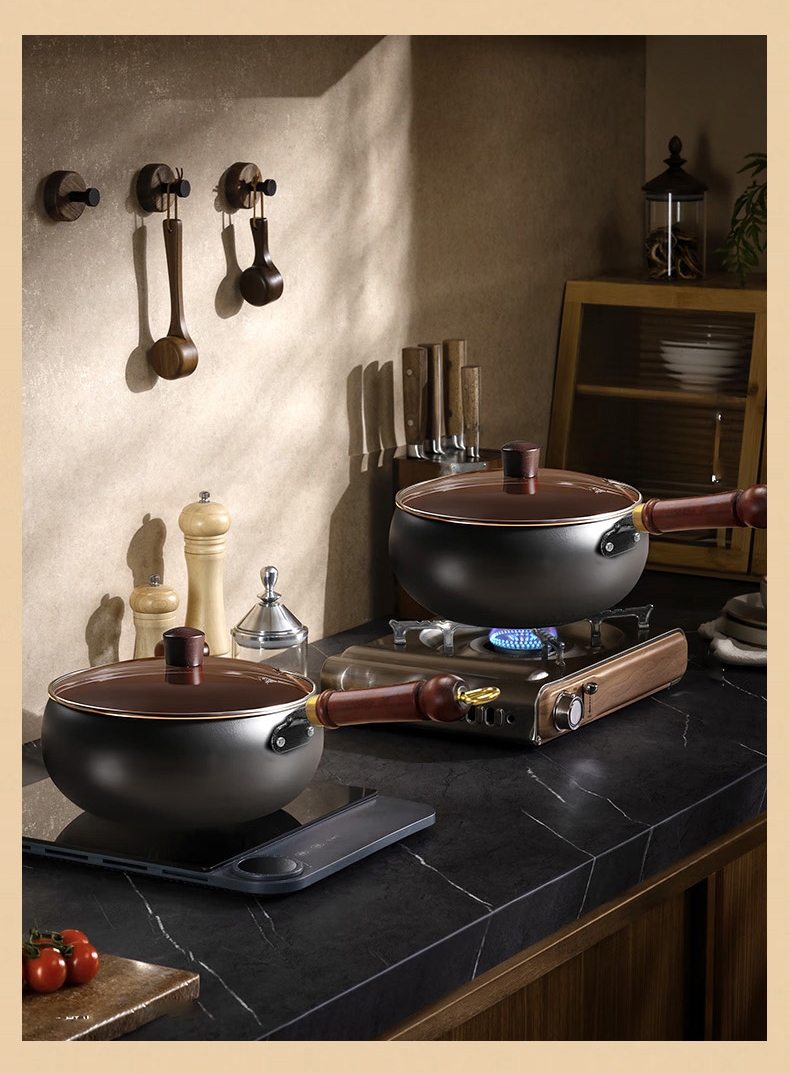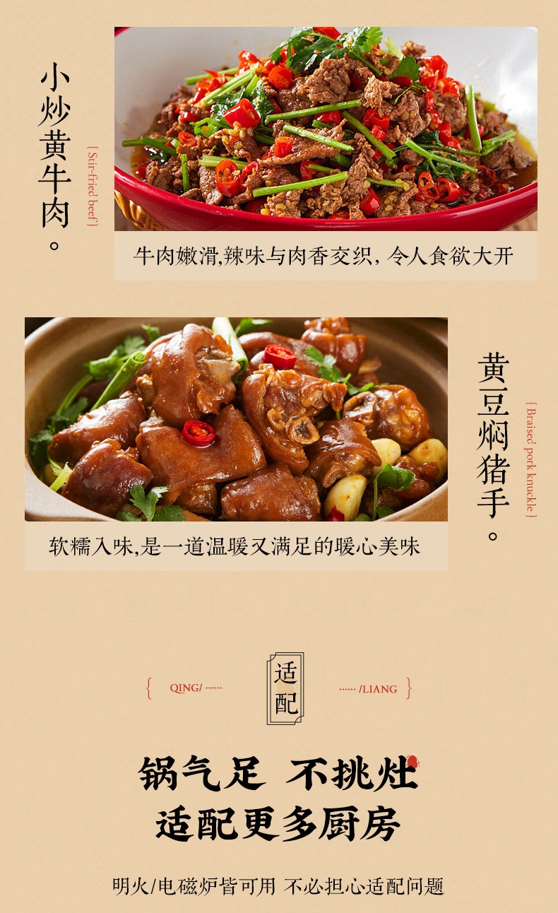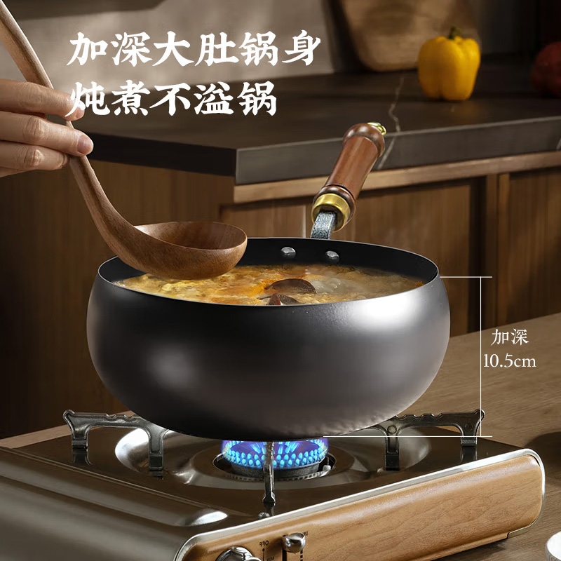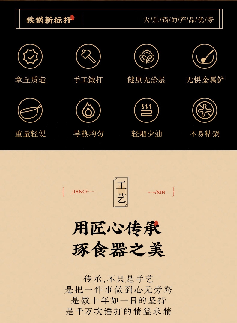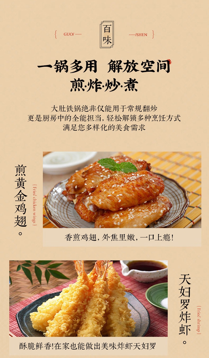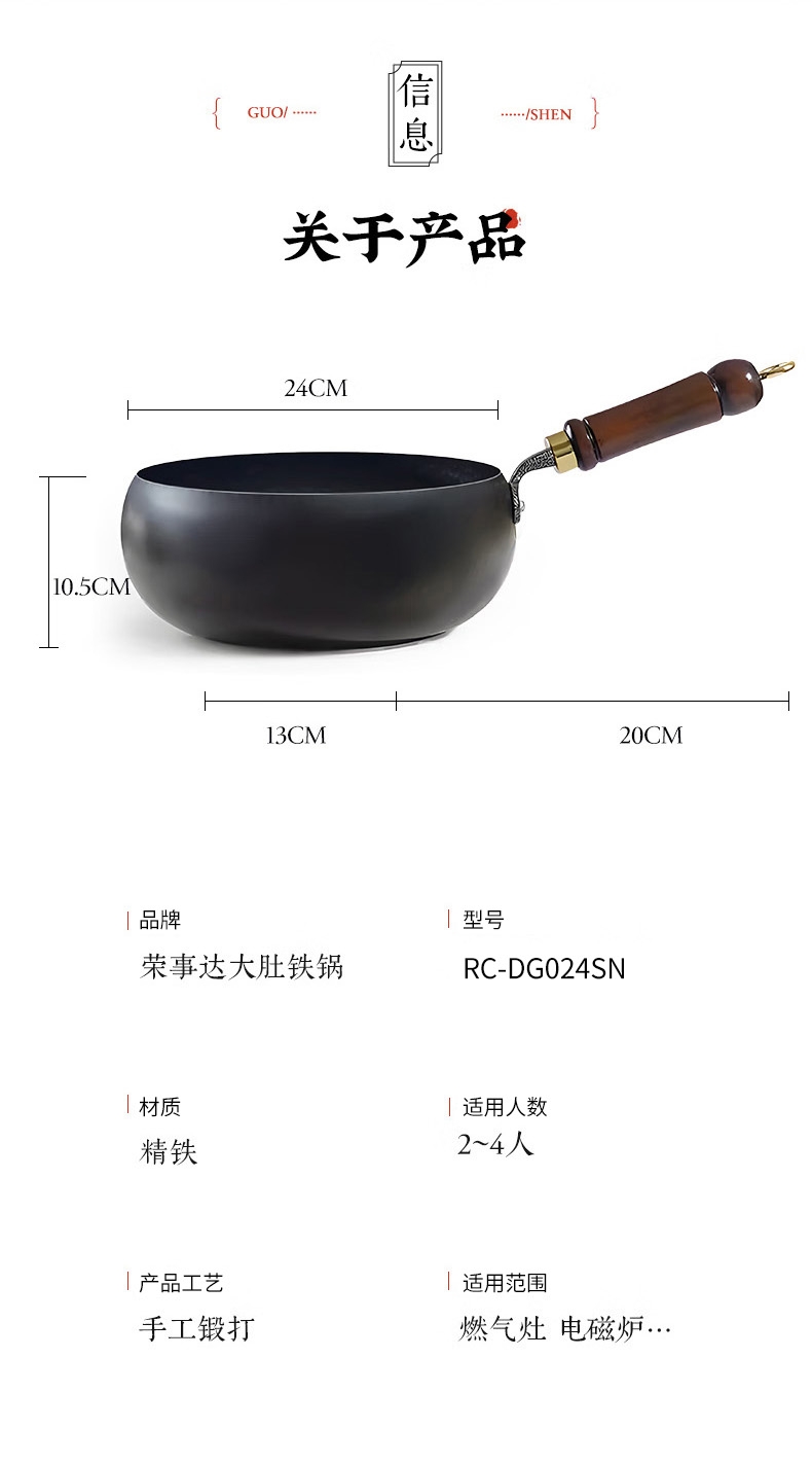 采用国家标准食品接触精铁材质精制而成;不添加任何涂层;锅具适用所有炉具