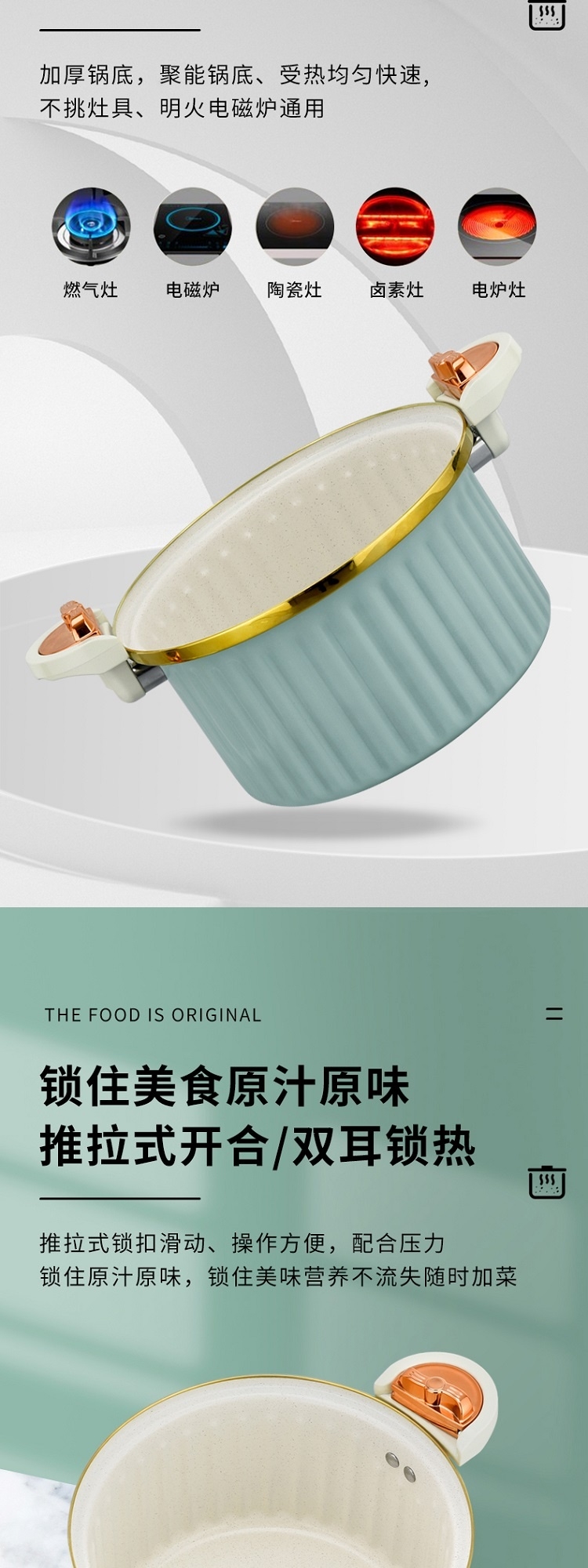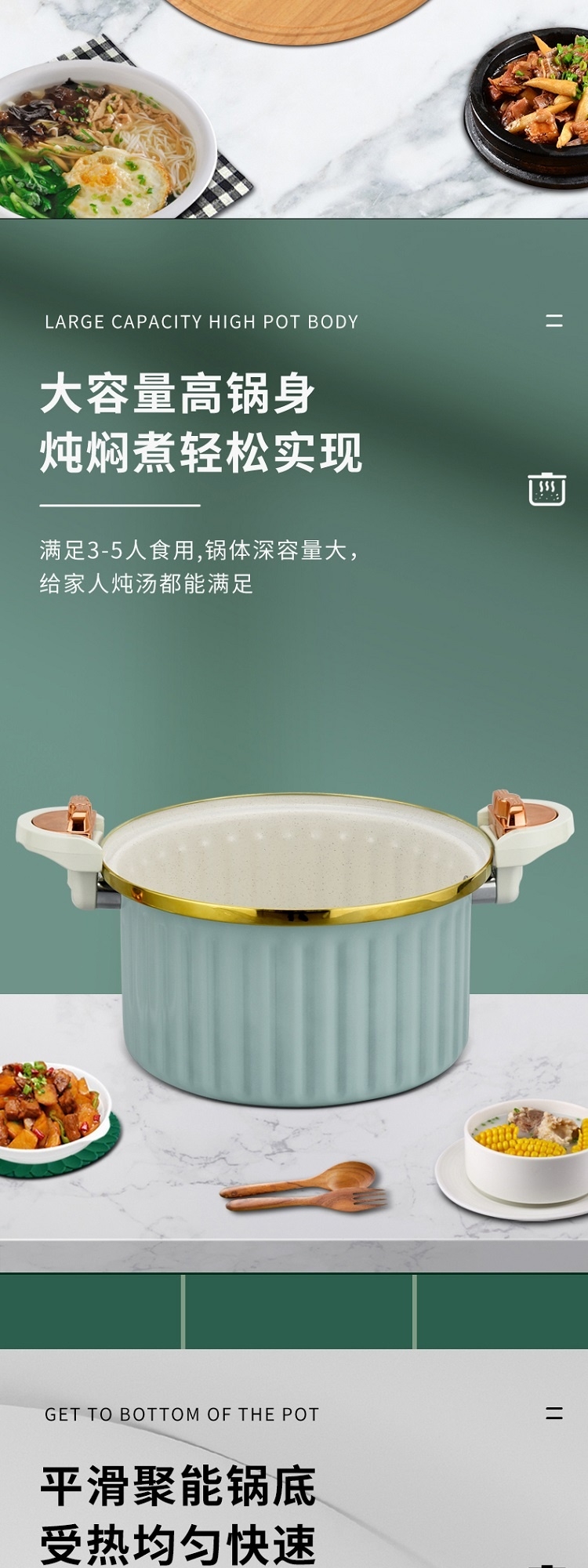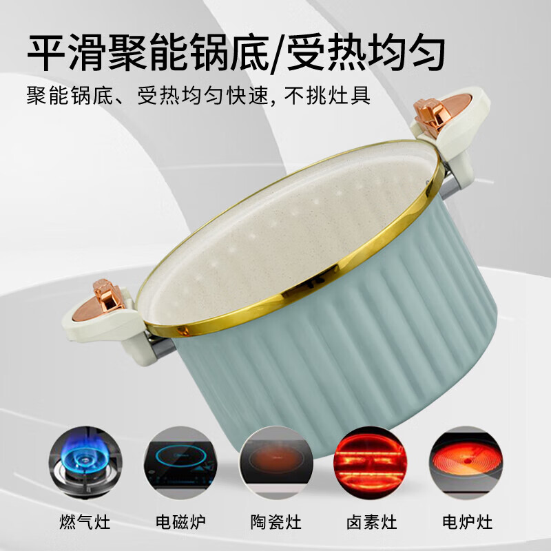 采用国家标准食品接触精铁材质精制而成;内外熔色喷涂工艺,大容量美观大方;微压汤锅均有不粘效果,适用所有炉具