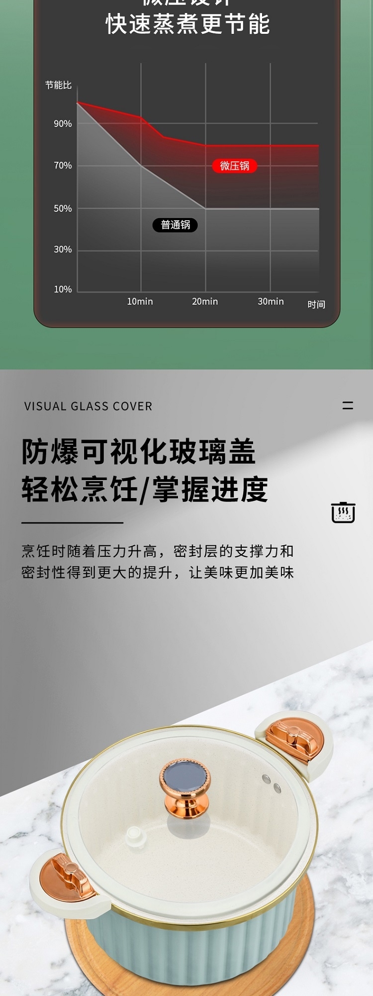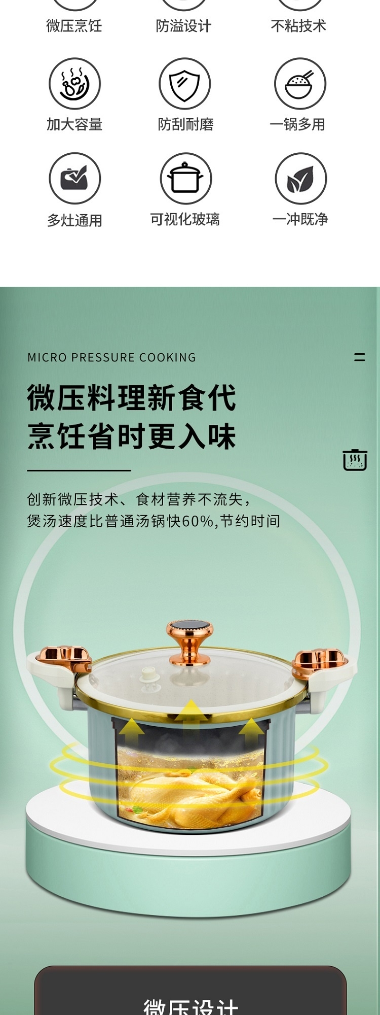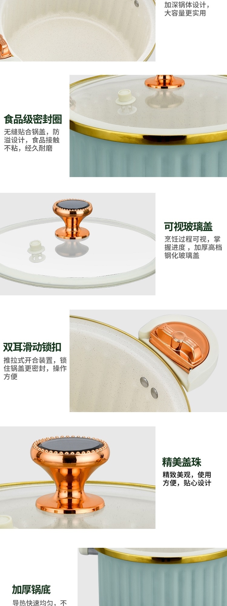 采用国家标准食品接触精铁材质精制而成;内外熔色喷涂工艺,大容量美观大方;微压汤锅均有不粘效果,适用所有炉具